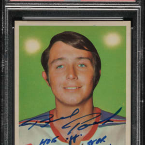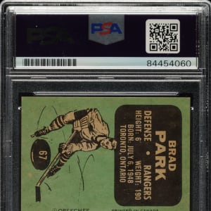 PSA/DNA has encapsulated the card, grading the signature Authentic. New York Rangers Hall of Famer Brad Park.
