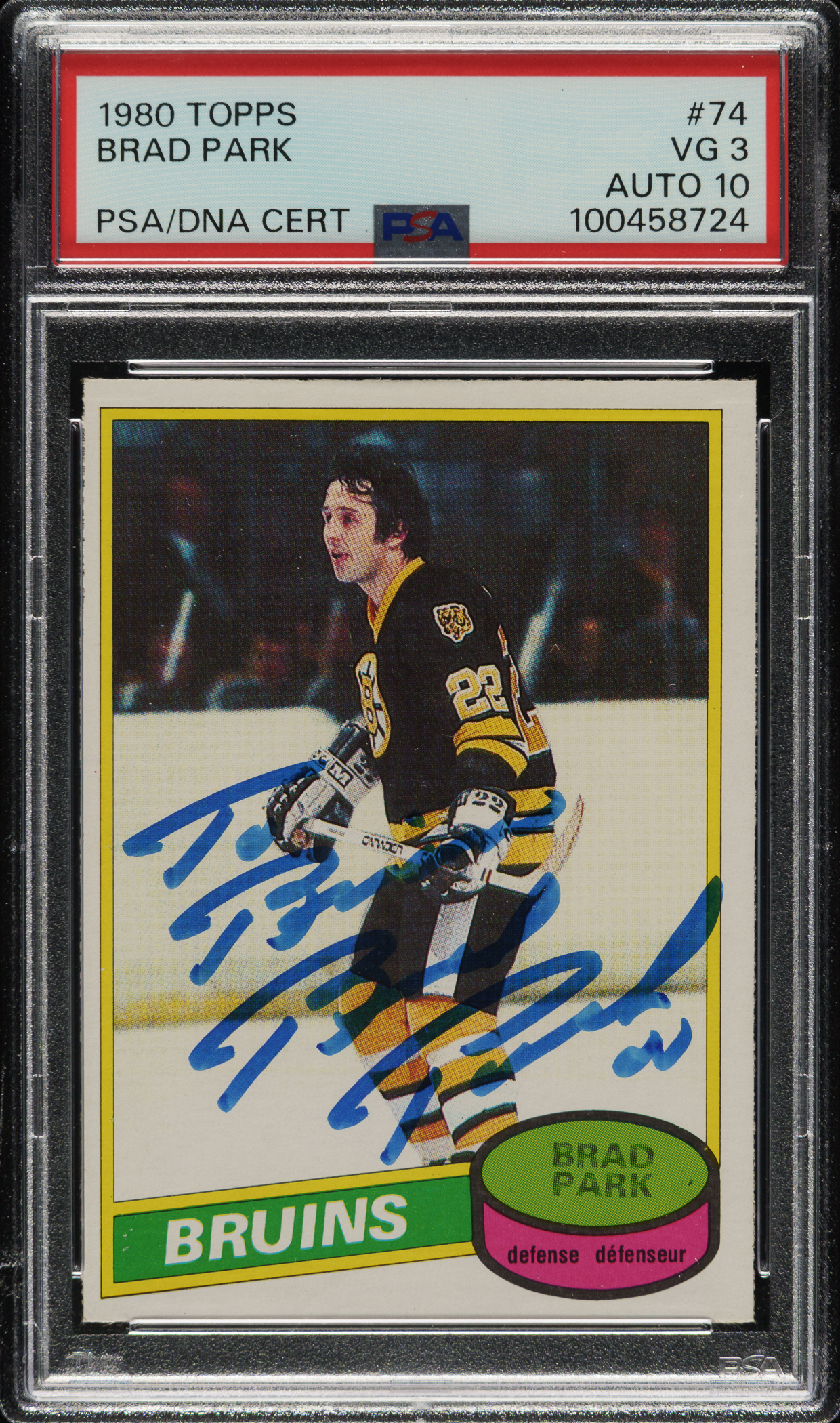 PSA/DNA has encapsulated the card, grading the signature GEM MINT 10 and the card VG 3. Boston Bruins Hall of Famer Brad Park.