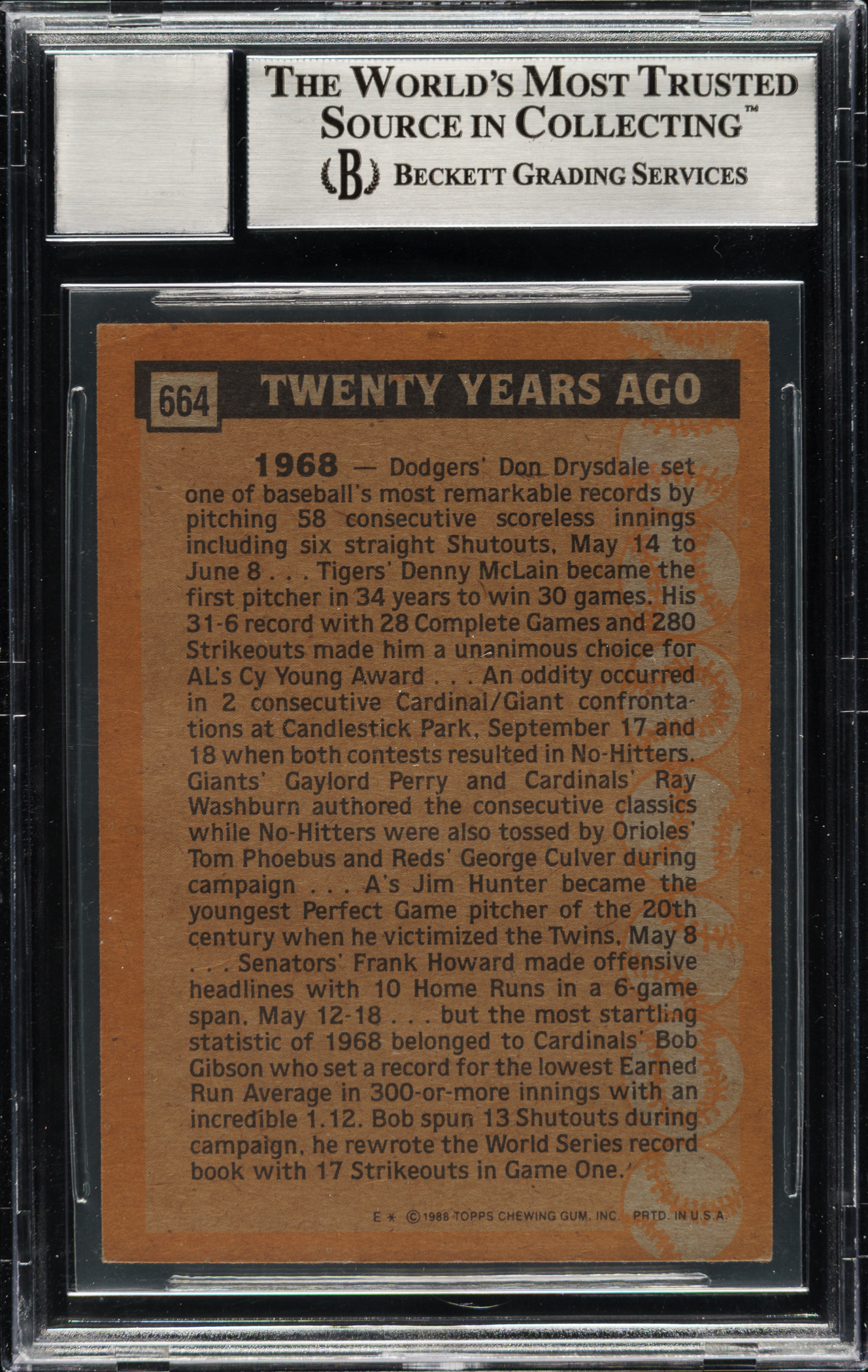 Beckett has encapsulated the card and certified the signature as GEM MINT 10. St. Louis Cardinals Hall of Famer Bob Gibson.