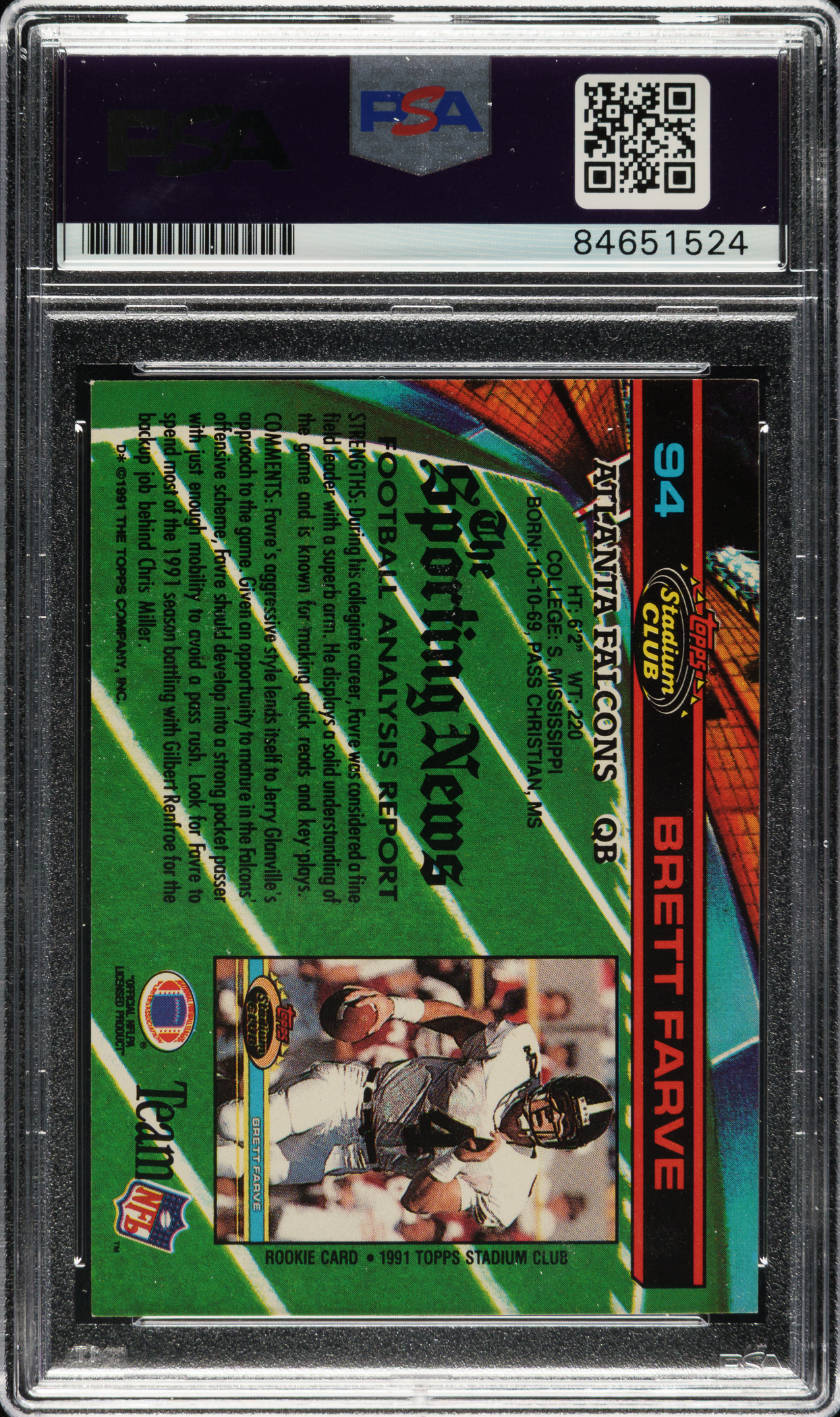 PSA/DNA has encapsulated the card, grading the signature GEM MINT 10. Green Bay Packers Hall of Famer Brett Favre.