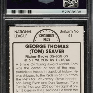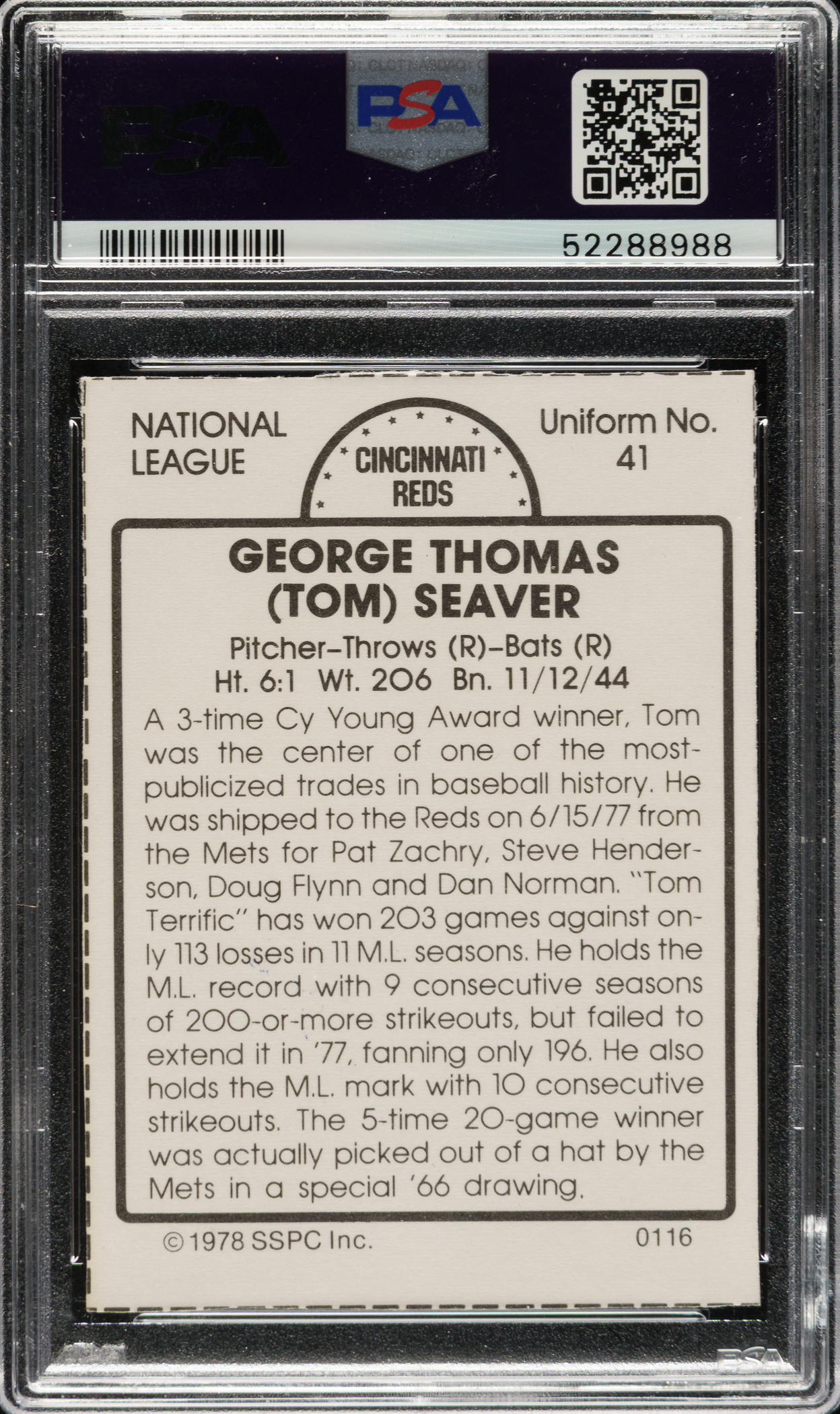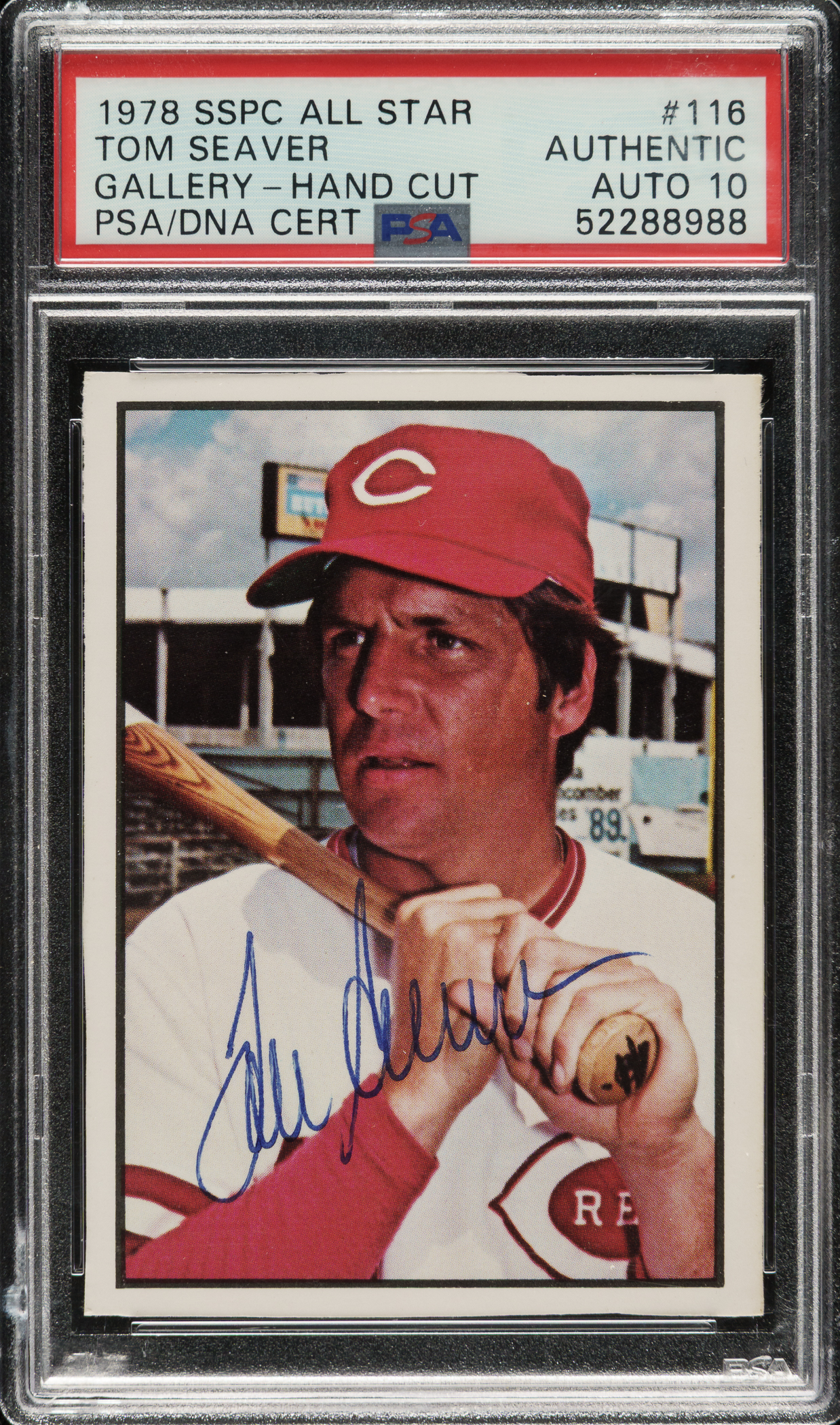 PSA/DNA has encapsulated the card, grading the signature as GEM MINT 10 and certified the card as "Authentic." Cincinnati Reds Hall of Famer Tom Seaver.