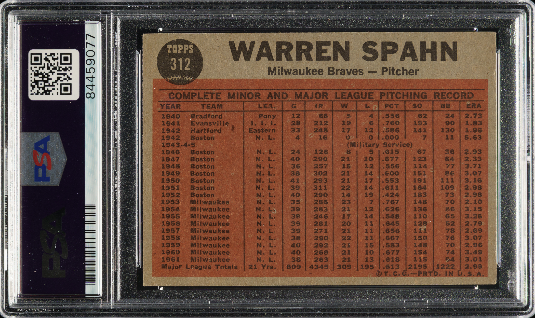 PSA/DNA has encapsulated the card and certified the signature as "Authentic." Milwaukee Braves Hall of Famer Warren Spahn.