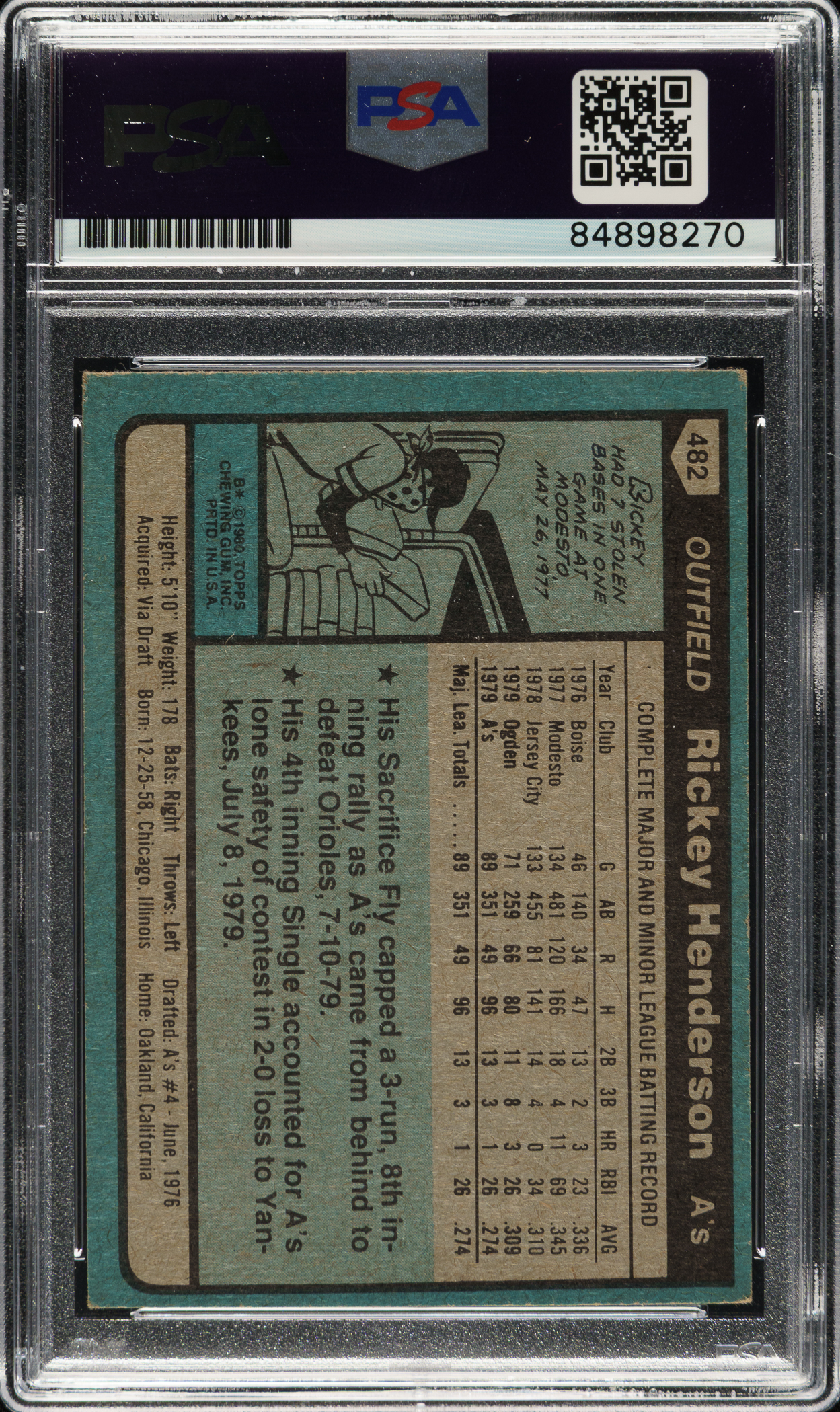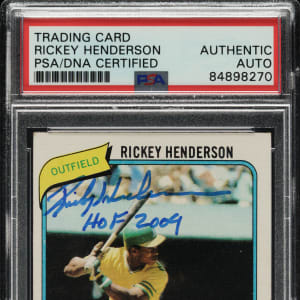 PSA/DNA has encapsulated the card and certified the signature as "Authentic." Oakland Athletics Hall of Famer Rickey Henderson.