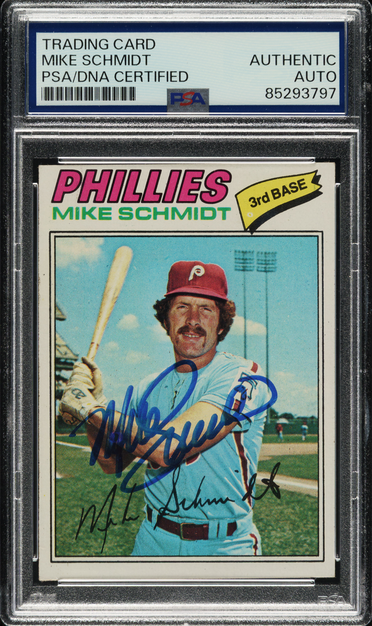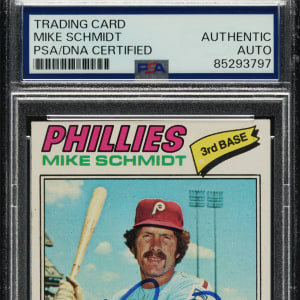 PSA/DNA has encapsulated the card and certified the signature as "Authentic." Philadelphia Phillies Hall of Famer Mike Schmidt.