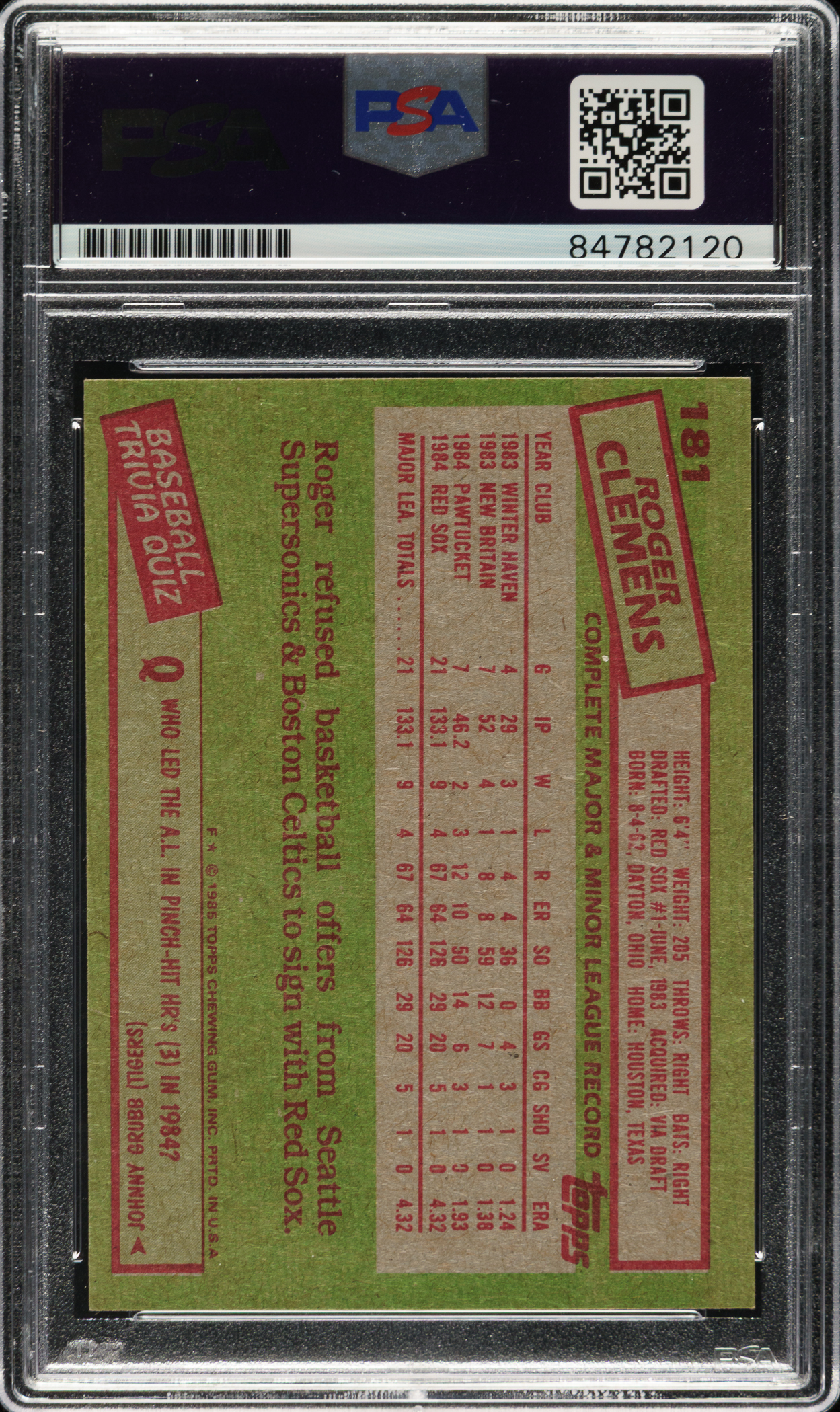 Signed 1985 Topps #181 Roger Clemens Rookie - PSA/DNA