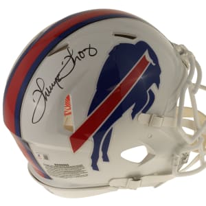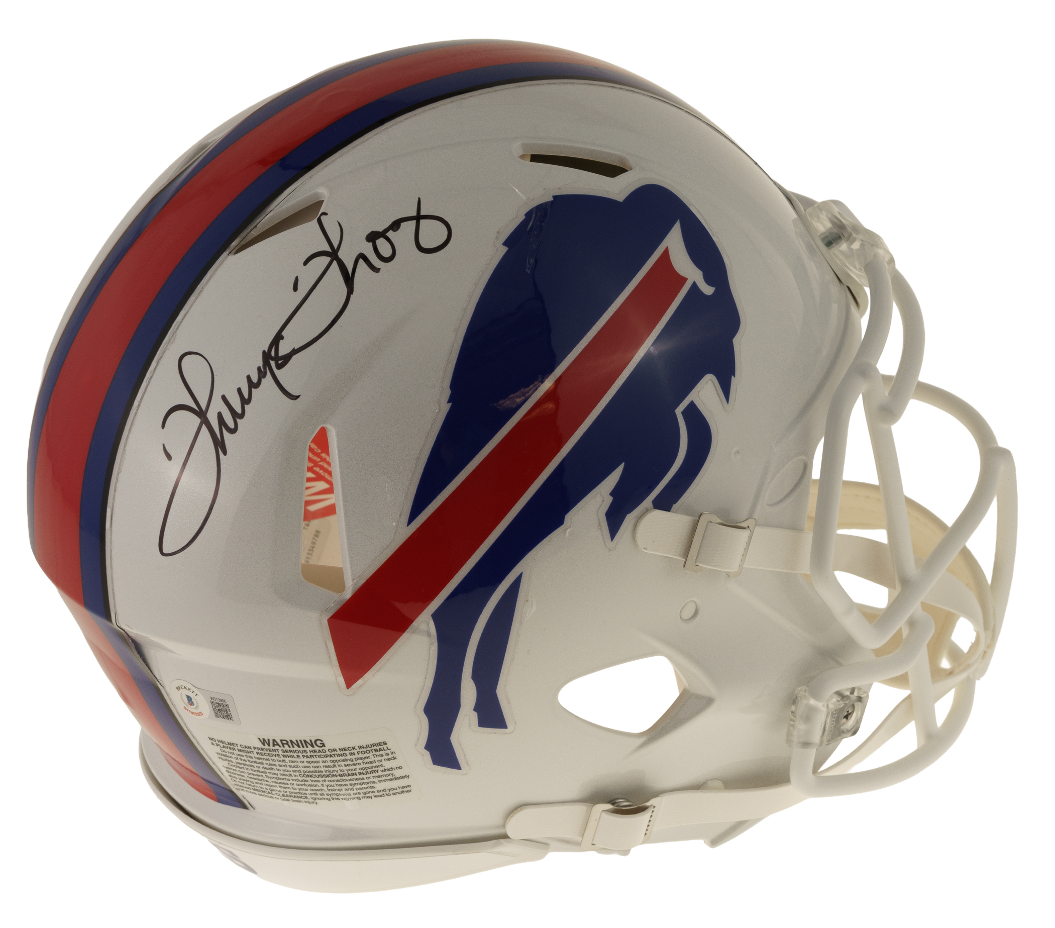 Buffalo Bills Hall of Famer Thurman Thomas signed full-size helmet. Beckett certification sticker is affixed to the jersey. The size/weight of this item requires that there will be an additional shipping charge for this lot.