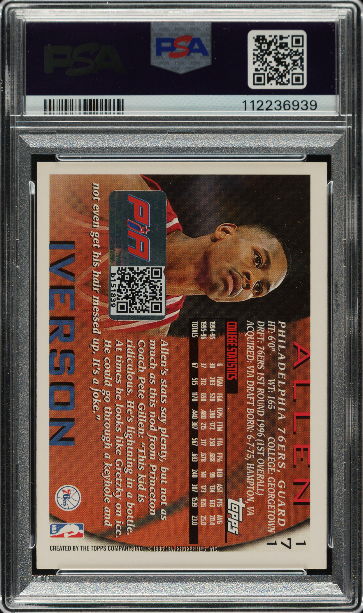 PSA/DNA has encapsulated the card, grading the signature MINT 9 and the card EX 5. Philadelphia 76ers basketball Hall of Famer Allen Iverson.