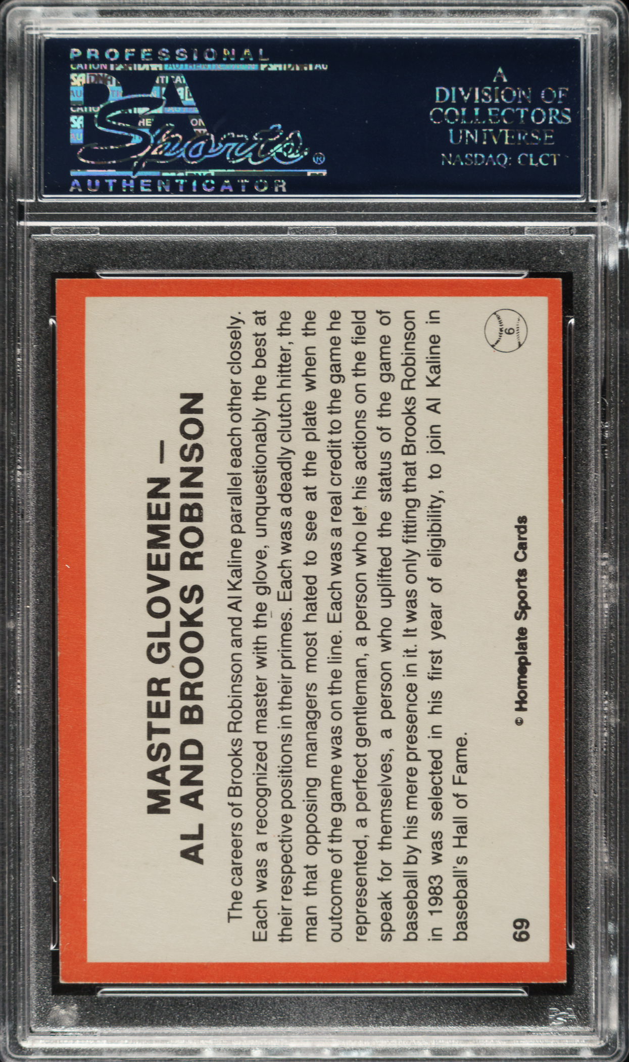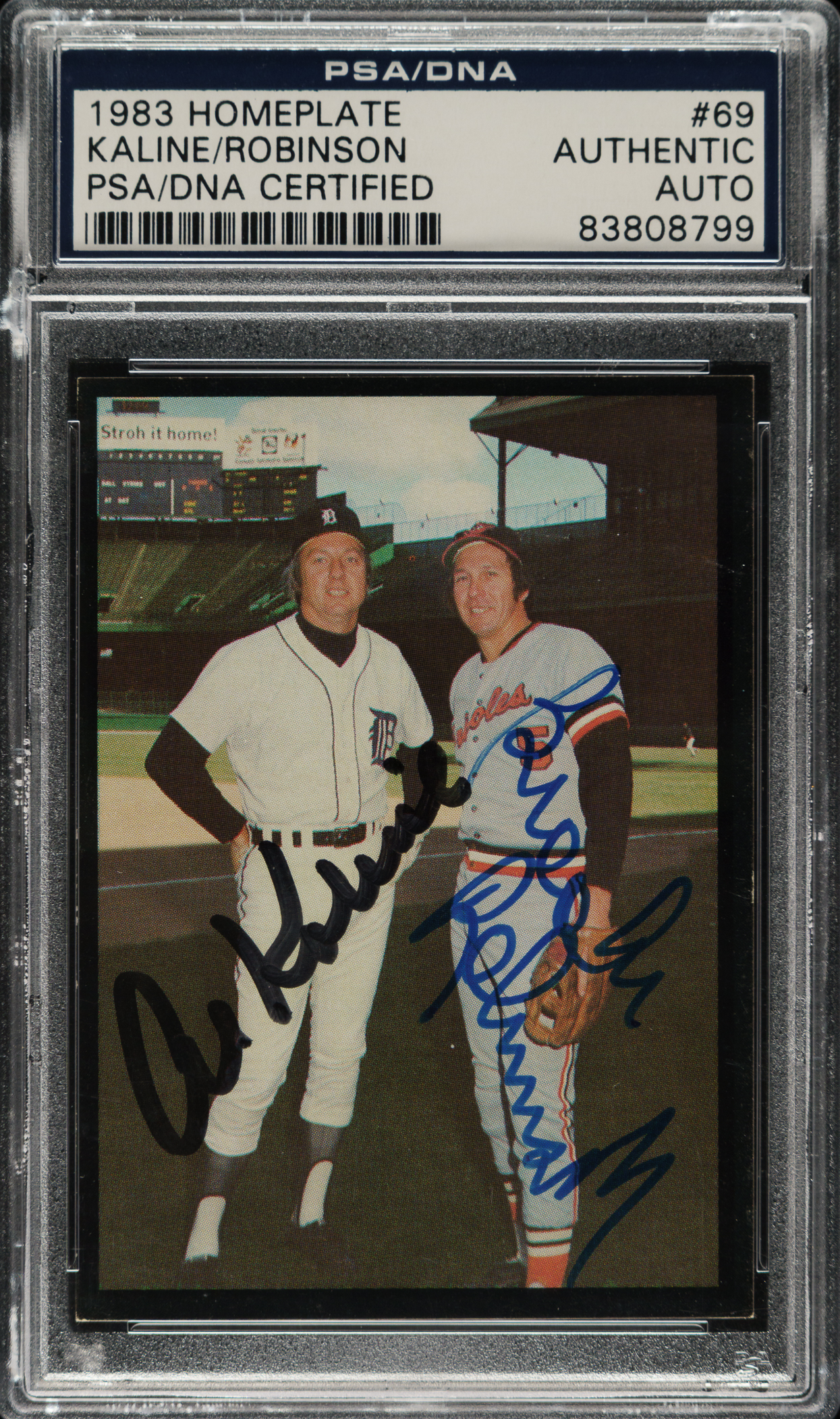 PSA/DNA has encapsulated the card, grading the signature Authentic. Detroit Tigers Hall of Famers Al Kaline and Brooks Robinson.