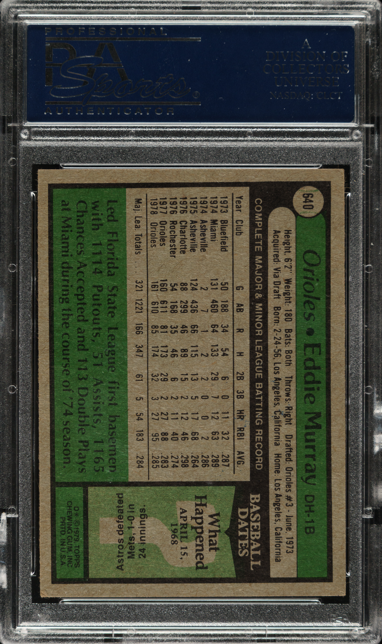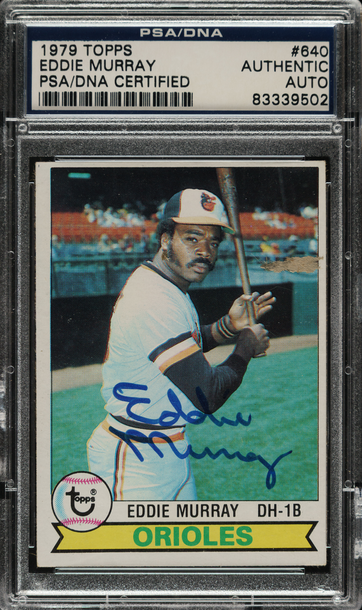 PSA/DNA has encapsulated the card, grading the signature Authentic. Baltimore Orioles Hall of Famer Eddie Murray.