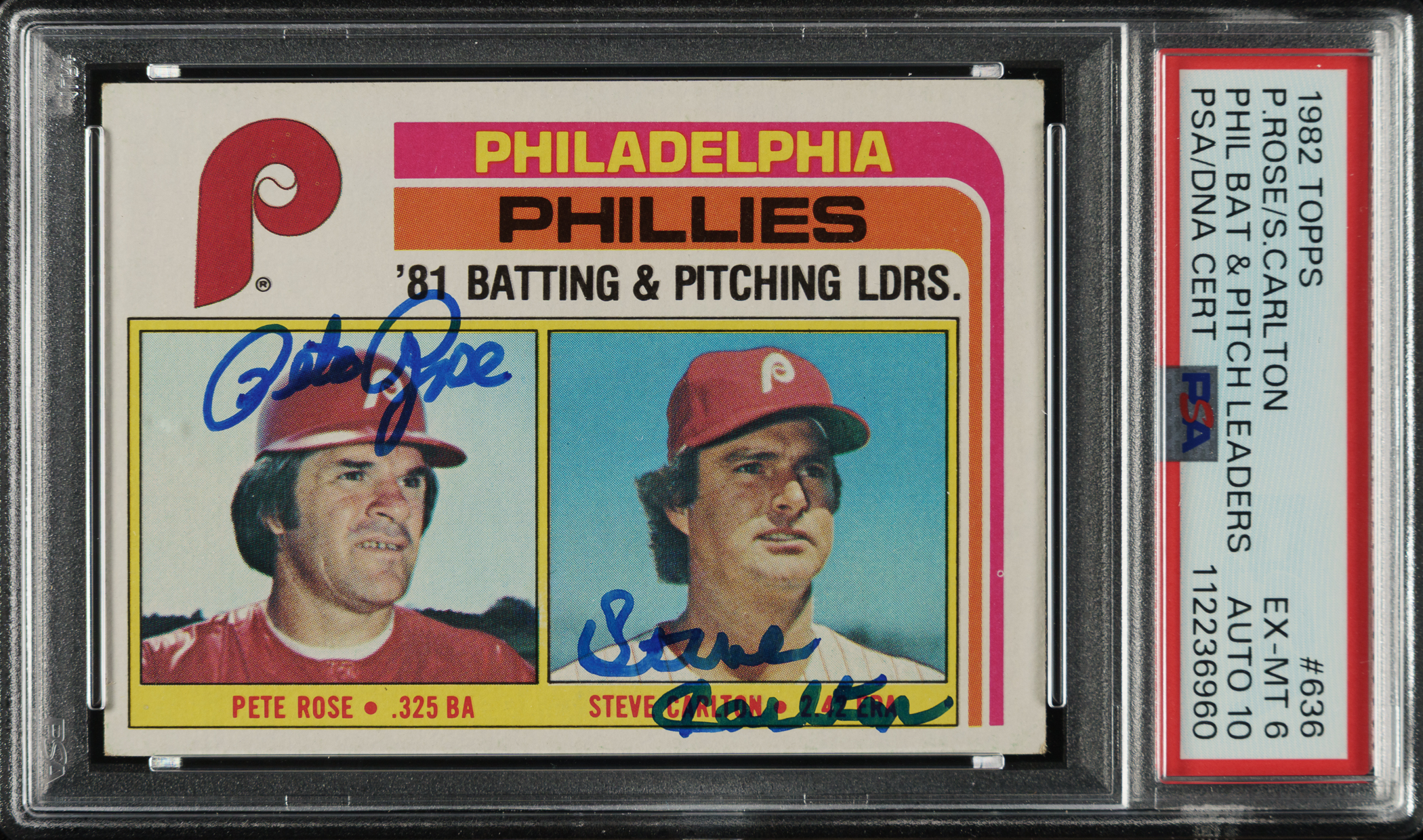 PSA/DNA has encapsulated the card, grading the signatures GEM MINT 10 and the card EX-MT 6. Philadelphia Phillies and Cincinnati Reds Hall of Famer and Star Steve Carlton and Pete Rose.