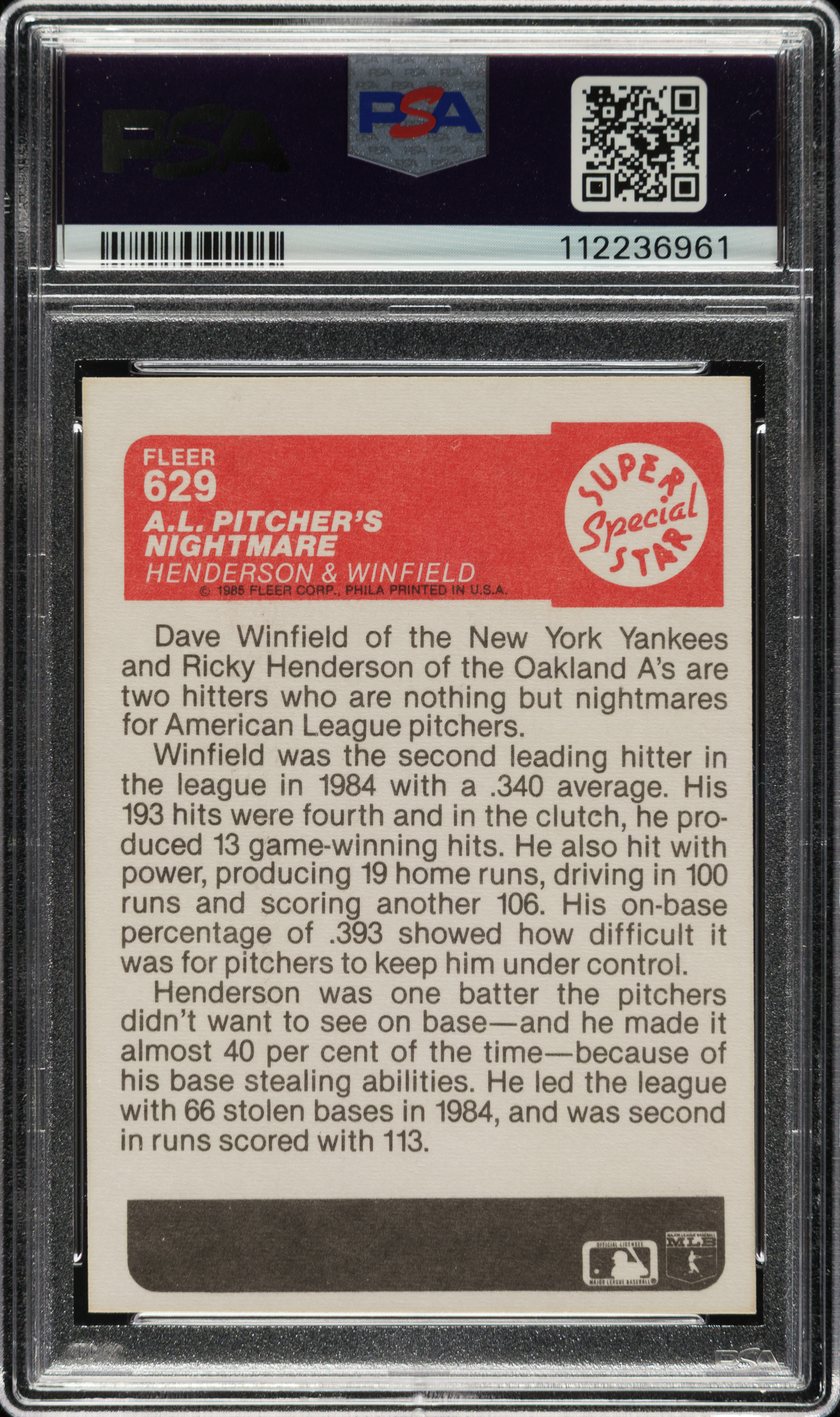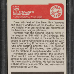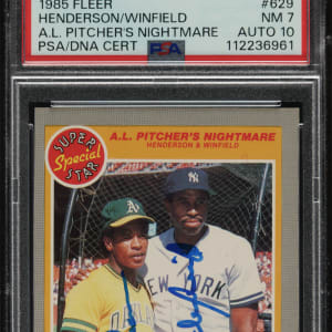 PSA/DNA has encapsulated the card, grading the signatures GEM MINT 10 and the card NM 7. Oakland Athletics and New York Yankees Hall of Famer Rickey Henderson and Dave Winfield.