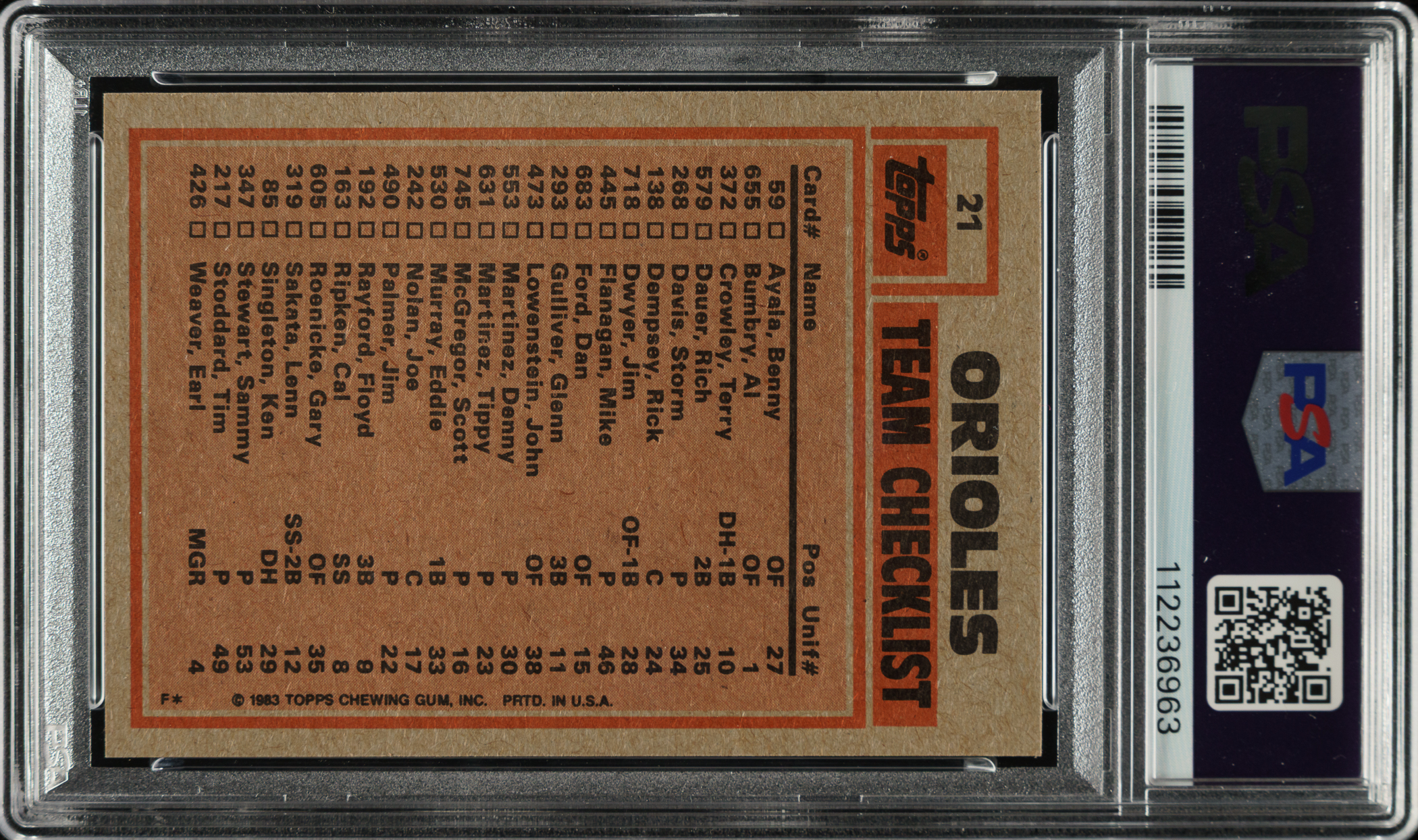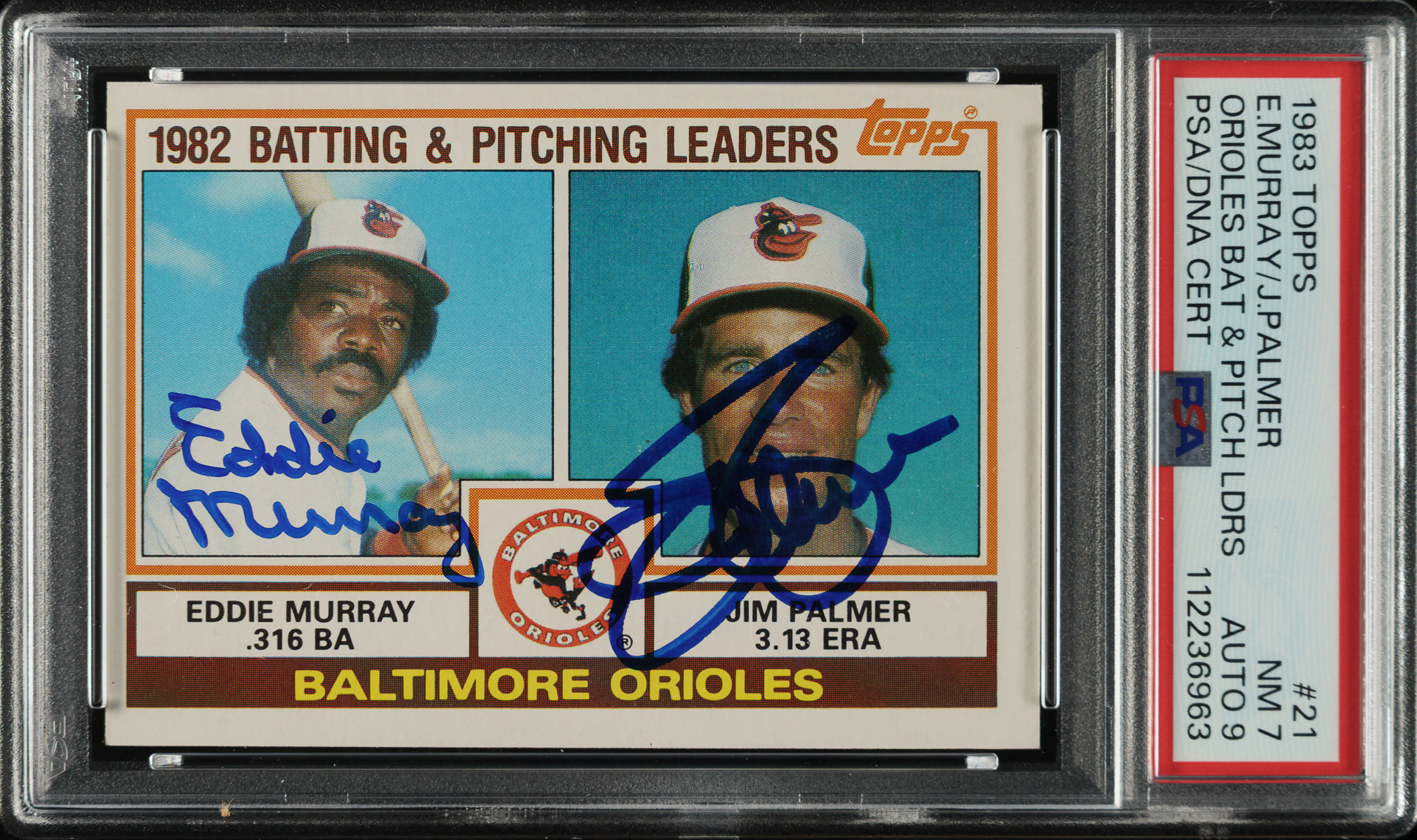 PSA/DNA has encapsulated the card, grading the signatures MINT 9 and the card NM 7. Baltimore Orioles Hall of Famers Eddie Murray and Jim Palmer.