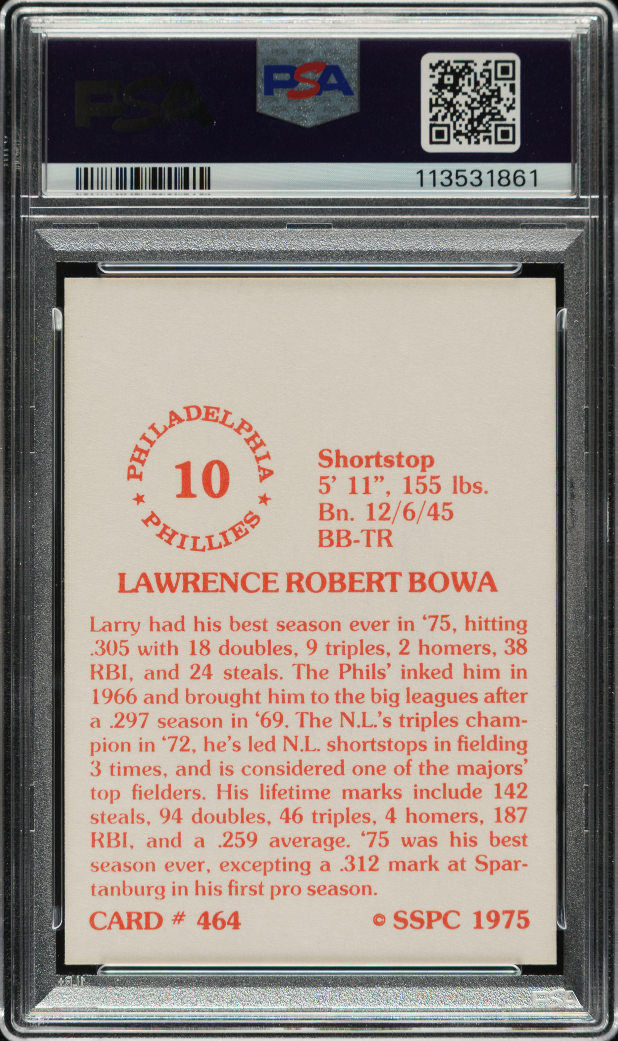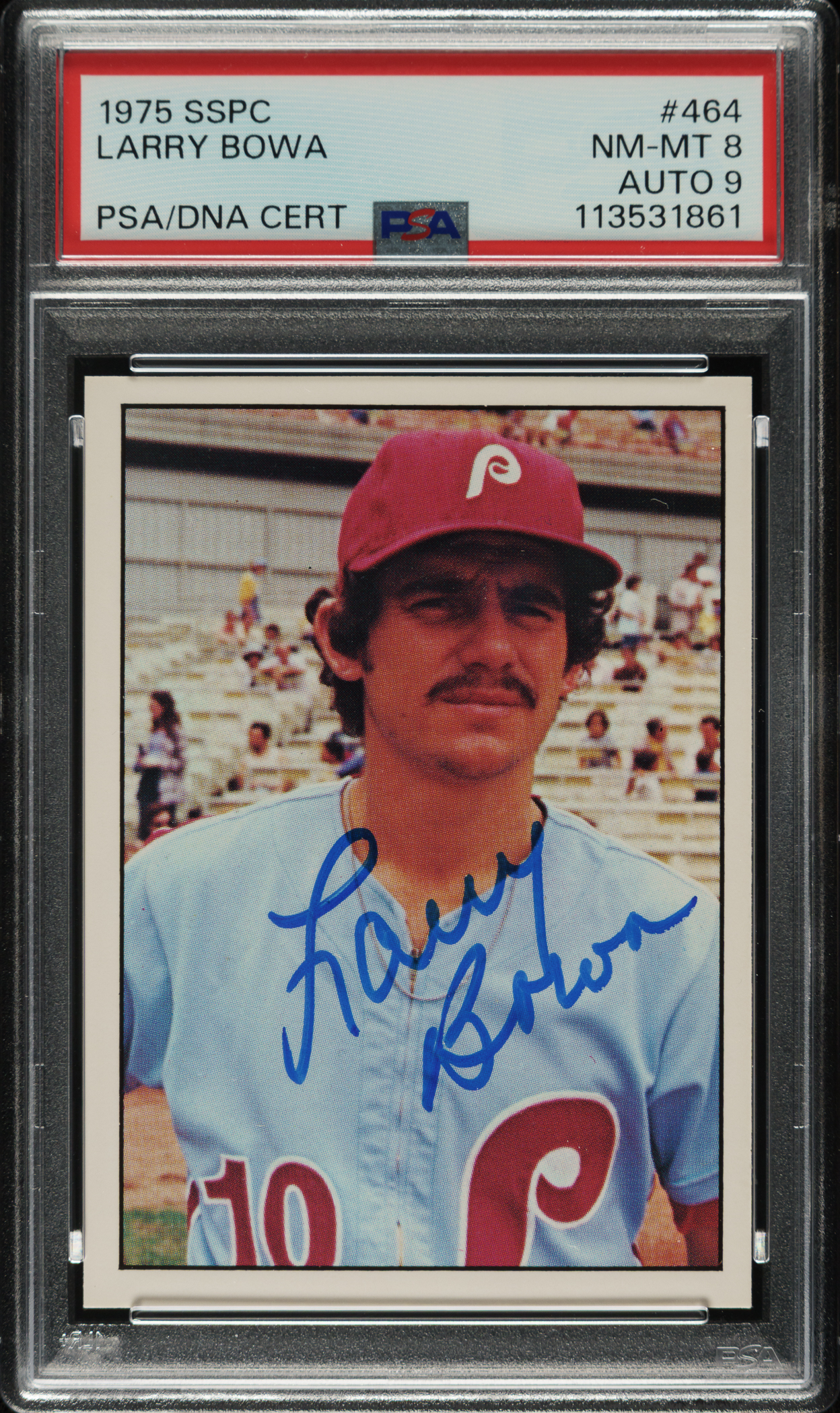 PSA/DNA has encapsulated the card, grading the signature MINT 9 and the card NM-MT 8. Philadelphia Phillies.