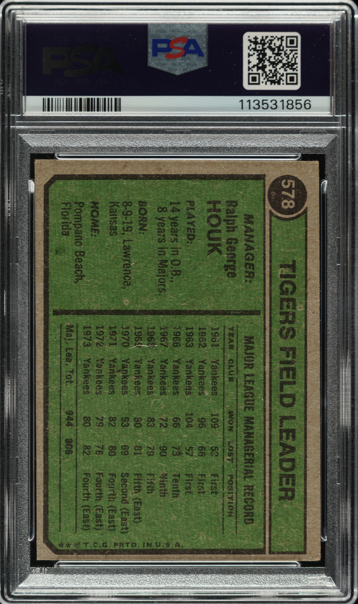 PSA/DNA has encapsulated the card, grading the signature GEM MINT 10 and the card VG-EX 4. Detroit Tigers.