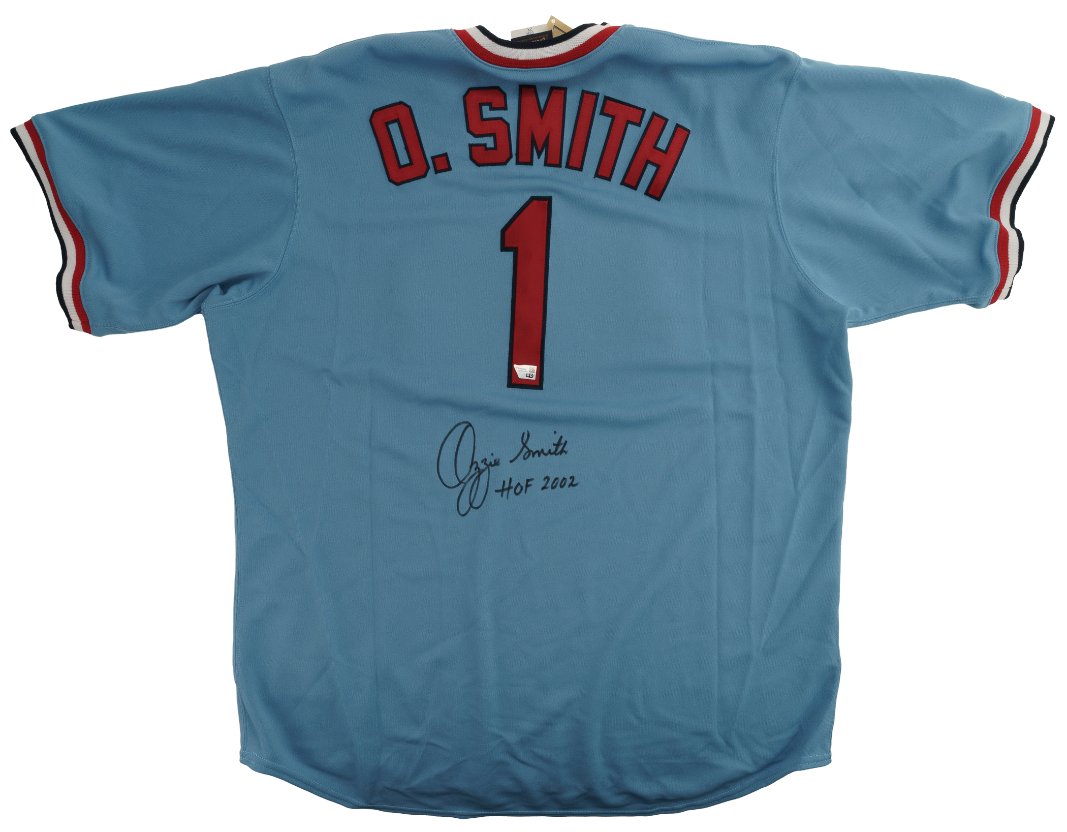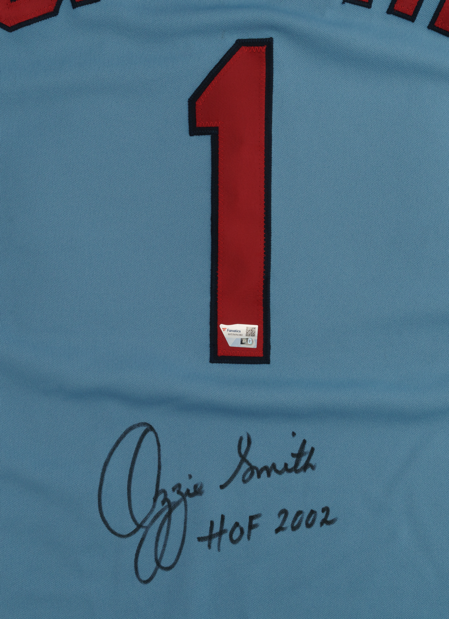 St. Louis Cardinals Hall of Famer Ozzie Smith signed jersey. Fanatics certification sticker is affixed to the jersey.