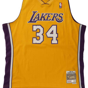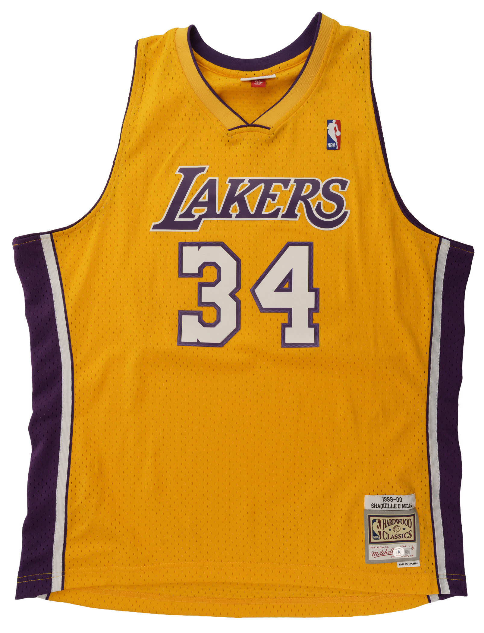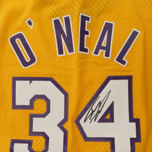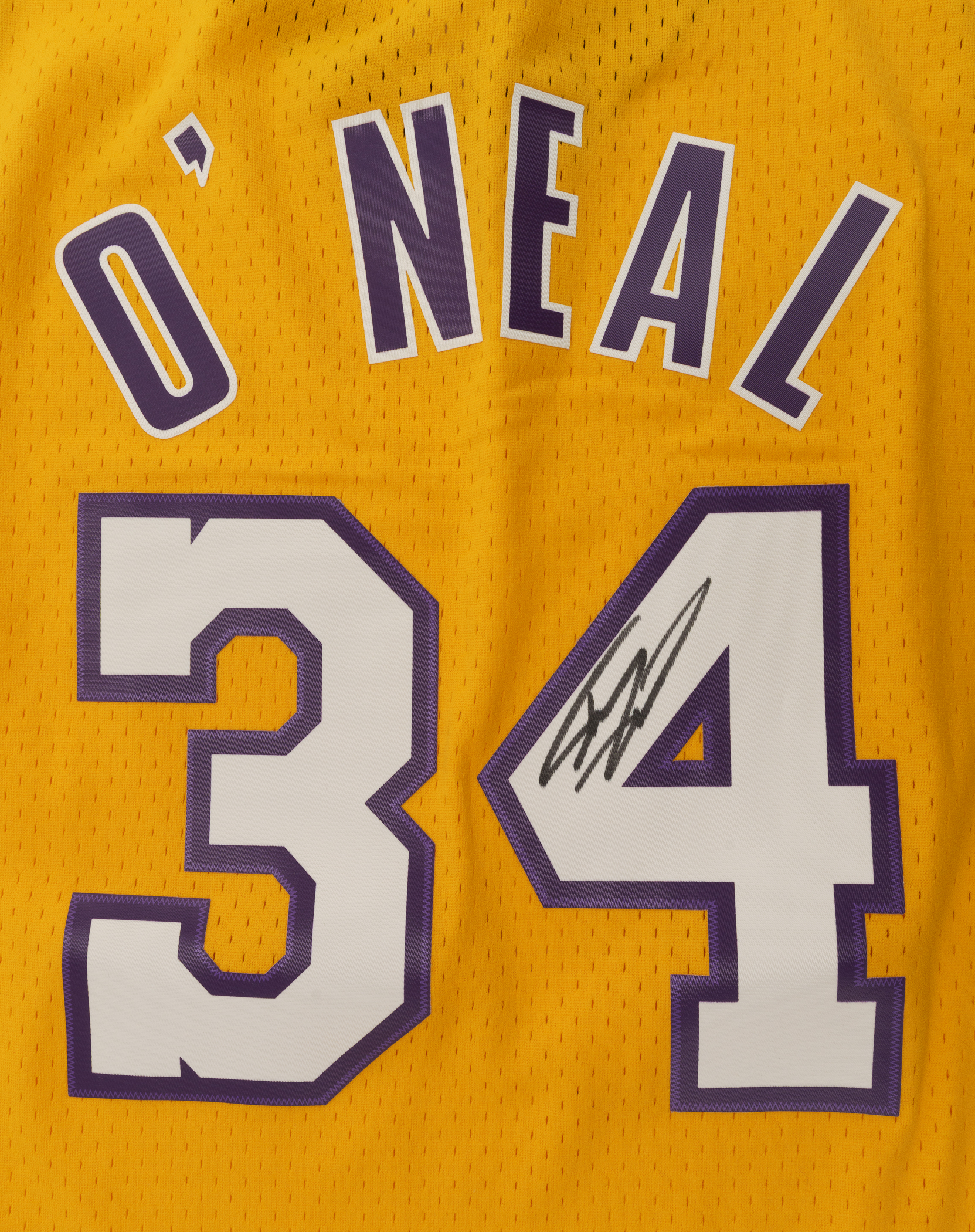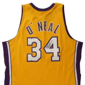 Los Angeles Lakers basketball Hall of Famer Shaquille O'Neal signed jersey. Beckett certification sticker is affixed to the jersey.
