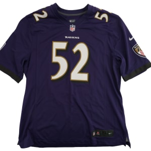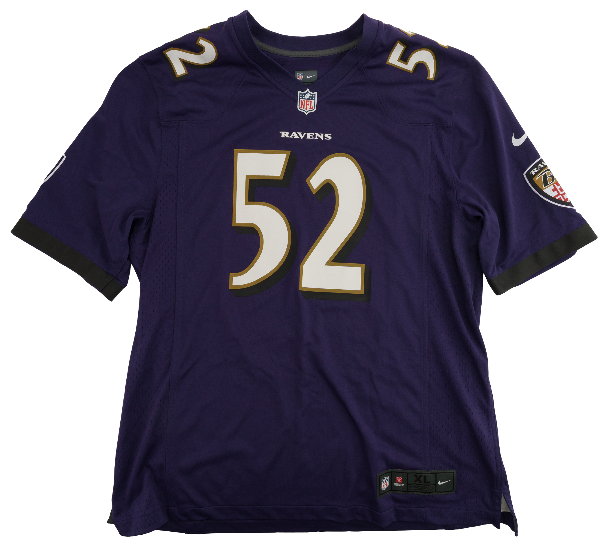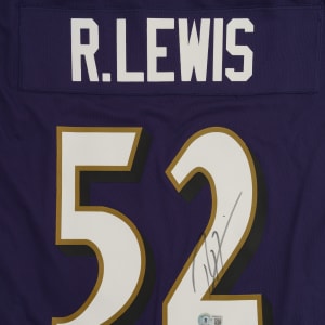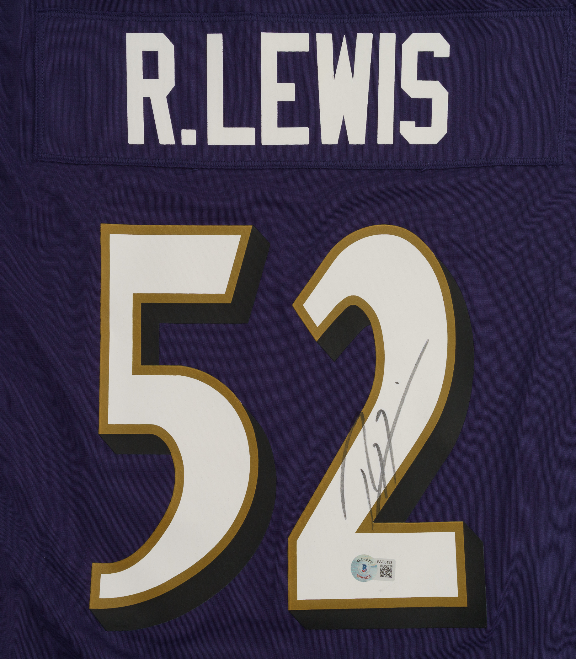 Baltimore Ravens football Hall of Famer Ray Lewis signed jersey. Beckett certification sticker is affixed to the jersey.