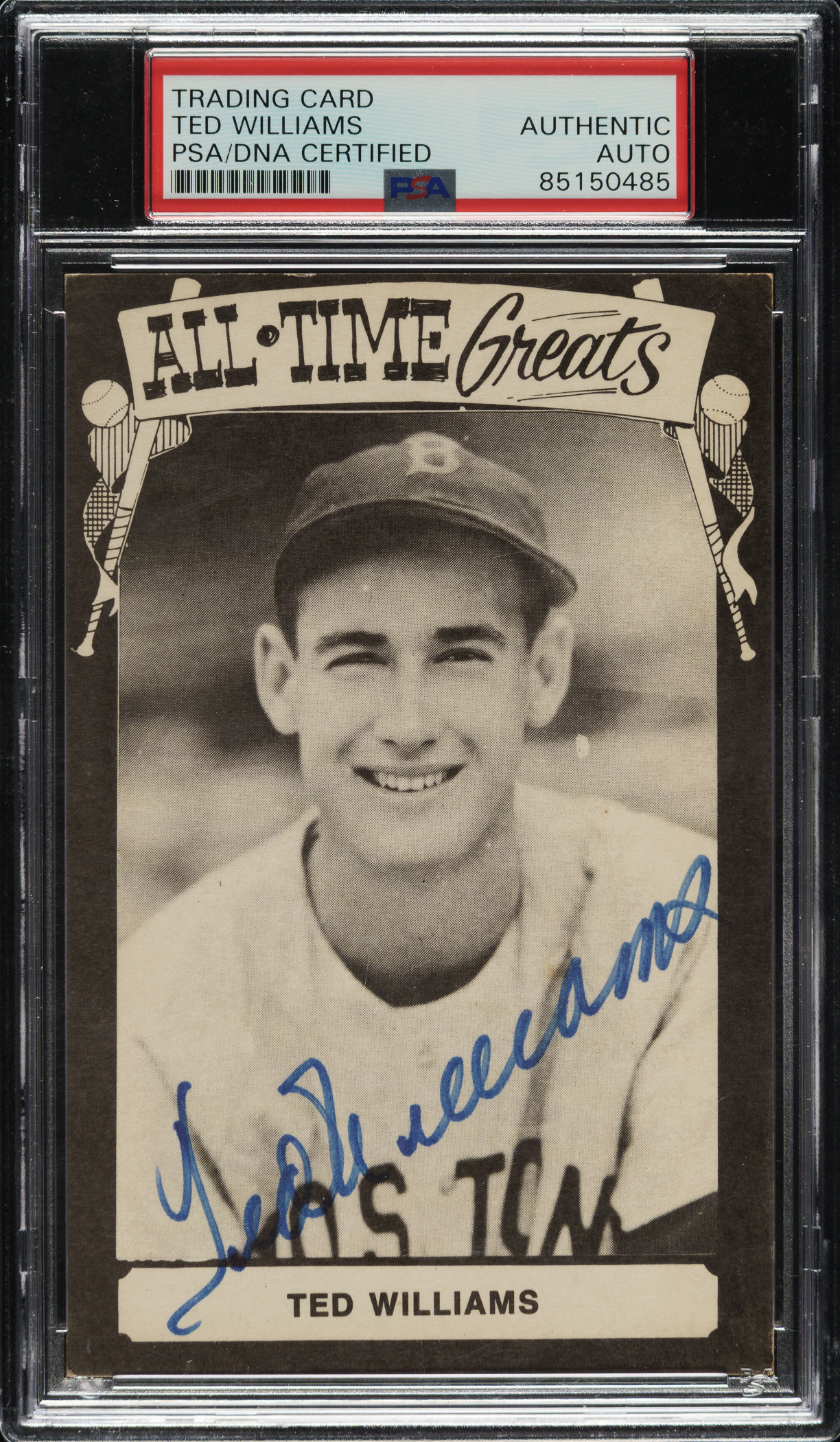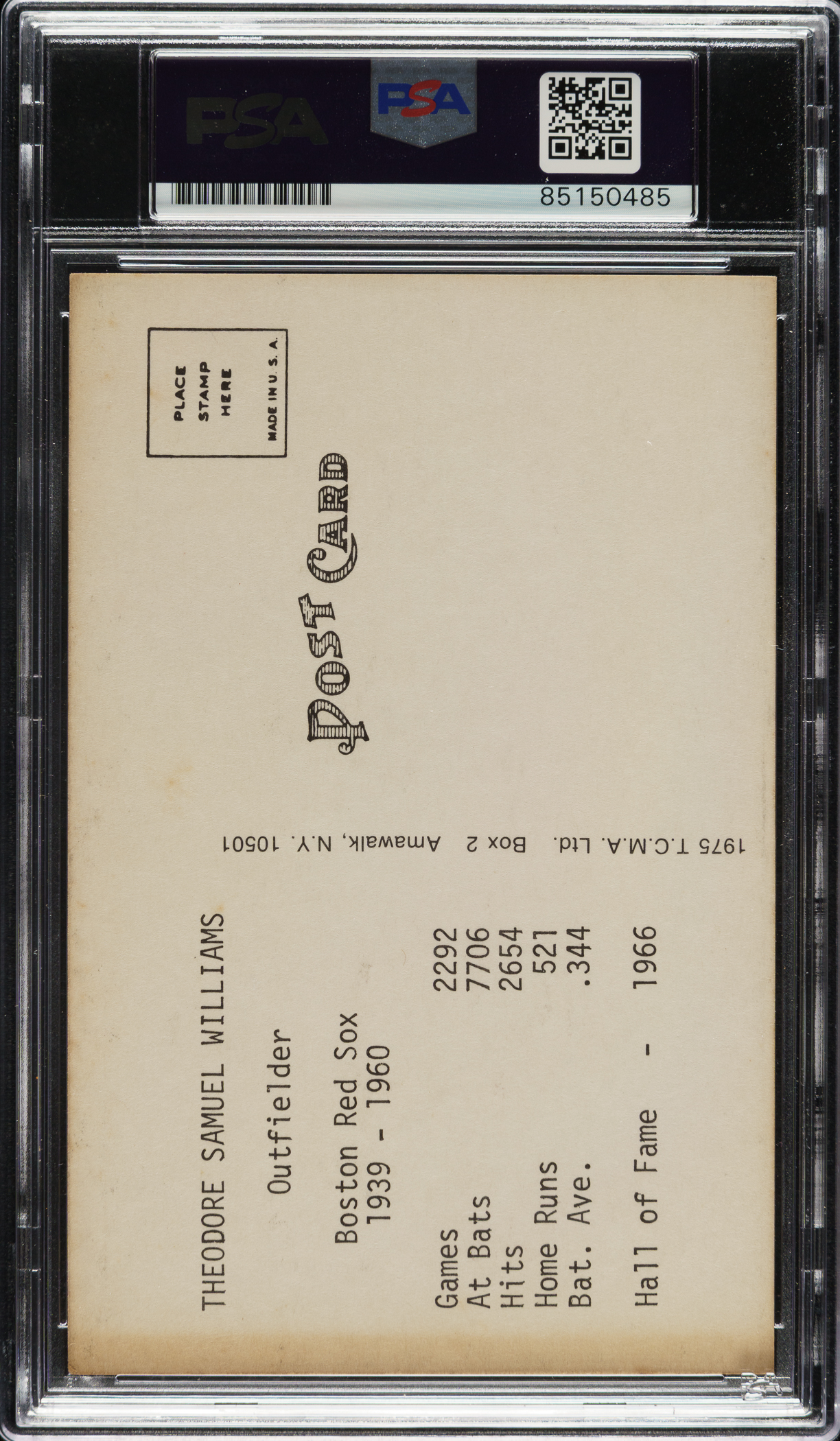 PSA/DNA has encapsulated the postcard, grading the signature Authentic. Boston Red Sox Hall of Famer Ted Williams.