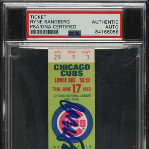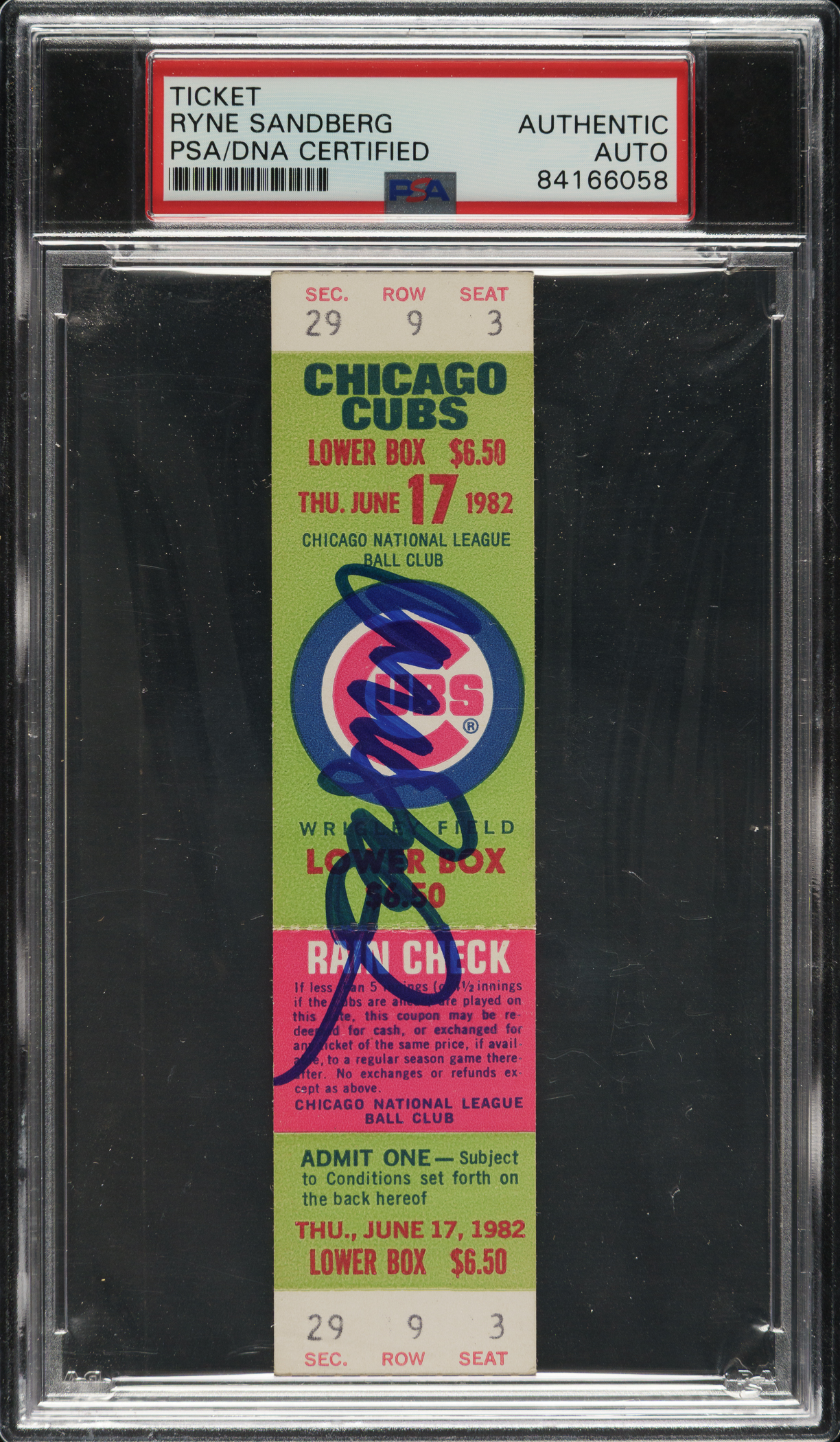 PSA/DNA has encapsulated the ticket, grading the signature Authentic. Chicago Cubs Hall of Famer Ryne Sandberg.