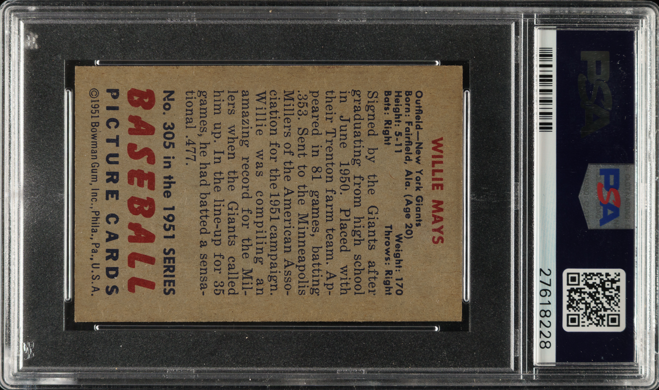1951 Bowman #305 Willie Mays Rookie PSA EX-MT 6