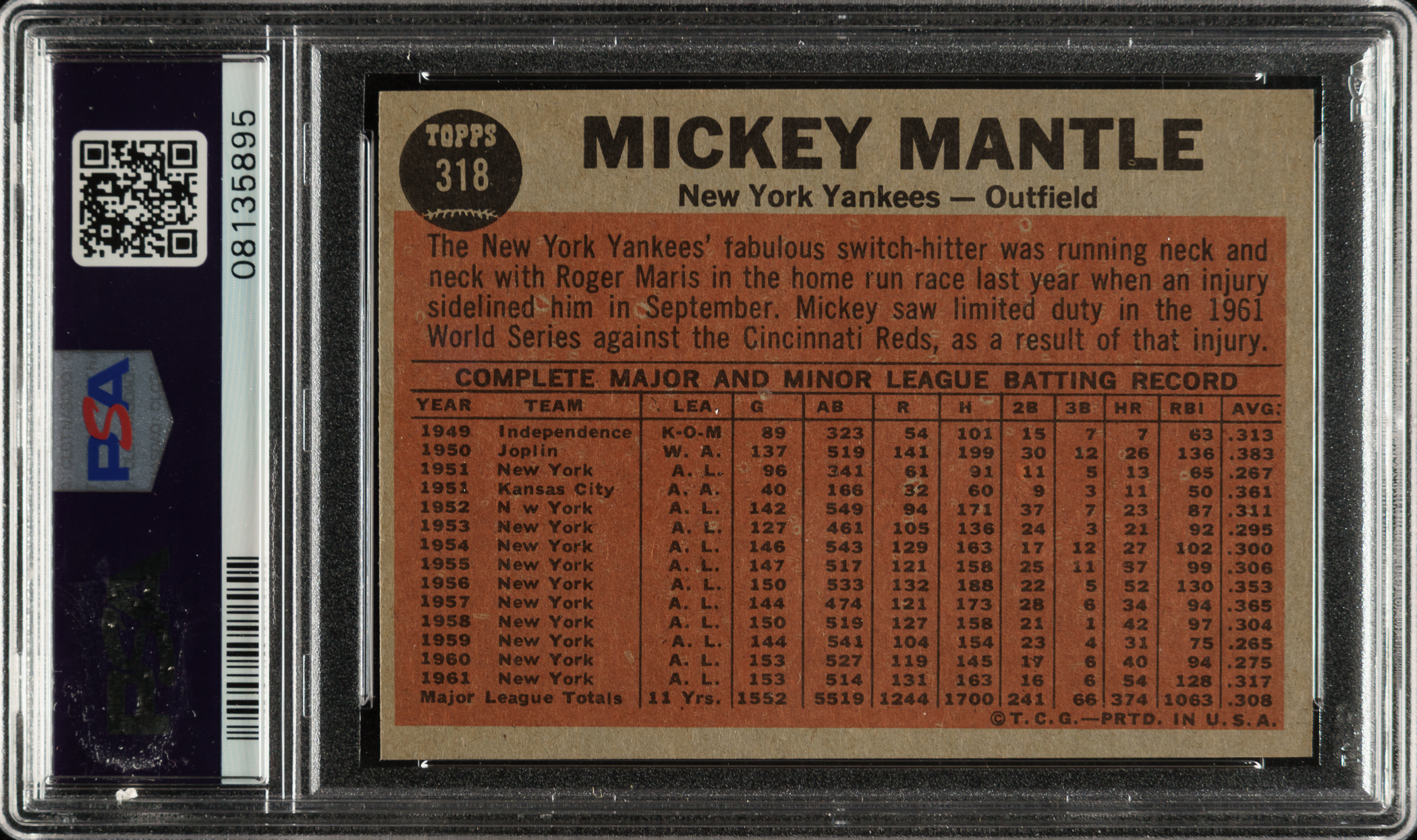 1962 Topps #318 The Switch Hitter Connects with Mickey Mantle PSA MINT 9