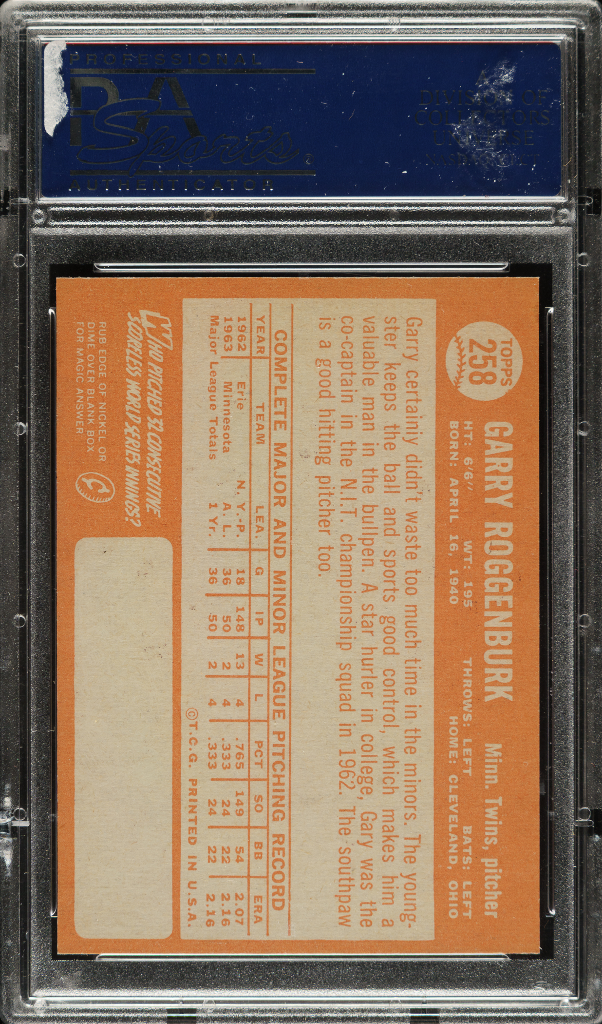 1964 Topps #258 Garry Roggenburk PSA GEM MINT 10