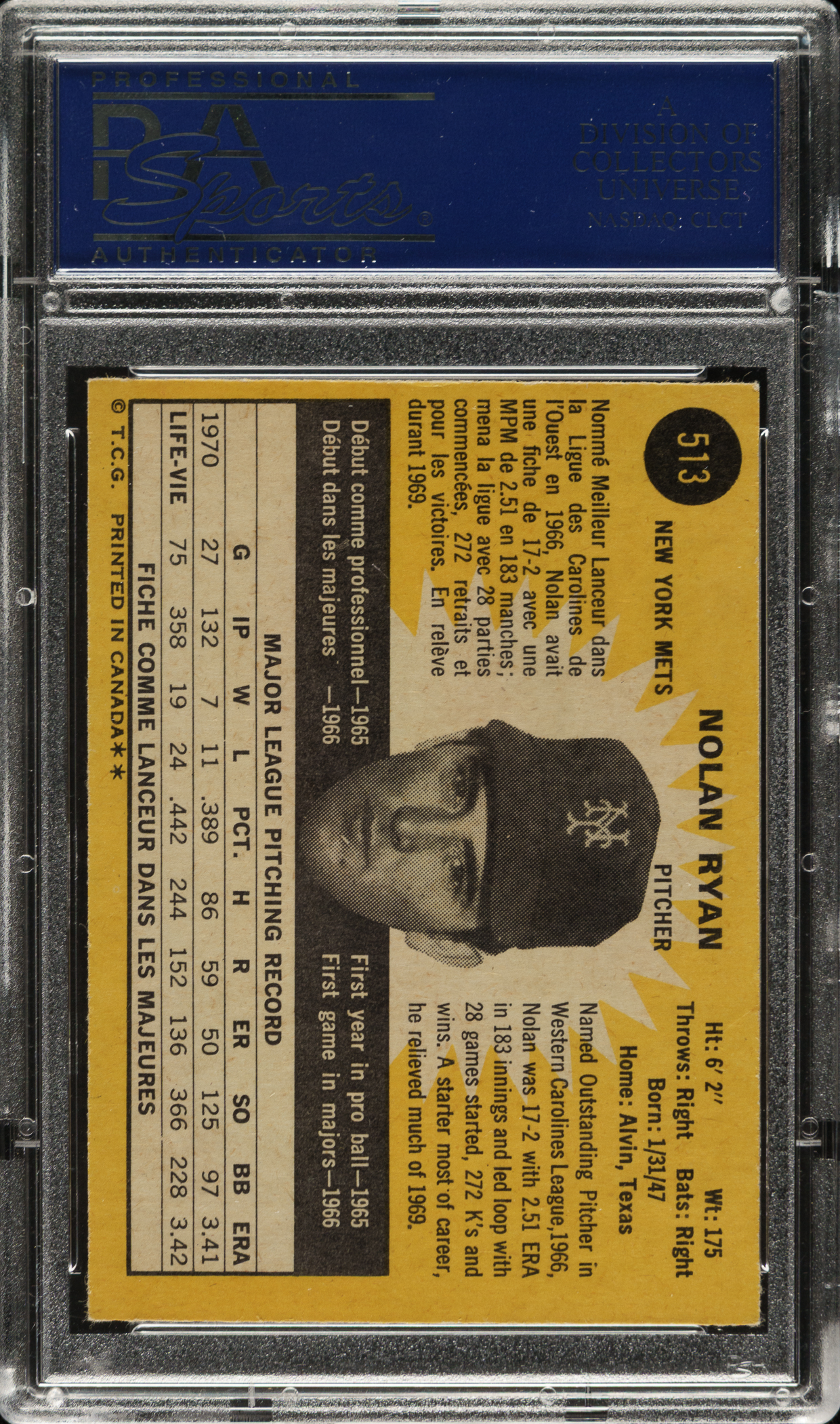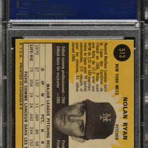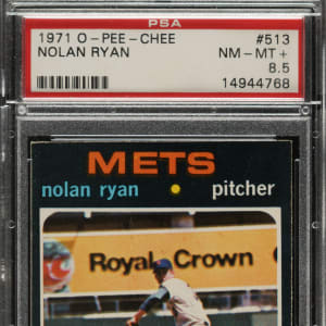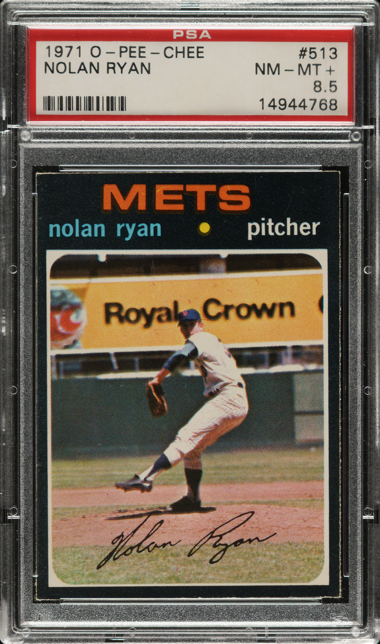 Graded NM-MT+ 8.5 by PSA. Only nine examples grade higher out of more than 350 cards evaluated by PSA to date. Outstanding example of Hall of Famer Nolan Ryan from the 1971 O-Pee-Chee baseball issue. 1971 O-Pee-Chee is nearly identical in design to the regular-issue Topps cards, but the reverse is printed in yellow with the text in French and English (#1-523), or entirely in English (high-number series only). Scarcely encountered in high grade, the offered example is bright and crisp with strong corners and minimal wear on the delicate black borders. Clean reverse. This is an exceptional high-grade example.