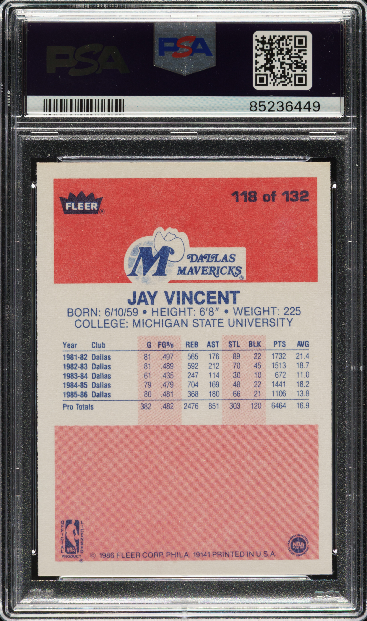 1986-1987 Fleer Basketball #118 Jay Vincent PSA GEM MINT 10