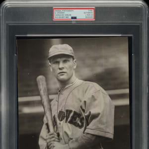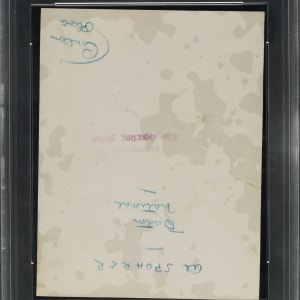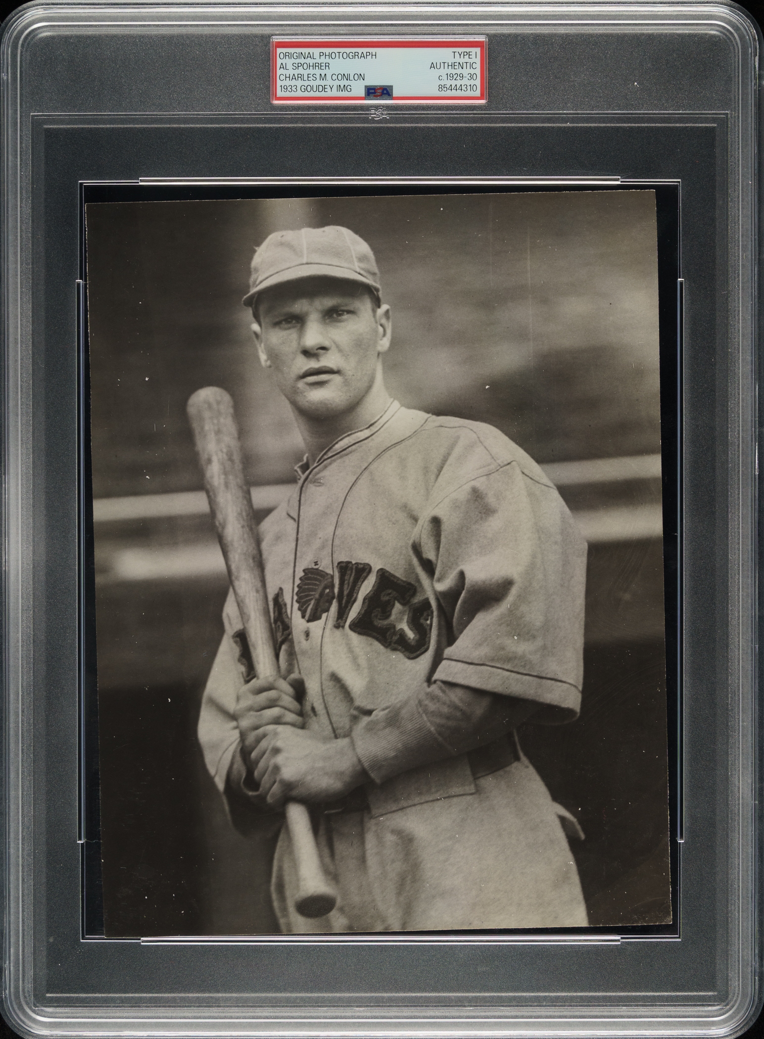 Original photo of Al Spohrer as a member of the Boston Dovestaken by noted baseball photographer Charles Conlon, circa 1929-1930. Encapsulated and certified by PSA/DNA as an original Type I Conlon photograph. It is interesting to note that this particular image on the offered photo was used in the production of Spohrer's 1933 Goudey card. Photos used in the production of trading cards have become increasingly popular in recent years, especially from landmark sets like 1933 Goudey. A handful of editorial notations are written on the reverse, including Spohrer's name and team. A "The Sporting News" stamp also appears on the reverse. The photo, which has been trimmed to its current dimensions of 7-1/8 x 9-1/4 inches, is in Excellent condition overall.