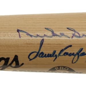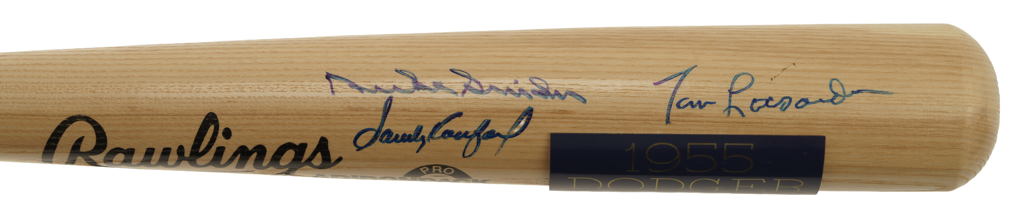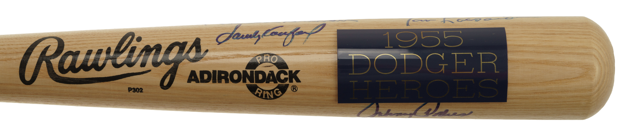 1955 World Series Champion Brooklyn Dodgers multi-signed bat. Includes the following signatures: Sandy Koufax, Duke Snider, Tommy Lasorda, and Johnny Podres. Total: 4 signatures. Full LOA from James Spence/JSA. The size/weight of this item requires that there will be an additional shipping charge for this lot.
