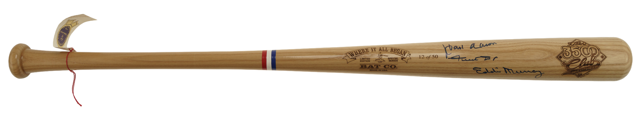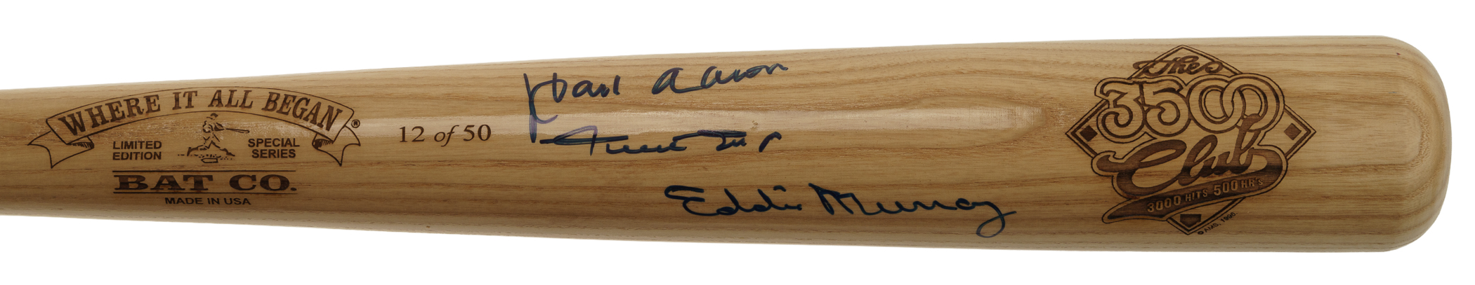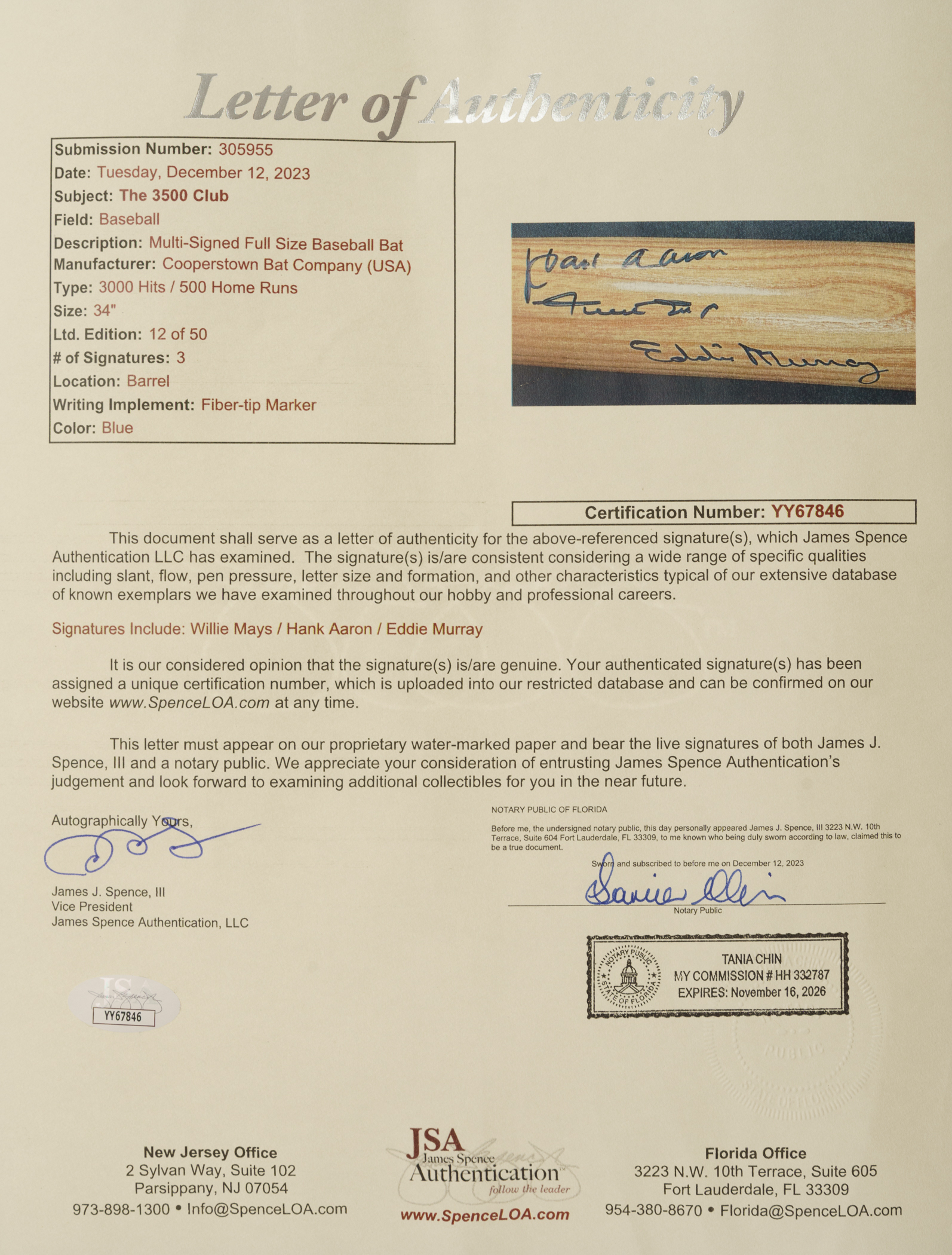 500 Home Run Club multi-signed bat. Includes the following signatures: Willie Mays, Hank Aaron and Eddie Murray. This limited edition bat is numbered 12 out of 50. Total: 3 signatures. Full LOA from James Spence/JSA. The size/weight of this item requires that there will be an additional shipping charge for this lot.