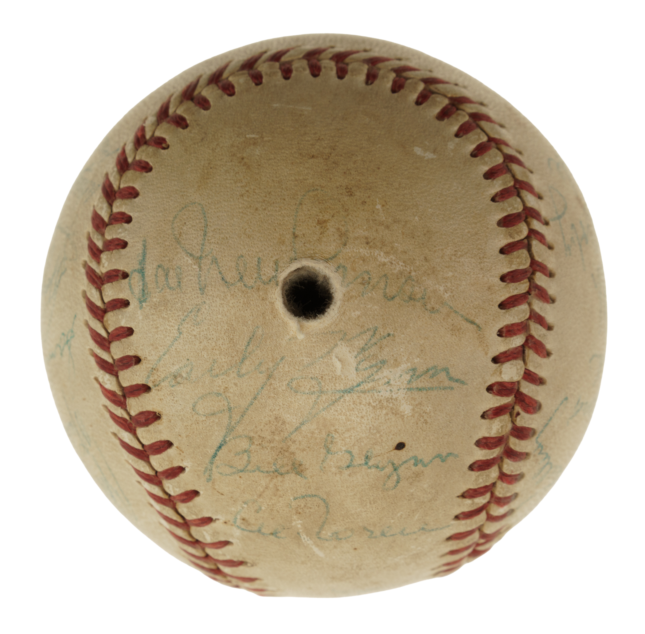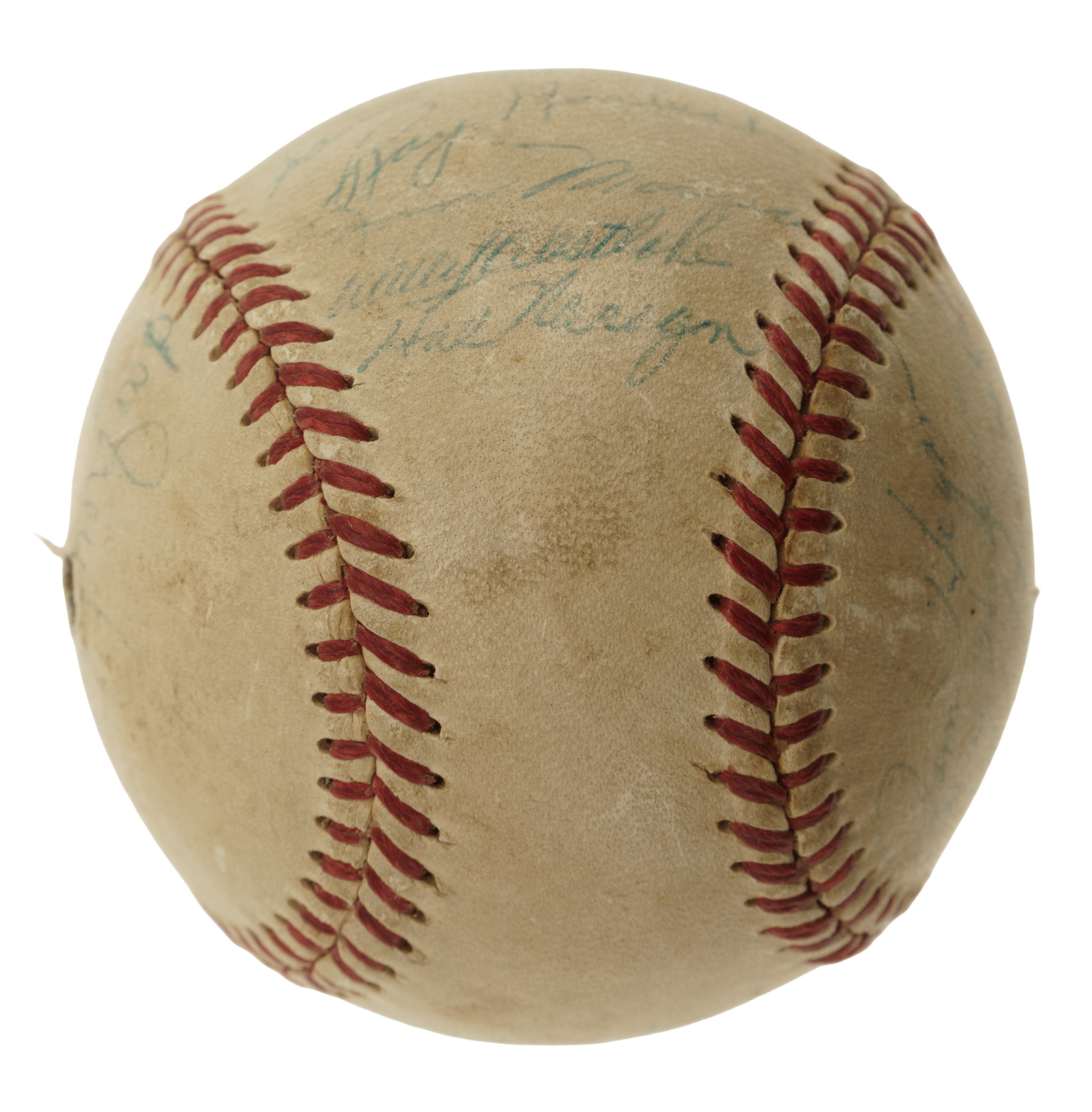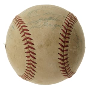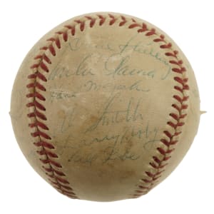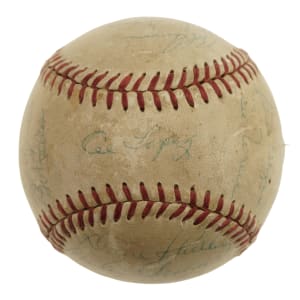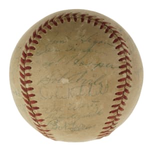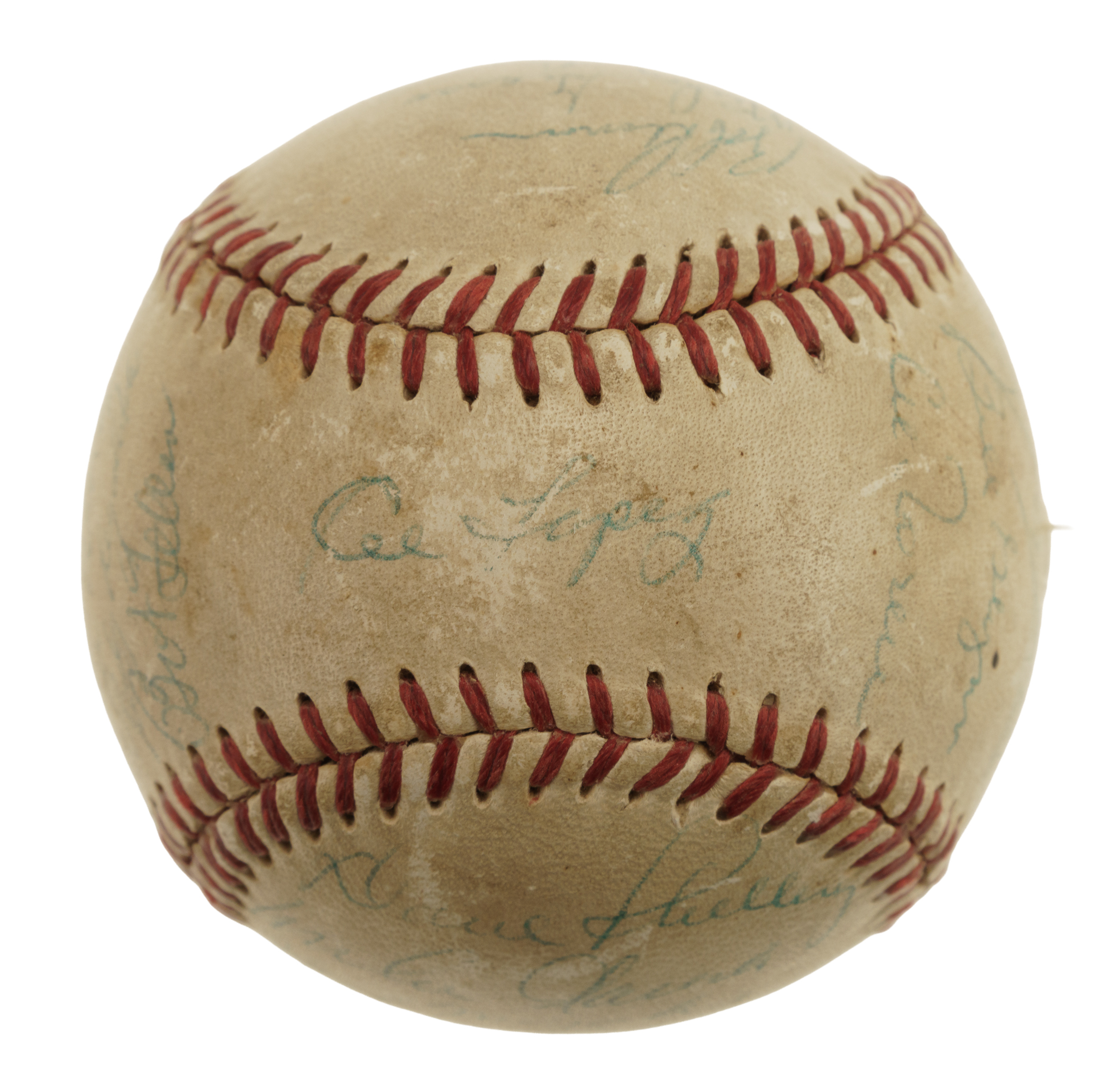 Red-stitched baseball signed in blue ink by twenty-six members of the 1954 American League Champion Cleveland Indians. Led by the stellar pitching of Lemon, Feller, Wynn, and Garcia, the 1954 Indians put together one of the best single-season records in baseball history, setting the American League records for wins (111) and winning percentage (.721). Notable signatures include Feller, Wynn, Doby, Newhouse, Lemon, Wertz, Hegan, Rosen, Smith, and Mitchell. According to JSA, the Lopez (sweet spot) signature is a clubhouse variety. The ball displays a hole drilled along one of the side panels, along with light soiling and several surface abrasions. Poor condition overall. Full LOA from James Spence/JSA.