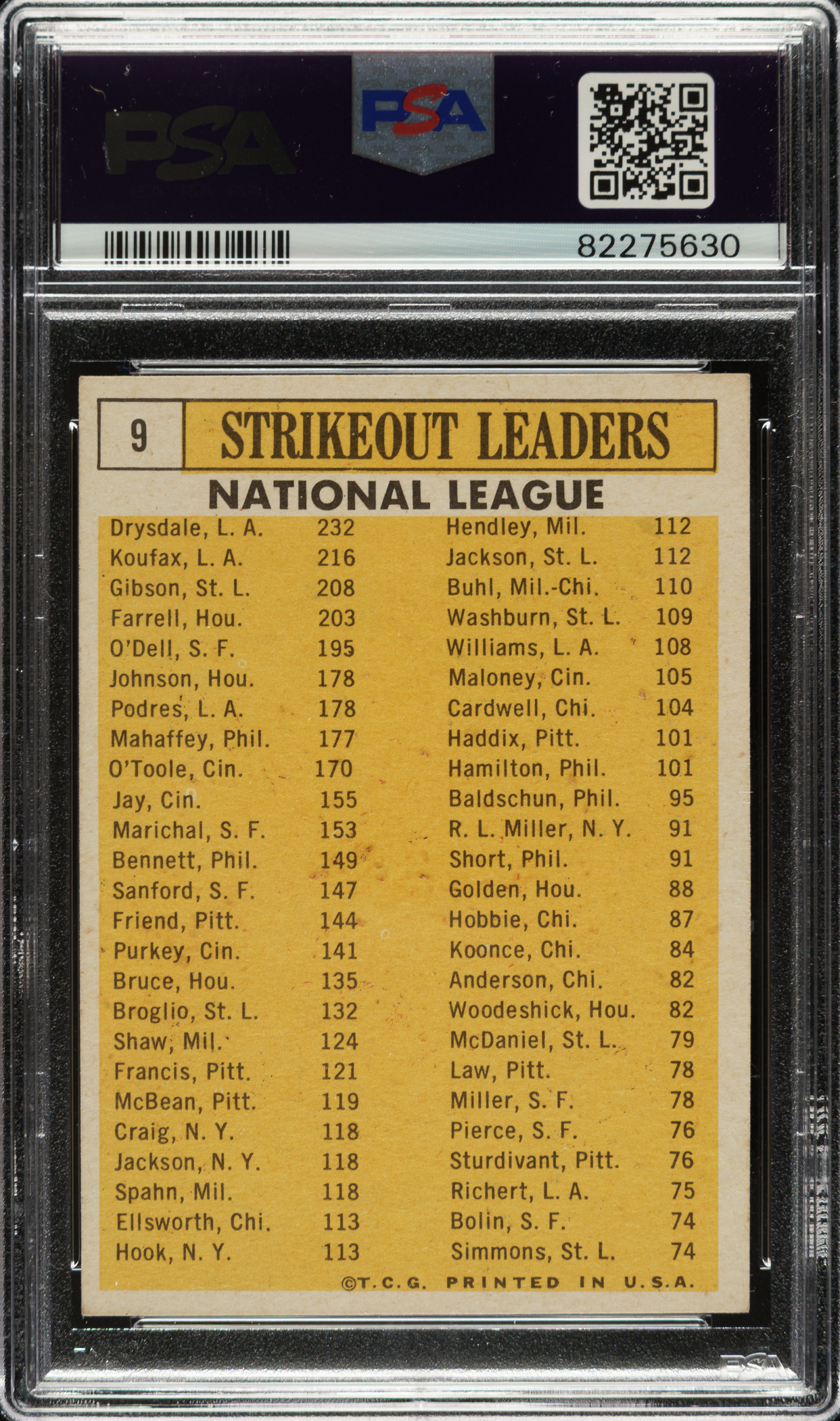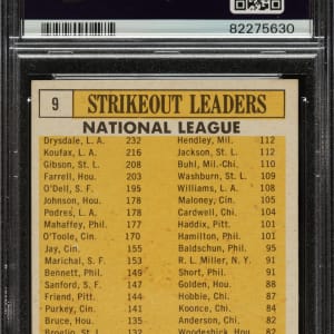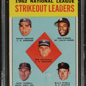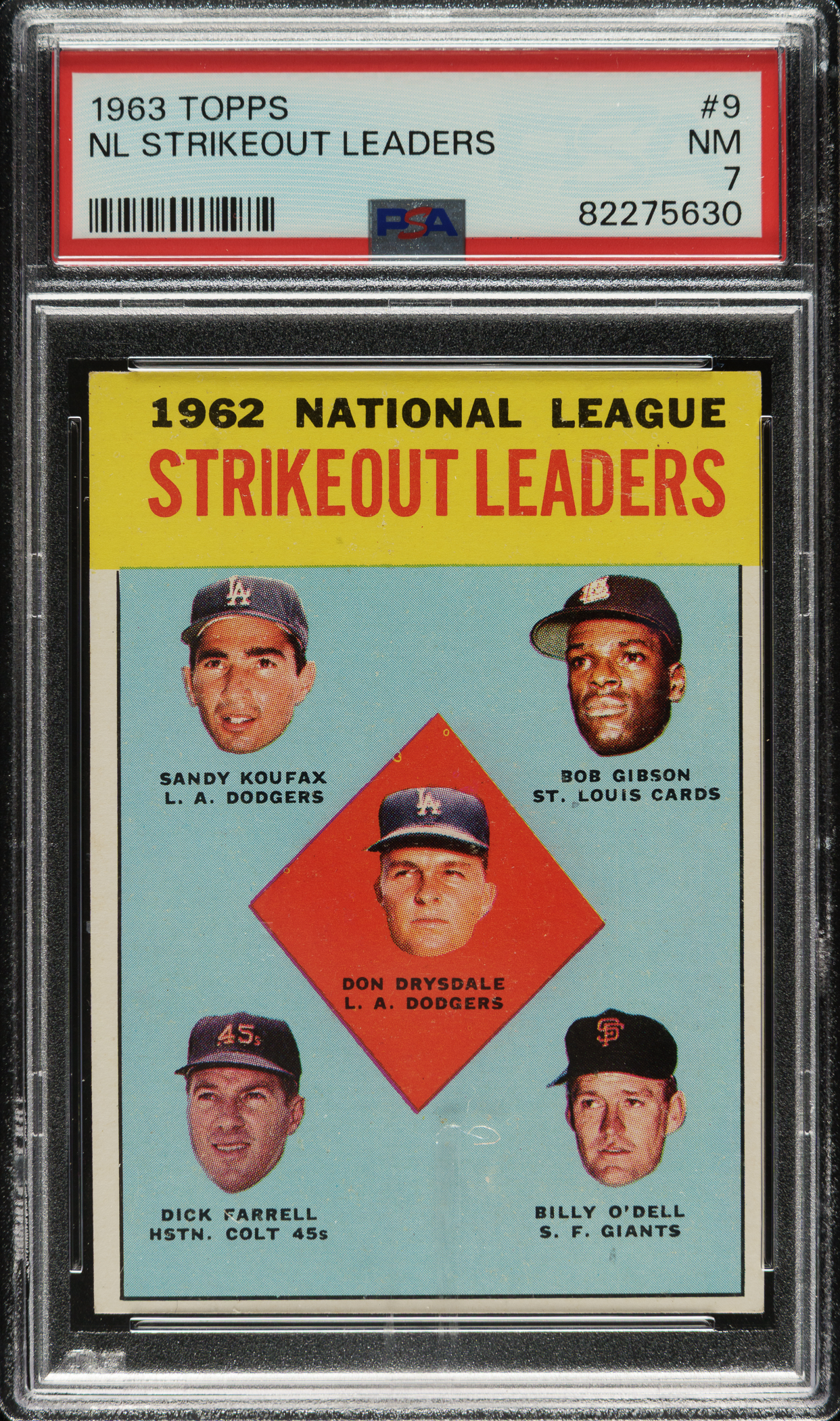 Graded NM 7 by PSA. Featuring Hall of Famers Sandy Koufax (Los Angeles Dodgers), Bob Gibson (St. Louis Cardinals), and Don Drysdale (Los Angeles Dodgers).