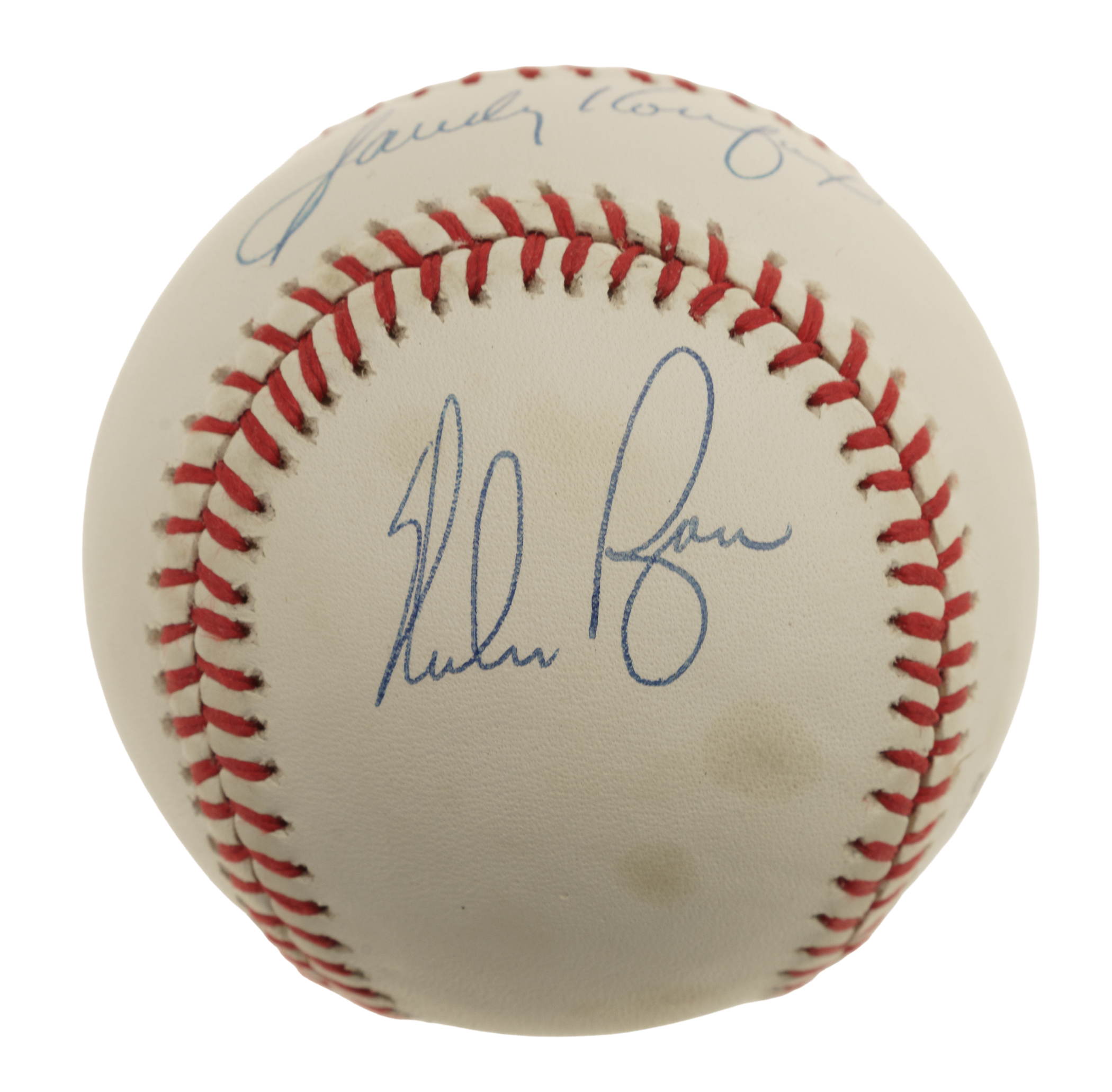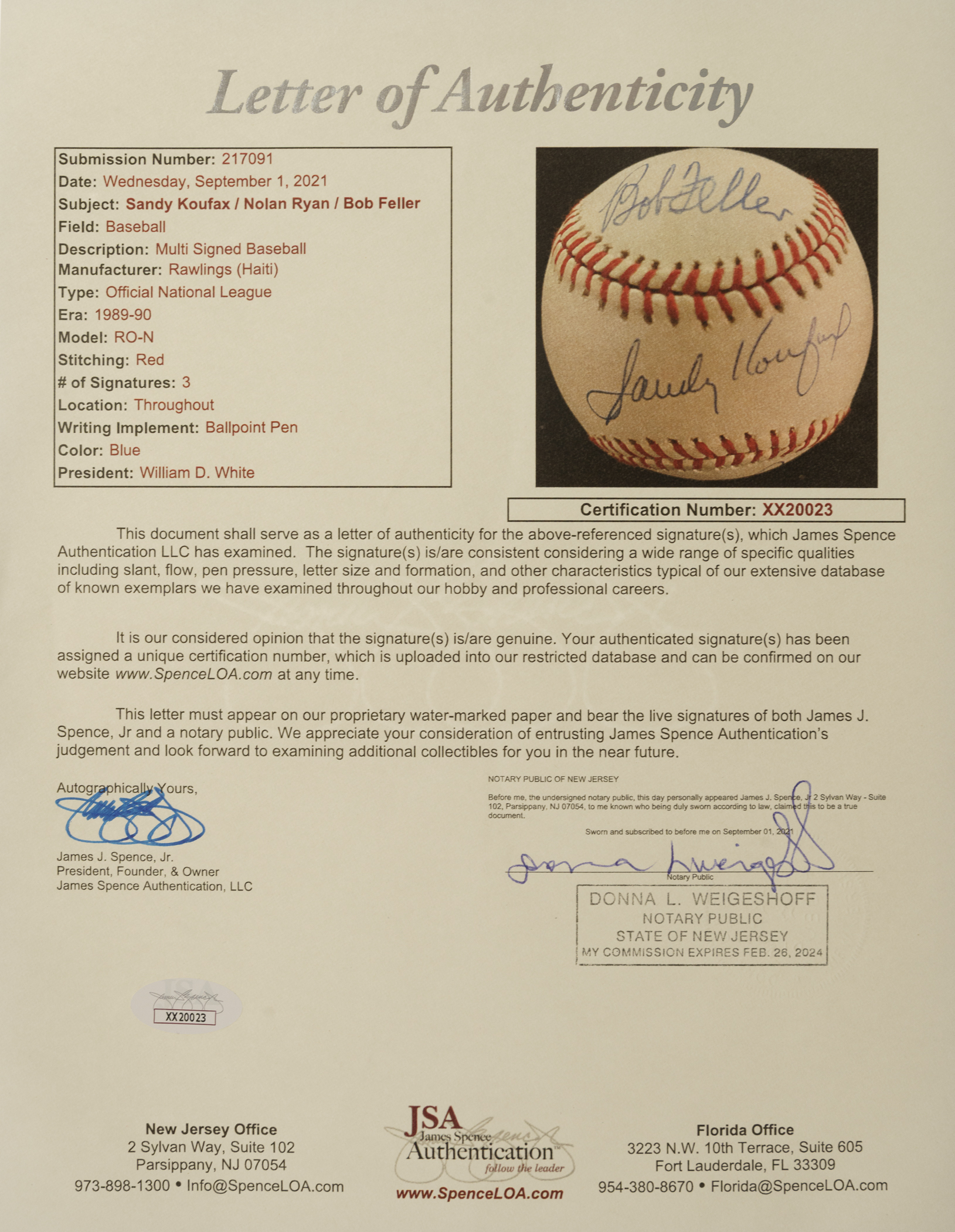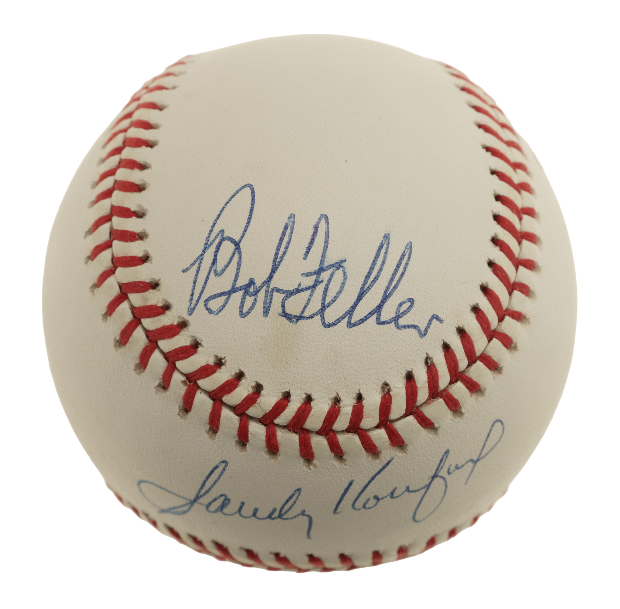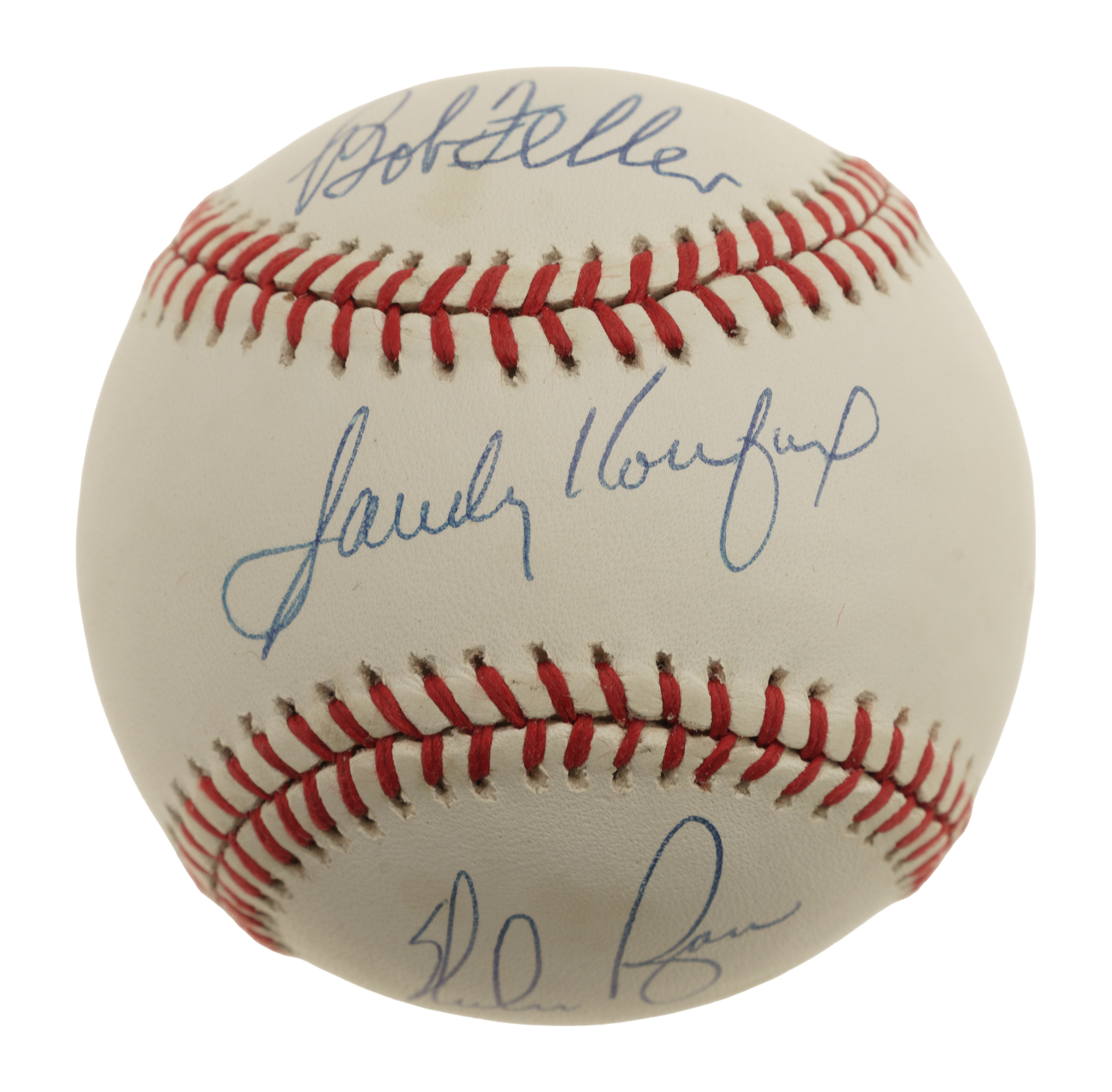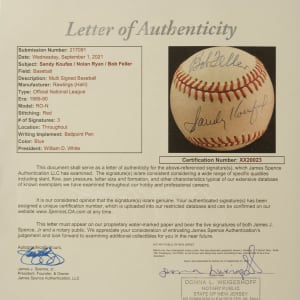 Los Angeles Dodgers, New York Mets, and Cleveland Indians Hall of Famers Sandy Koufax, Nolan Ryan, and Bob Feller signed baseball. Full LOA from James Spence/JSA.