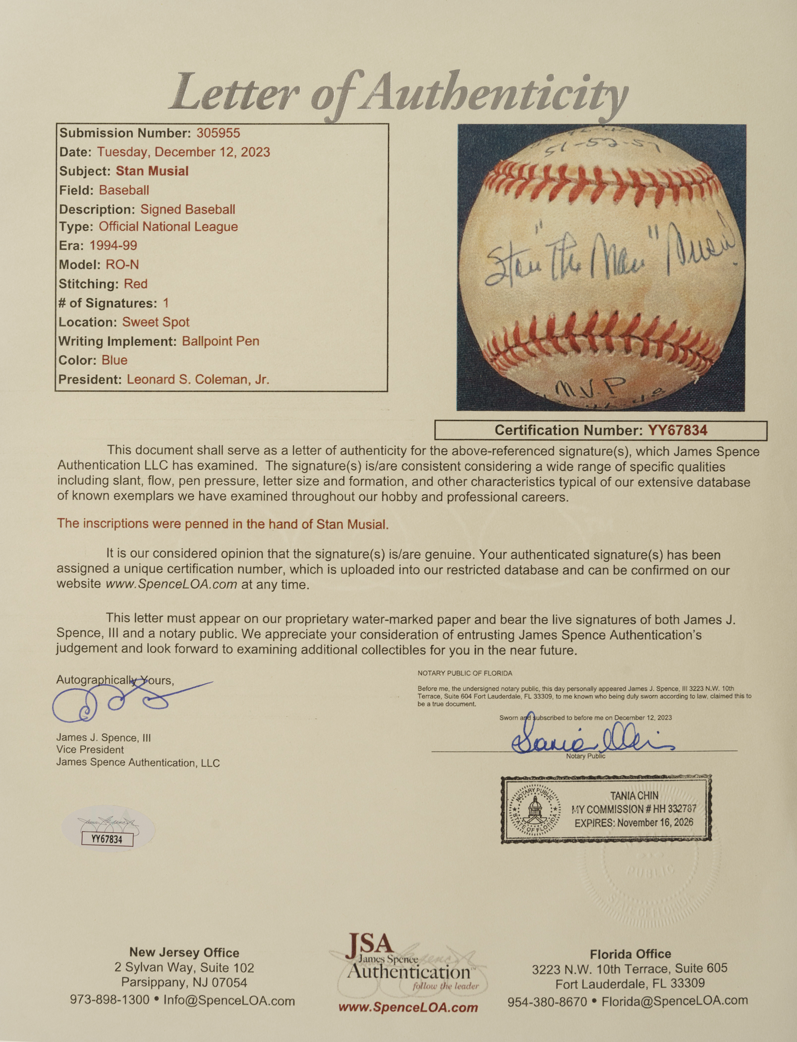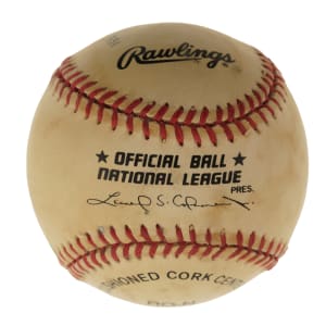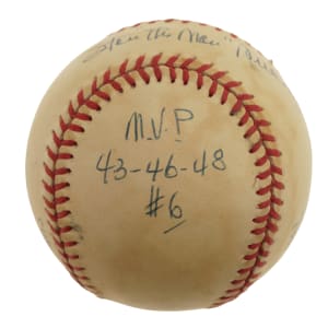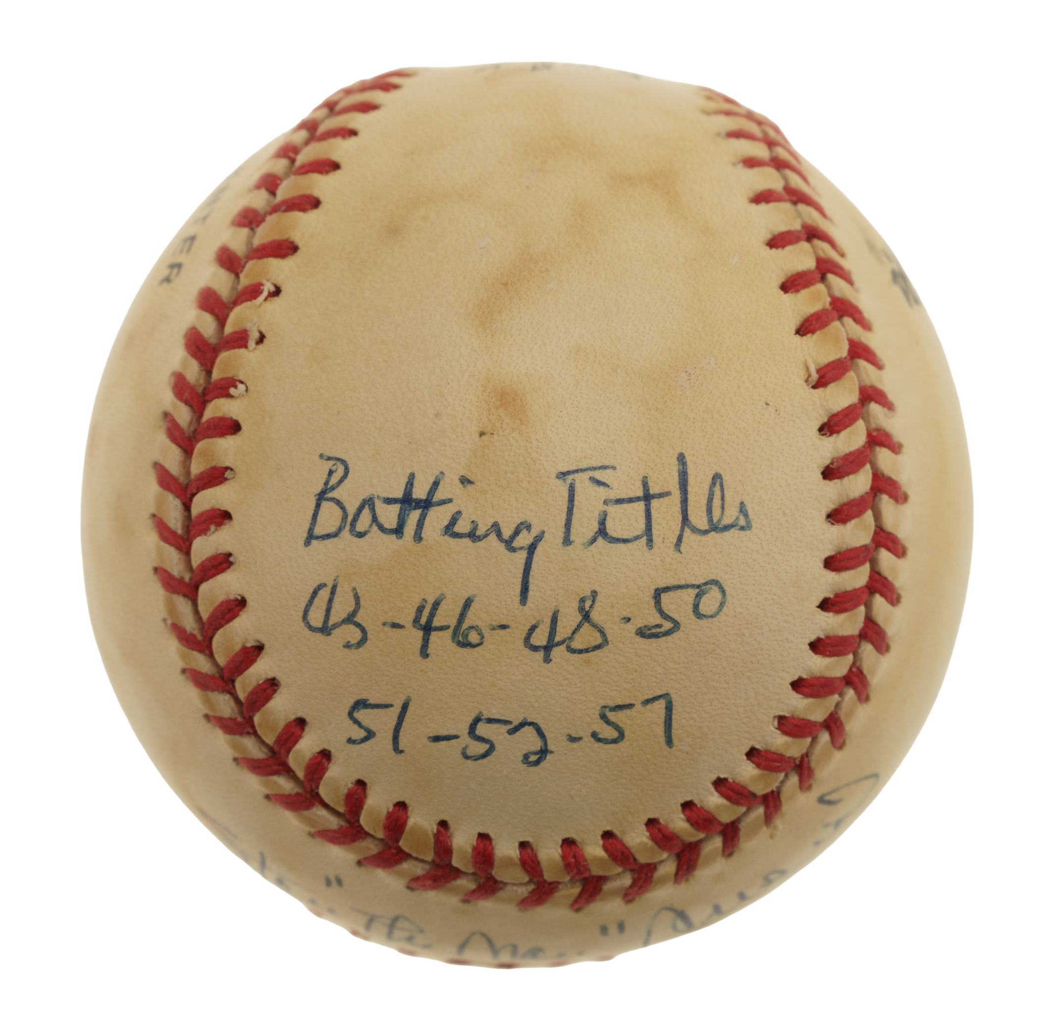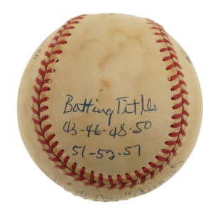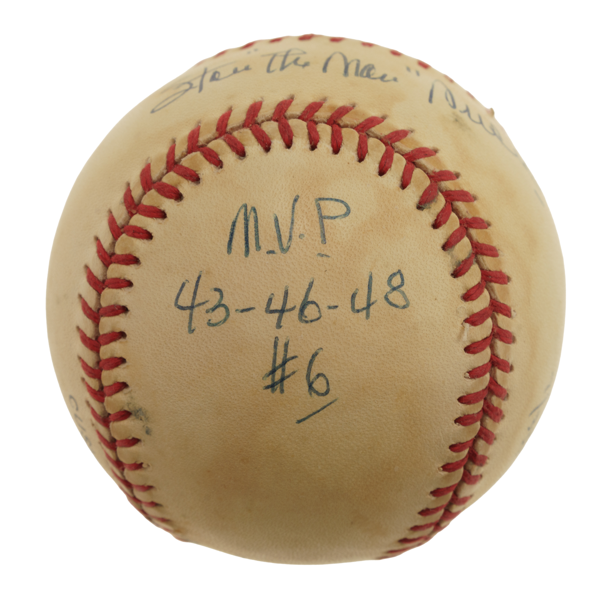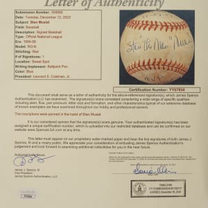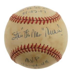 Single-signed "stat" balls, which are rare for all players as they require so much time, effort, and thought (compared to just signing a ball), have understandably always been extremely popular with collectors because the information provided in the player's hand over and above the signature creates a single-signed ball that towers above a traditional signed ball in significance. That is certainly the case for this Stan Musial "Stat Ball." The Hall of Fame outfielder has beautifully scripted his name across the sweet spot and inscribed several handwritten career statistics and/or achievements on the four side panels of this Official National League baseball (Coleman). The ball exhibits heavy toning but is otherwise in Excellent condition overall. Full LOA from James Spence/JSA.