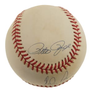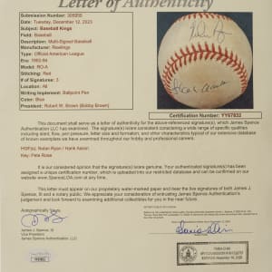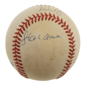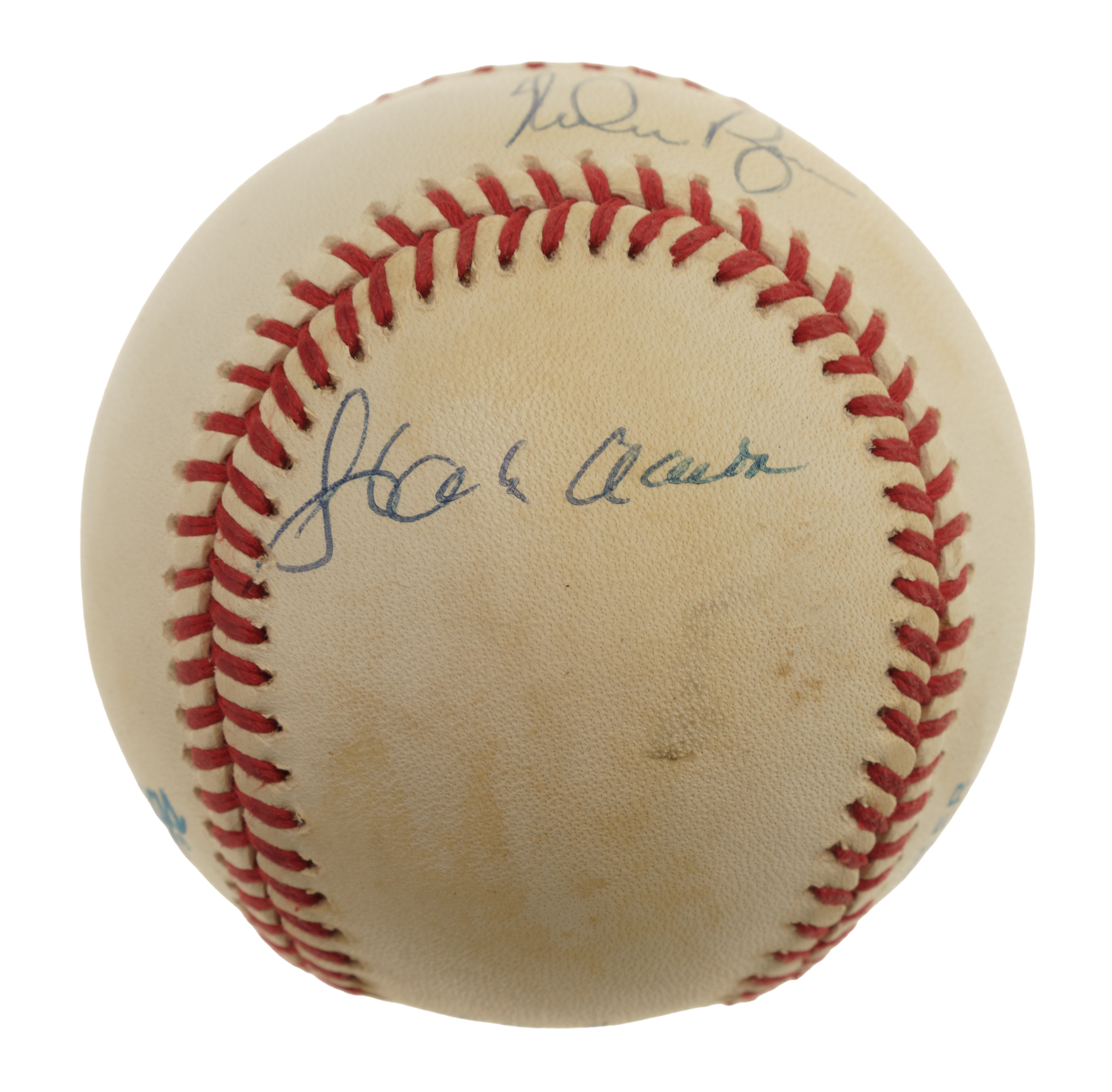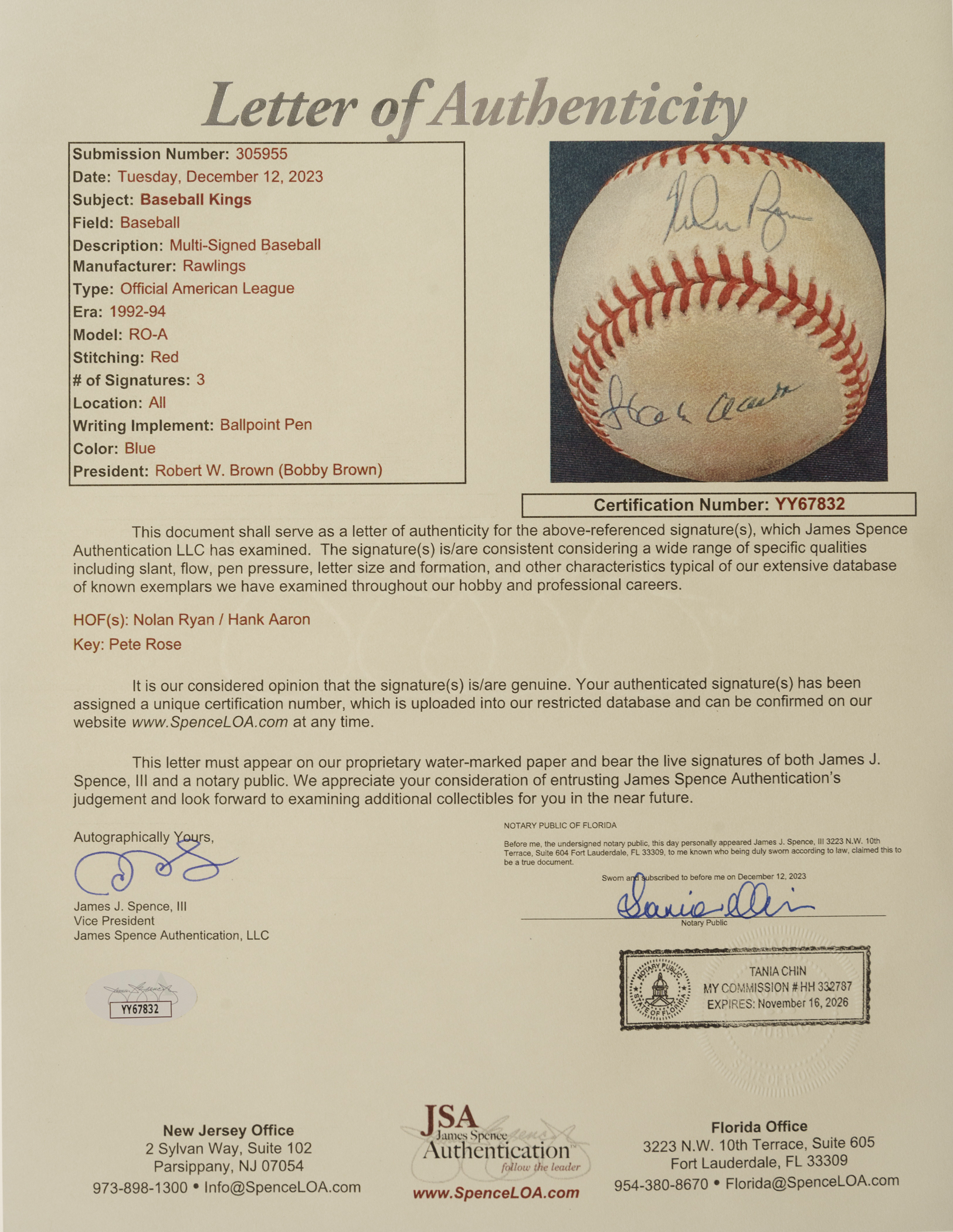 Texas Rangers, Atlanta Braves and Cincinnati Reds Hall of Famers and Star Nolan Ryan, Hank Aaron and Pete Rose signed baseball. Full LOA from James Spence/JSA.