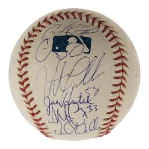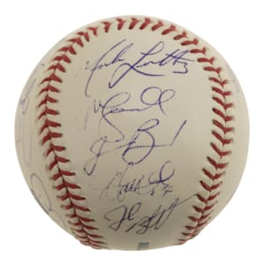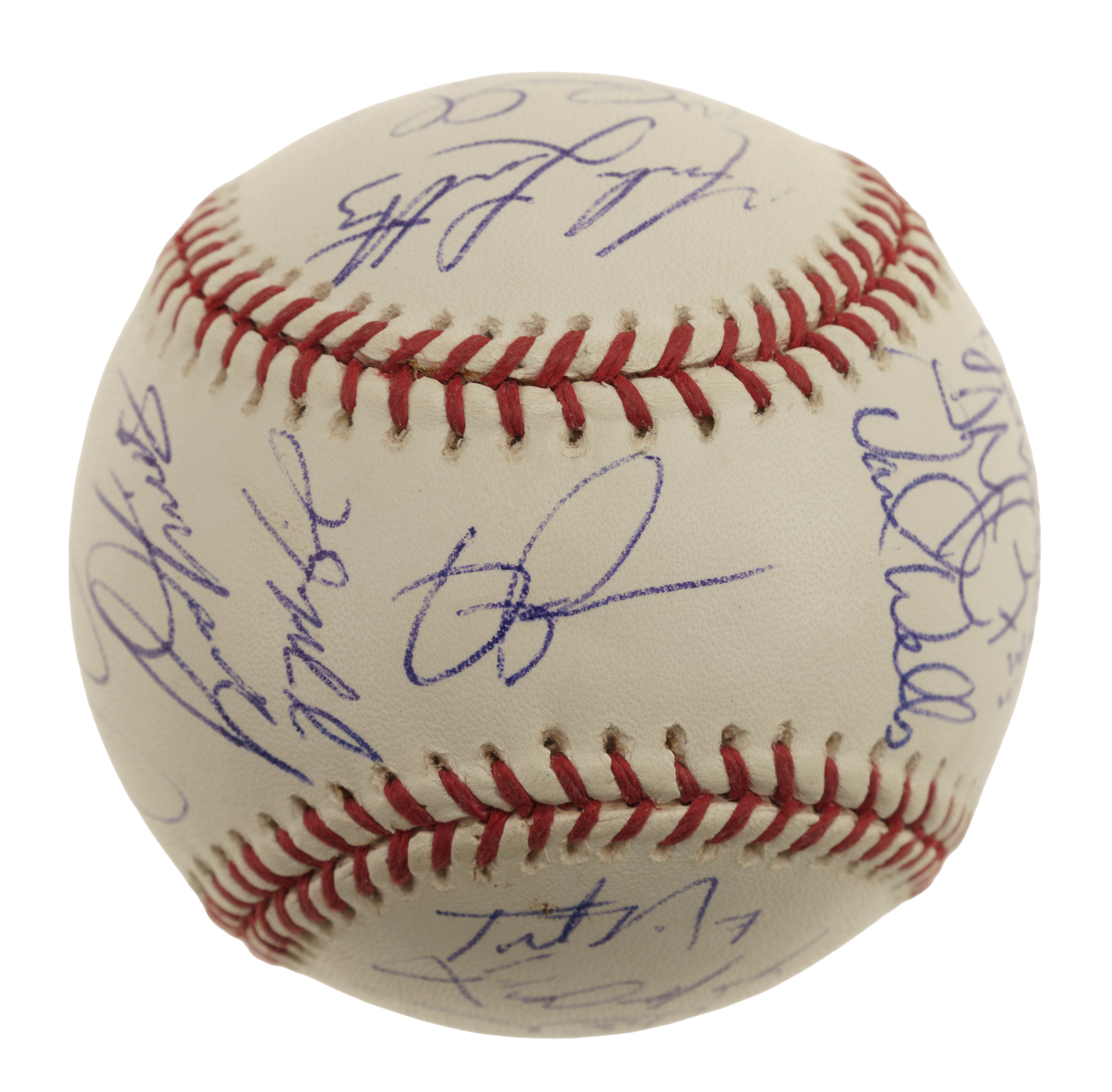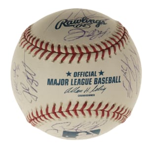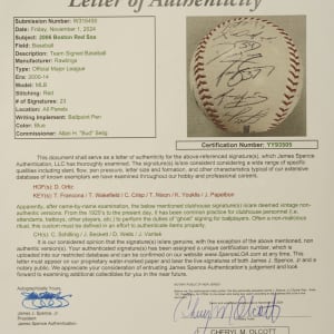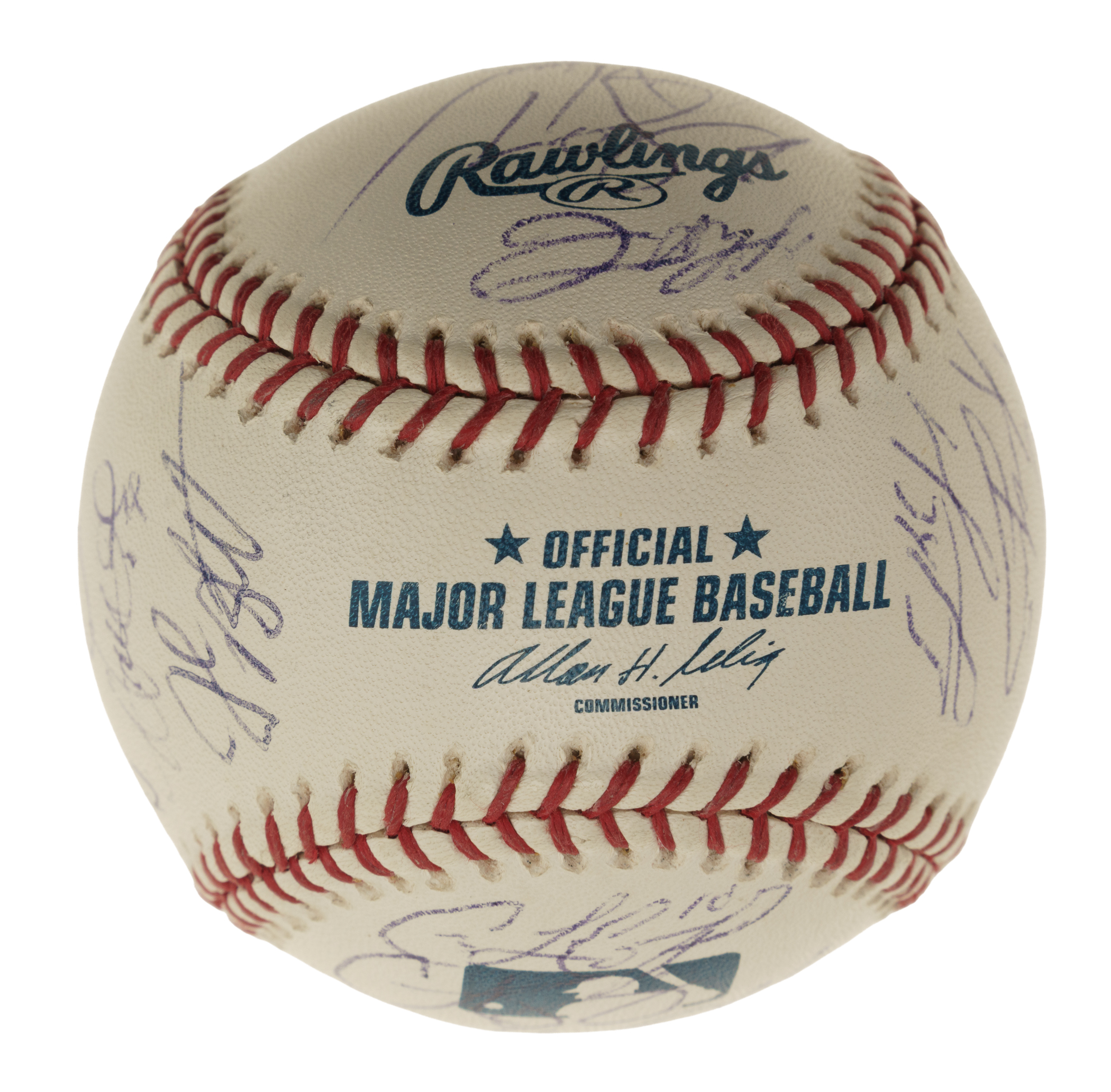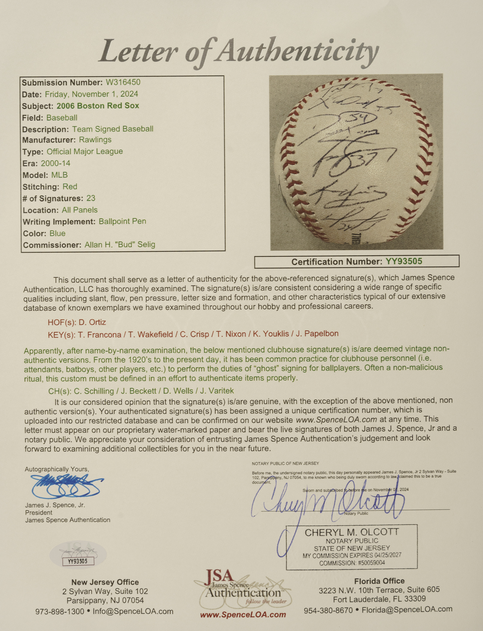 Official Major League baseball (Selig) signed in blue ink by twenty-three members of the 2006 Boston Red Sox. Notable signatures include Ortiz, Francona (mgr.), Wakefield, Crisp, Nixon, Youkilis, and Papelbon. Please note that the signatures of Schilling, Beckett, Wells, and Varitek have all been deemed classic "clubhouse" examples by JSA. Full LOA from James Spence/JSA.