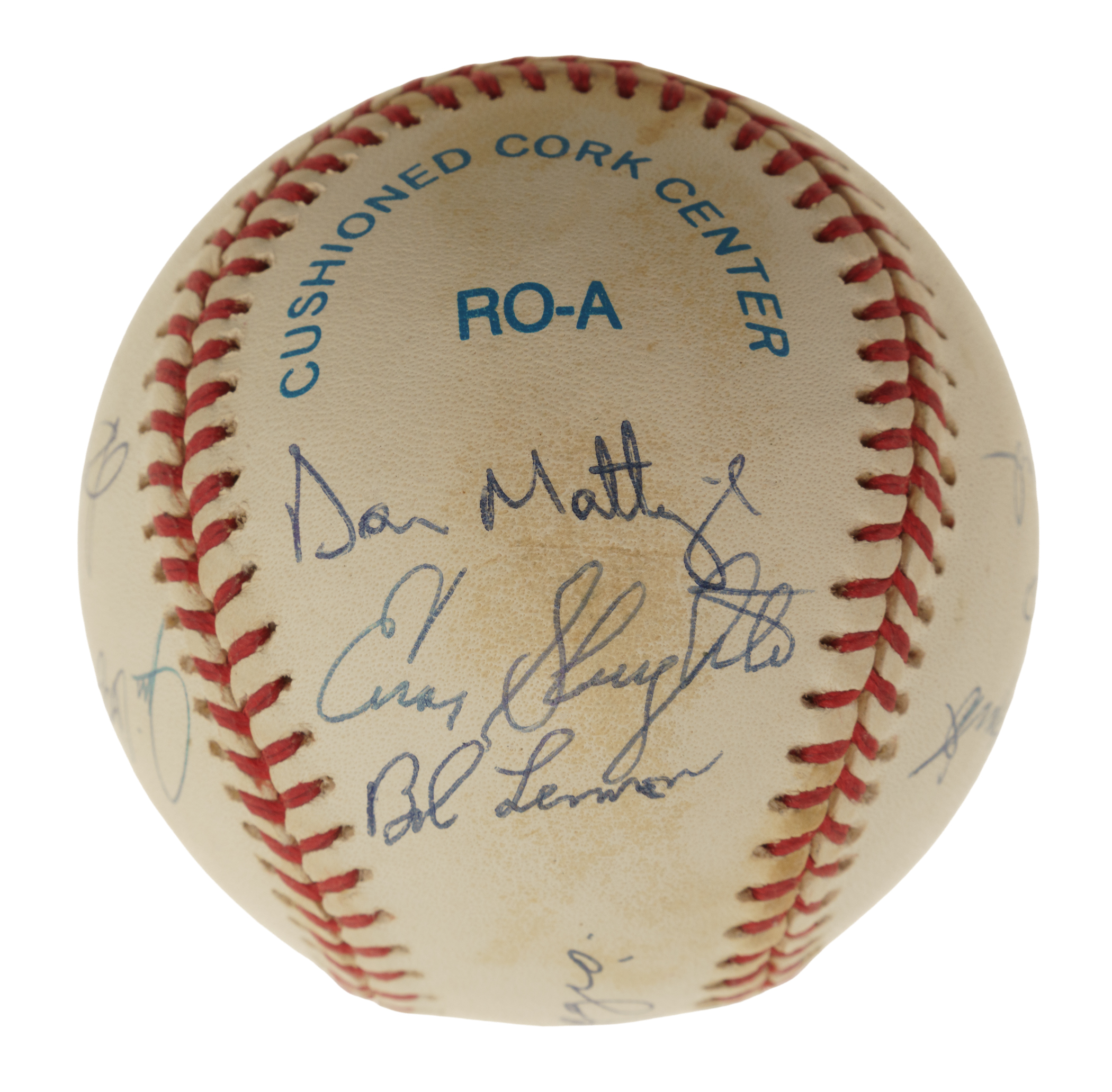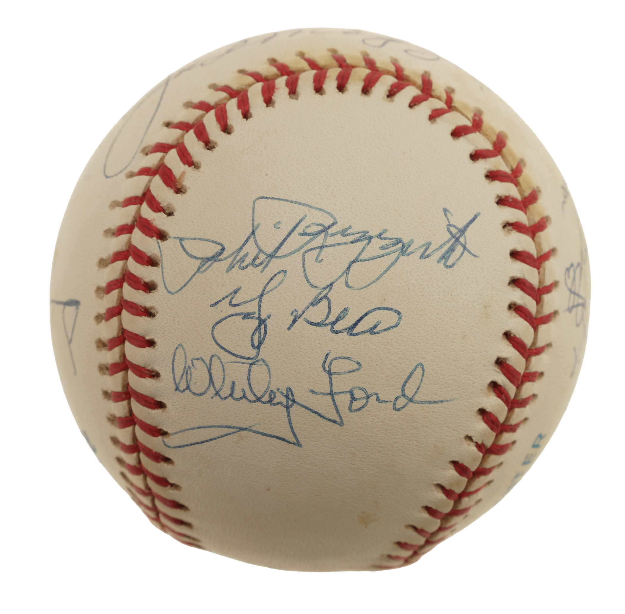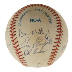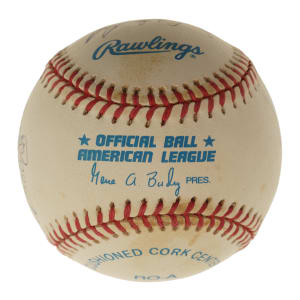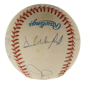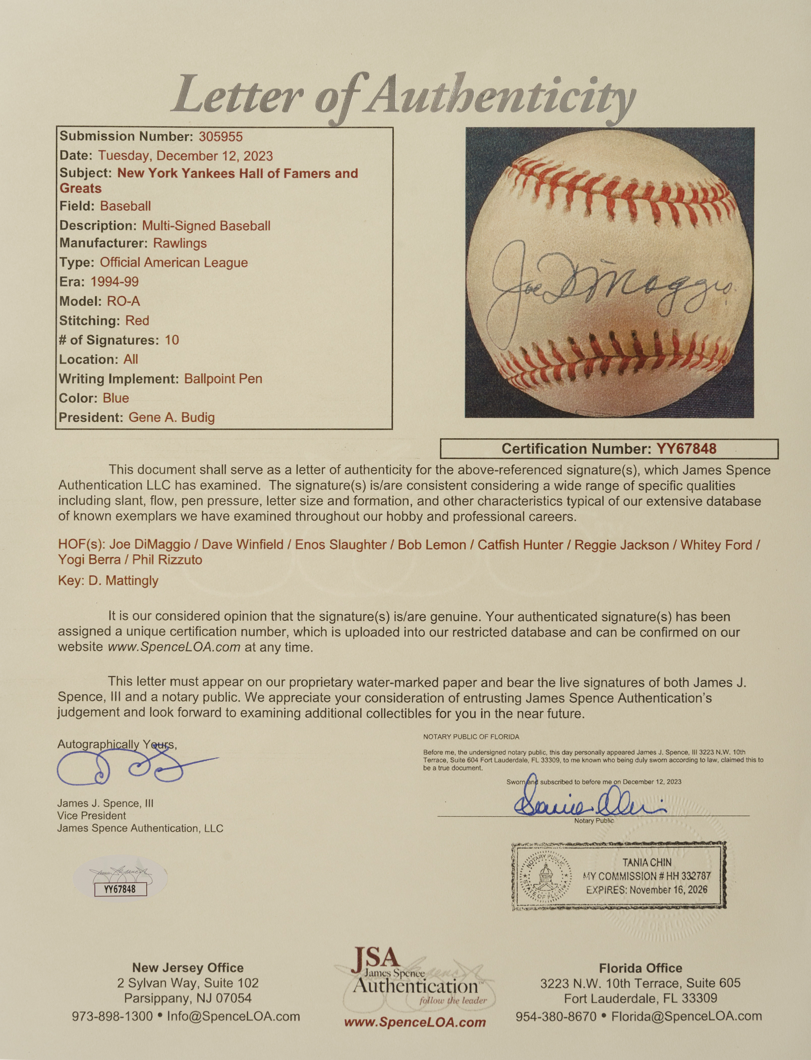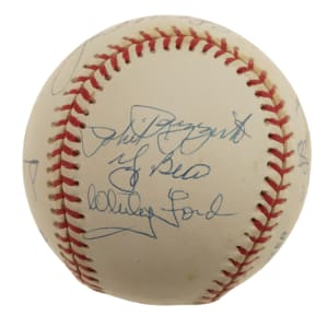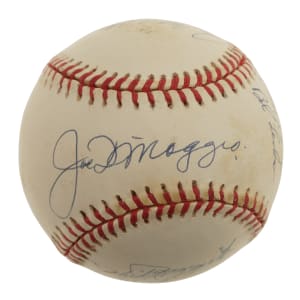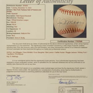 New York Yankees Hall of Fame and Star multi-signed baseball. This baseball includes the following signatures: Joe DiMaggio, Dave Winfield, Enos Slaughter, Bob Lemon, Catfish Hunter, Reggie Jackson, Whitey Ford, Yogi Berra, Phil Rizzuto and Don Mattingly. Total: 10 signatures. Full LOA from James Spence/JSA.