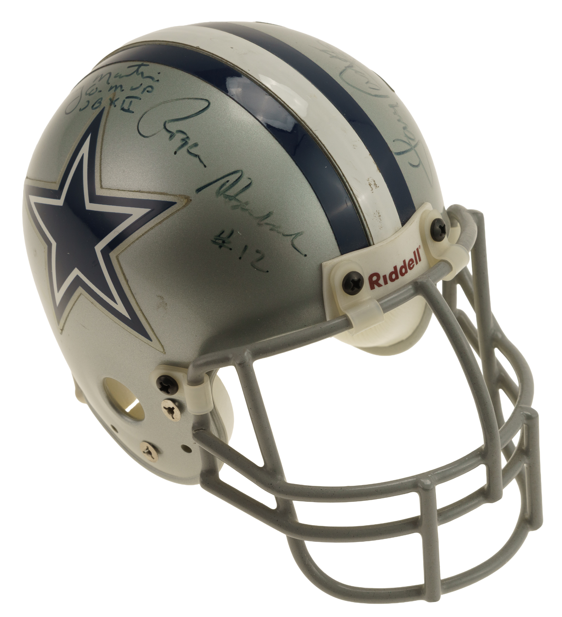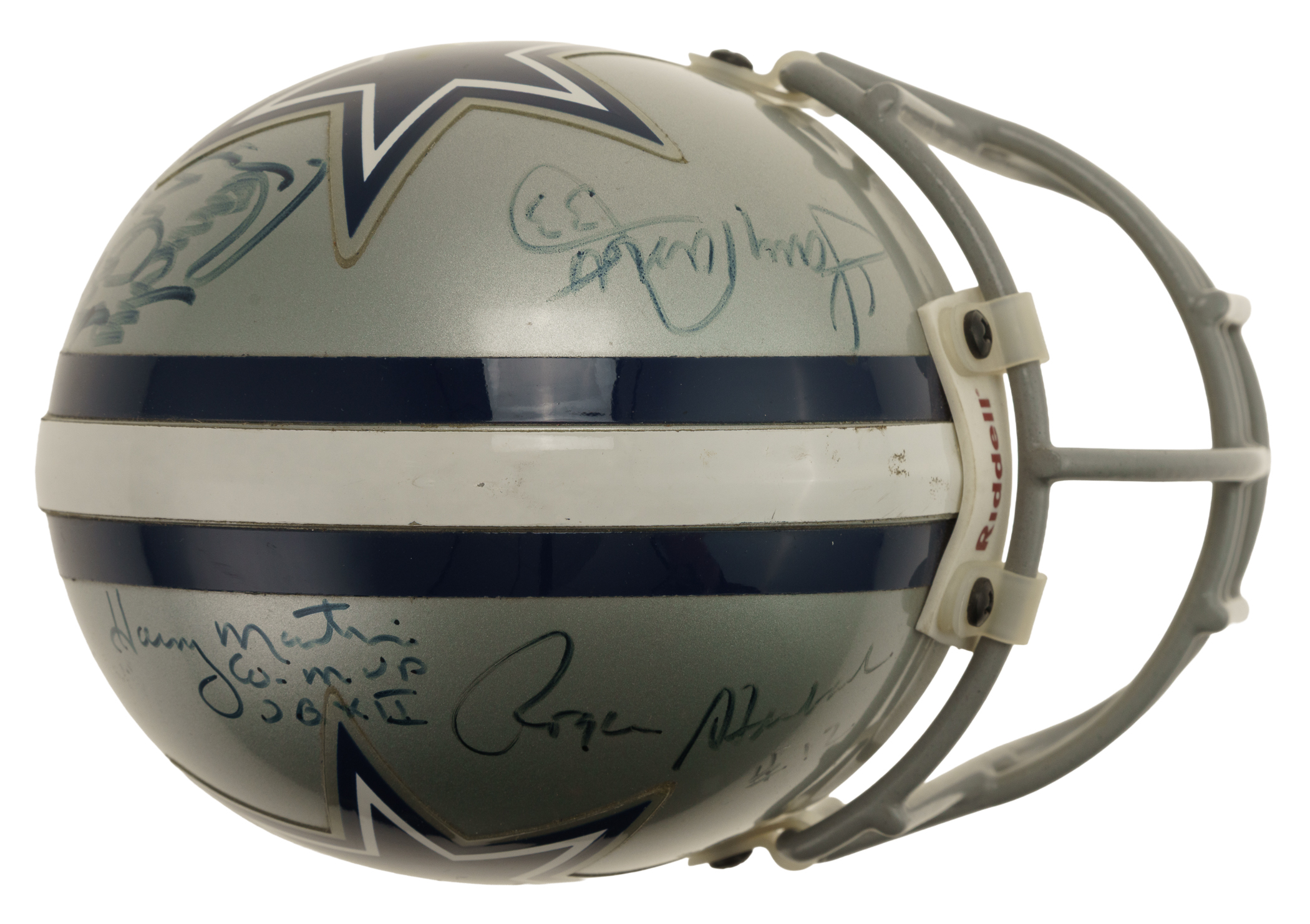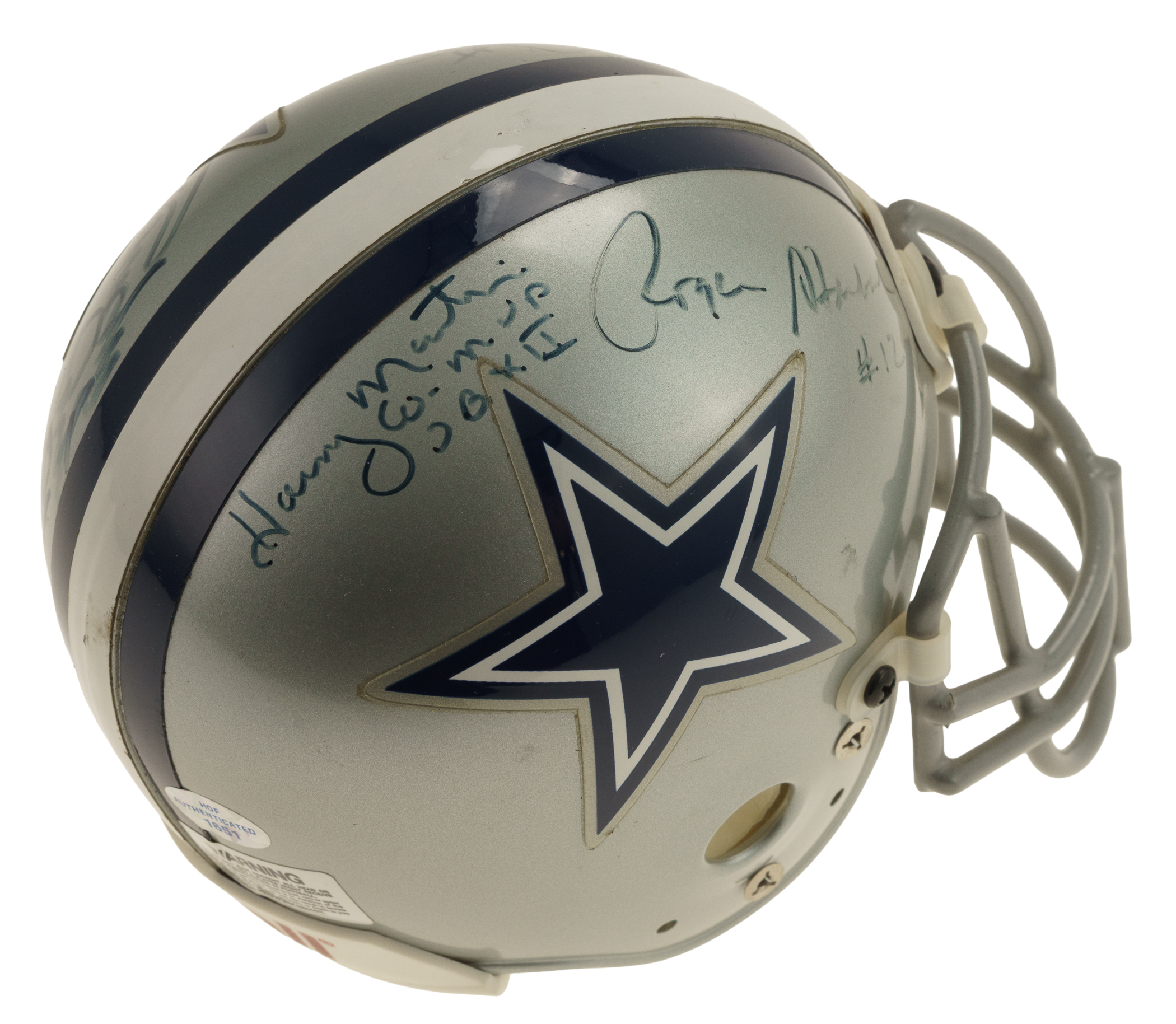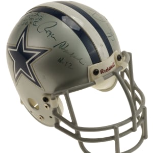 Hall of Fame and Star Multi-Signed Dallas Cowboys mini helmet. Includes the following signatures: Tony Dorsett, Randy White, Roger Staubach, and Harvey Martin. Full LOA from James Spence/JSA. The size/weight of this item requires that there will be an additional shipping charge for this lot.
