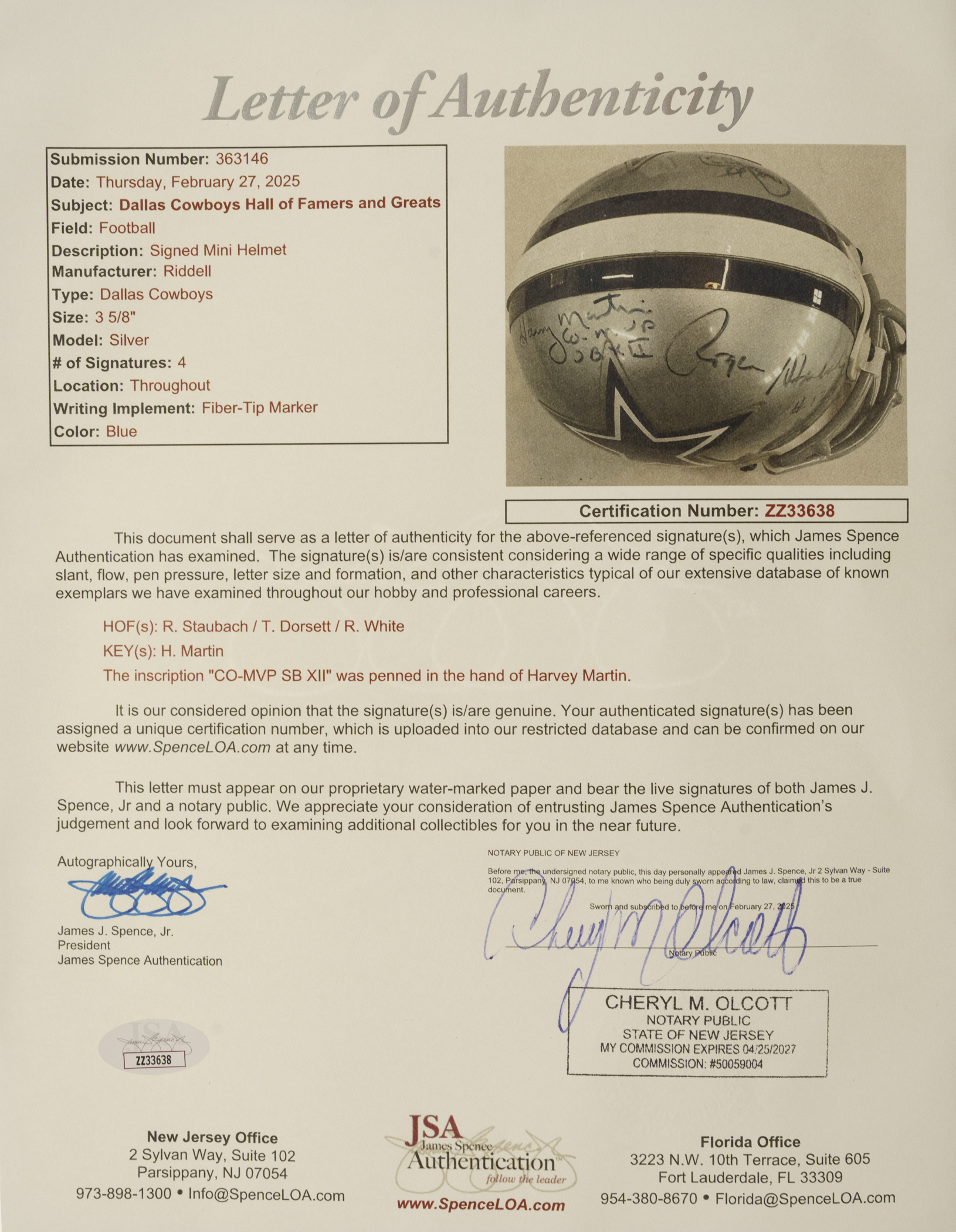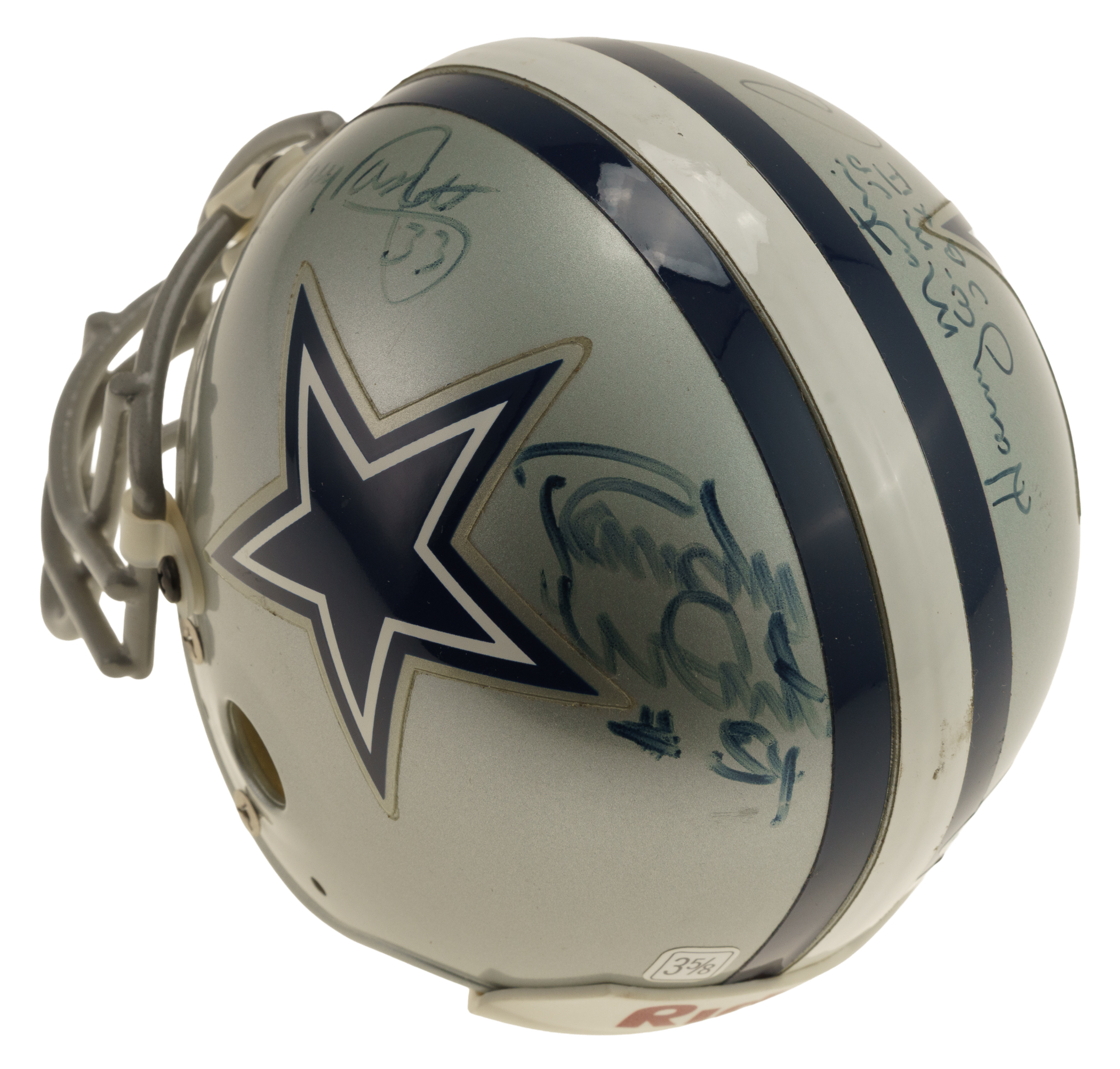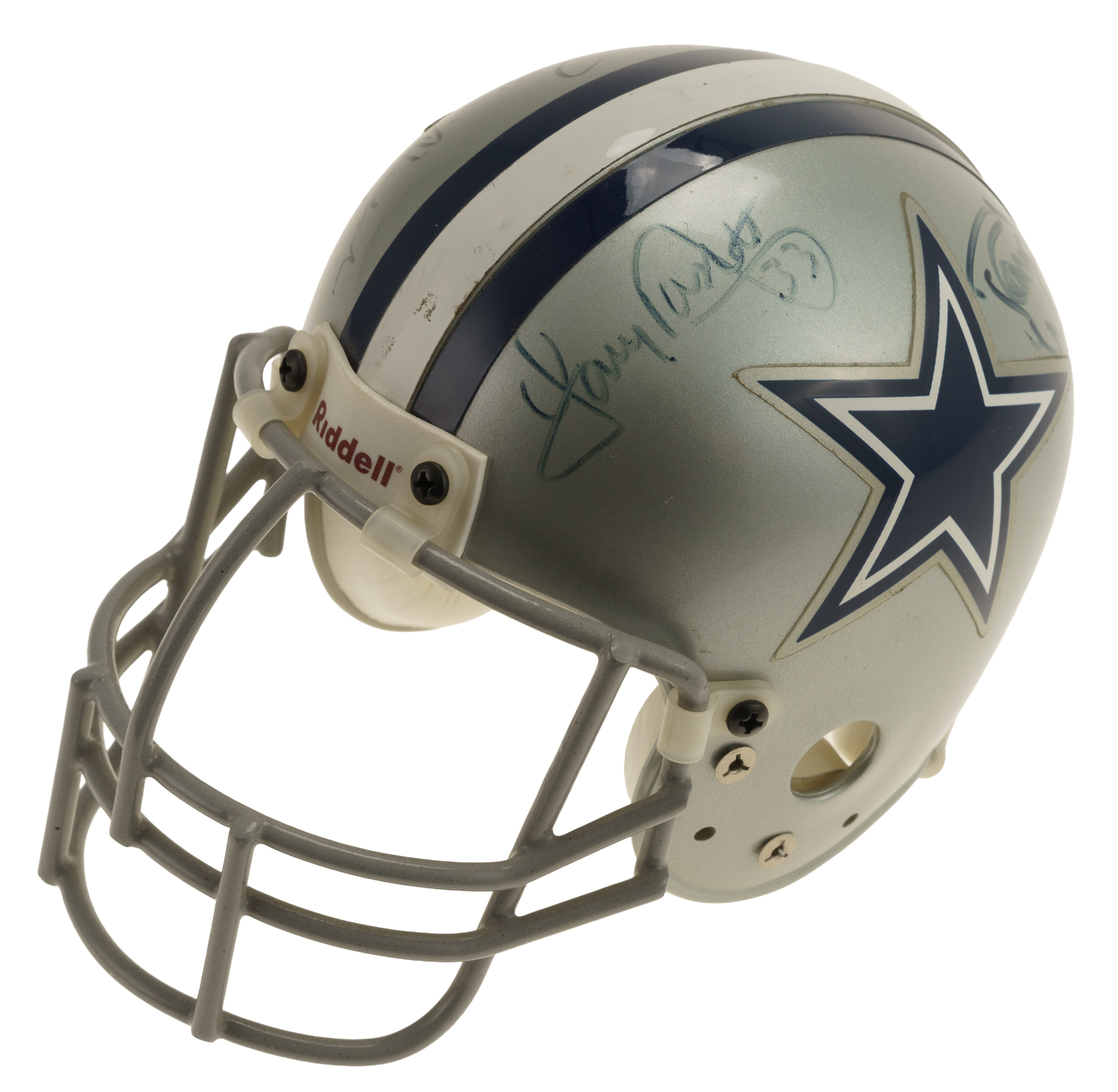 Hall of Fame and Star Multi-Signed Dallas Cowboys mini helmet. Includes the following signatures: Tony Dorsett, Randy White, Roger Staubach, and Harvey Martin. Full LOA from James Spence/JSA. The size/weight of this item requires that there will be an additional shipping charge for this lot.