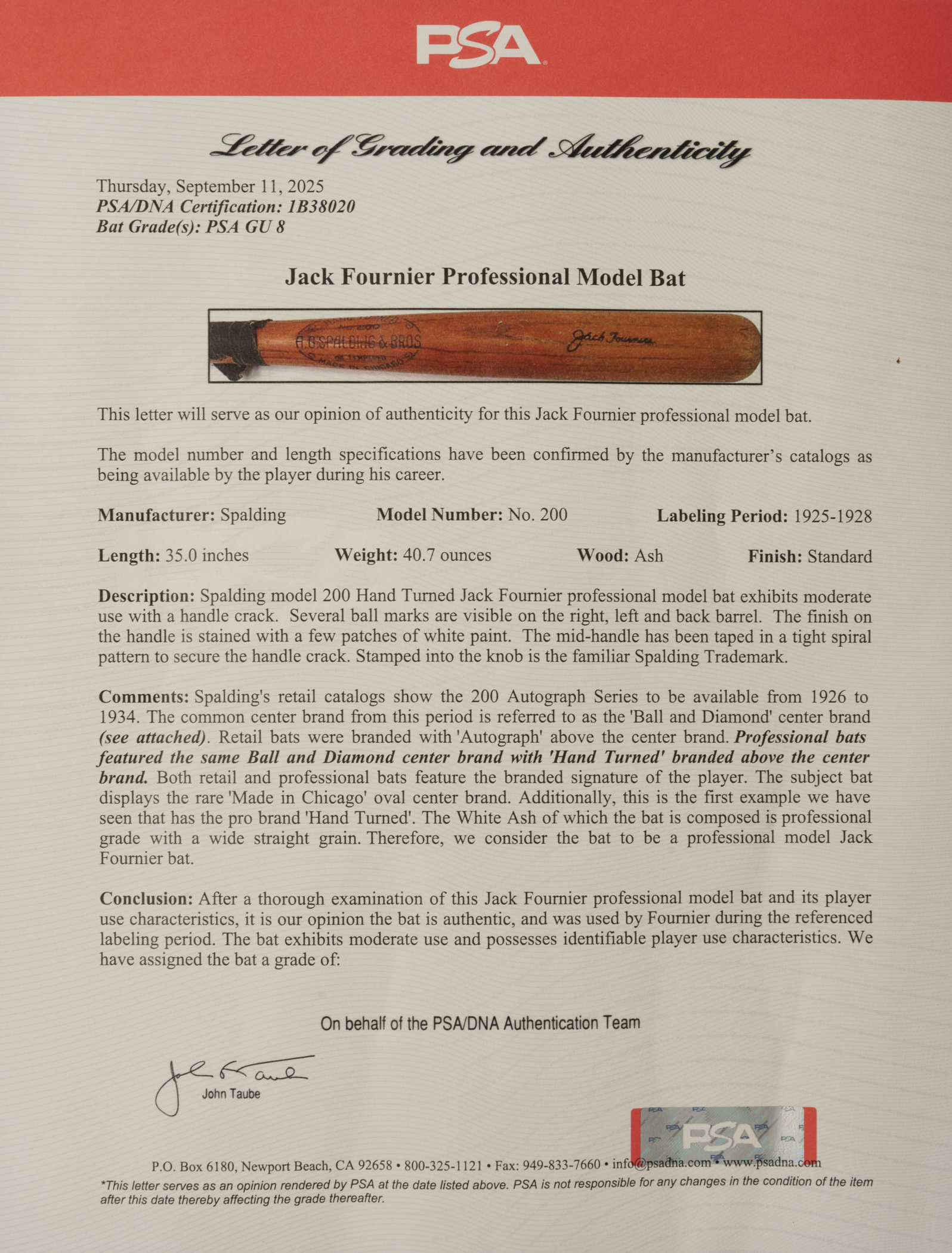 Jack Fournier Spalding Autograph signature-model bat ("200") dating from the 1925-1928 manufacturing period. Graded GU 8 by PSA/DNA. The bat has the Spalding logo stamped on the knob. The bat displays evidence of moderate use with several ball marks on the barrel. The mid-handle is taped in a spiral pattern to secure a handle crack. There are also a few patches of white paint on the handle. Additionally, this bat features the rare "Made in Chicago" oval center brand. For a complete analysis of the bat, we refer all prospective bidders to the PSA/DNA LOA, which can be viewed in its entirety on our website. One of baseball's most feared sluggers of the 1920s, Fournier led the National League in home runs in 1924 and had three consecutive 100-plus RBI seasons (1923-1925). He retired with a career .313 average and 123 home runs. Length: 35 inches. Weight: 40.7 ounces. Full LOA from John Taube of PSA/DNA (a corresponding sticker is affixed above the tape). The size/weight of this item requires that there will be an additional shipping charge for this lot.