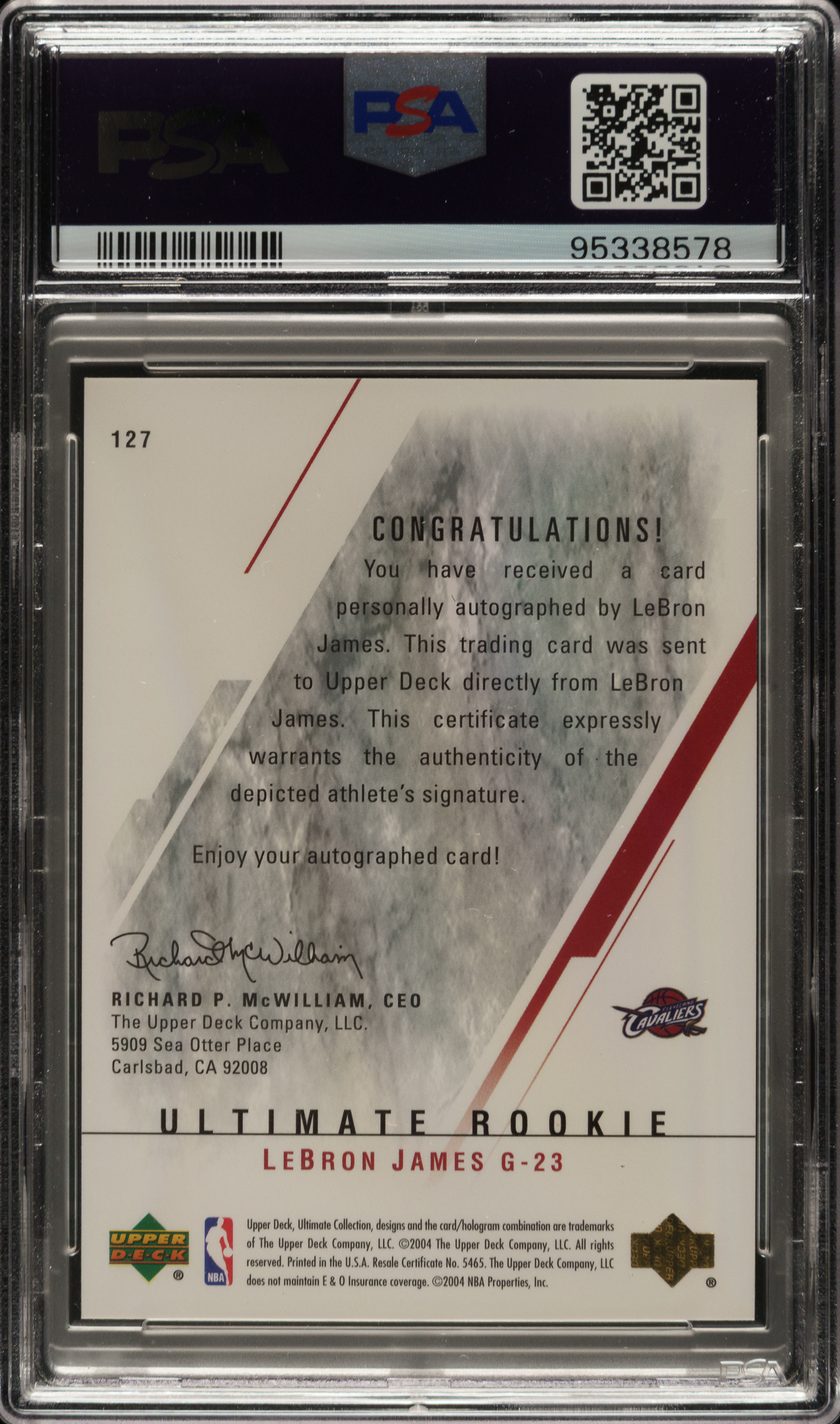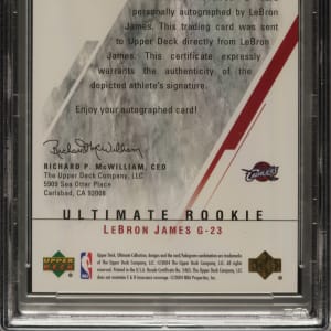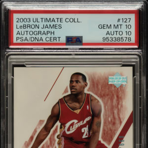 Graded GEM MINT 10 by PSA with a GEM MINT 10 signature. Superb ultra high-grade example of LeBron James' rookie card from the 2003-2004 Upper Deck Ultimate Collection Basketball Autographs series. One of the most dominant forces the game has ever seen, this card has emerged in recent years as one of James' most desirable and valuable rookie cards. This example is a gem! Brilliant colors, crisp image, four sharp corners, perfect centering, and a flawless surface featuring a perfectly executed autograph. This is a stunning example of this future Hall of Famer's rookie card in unparalleled high grade!