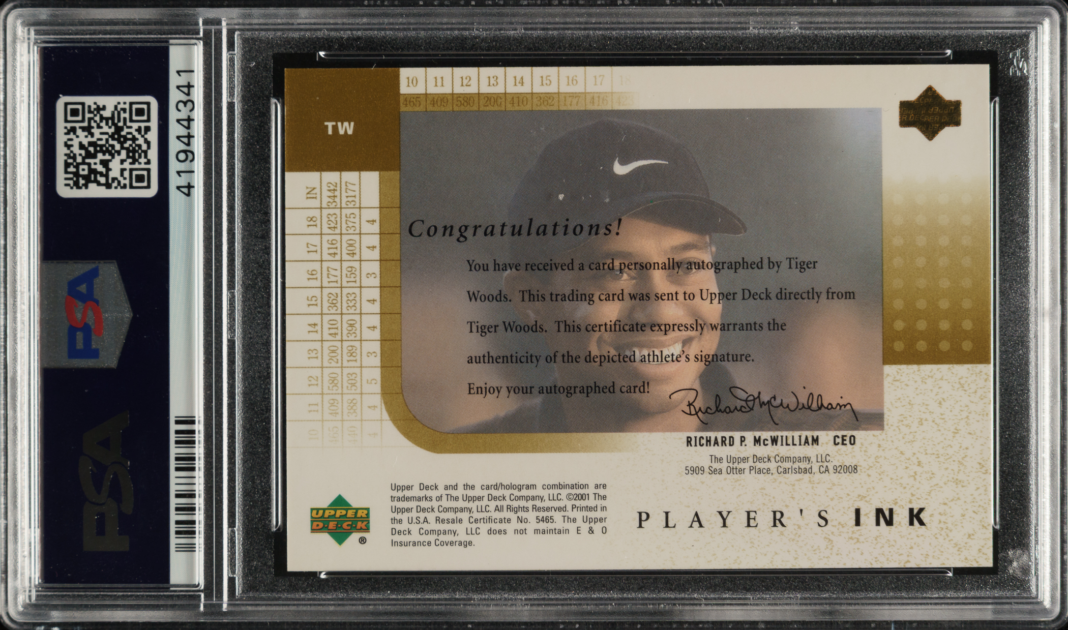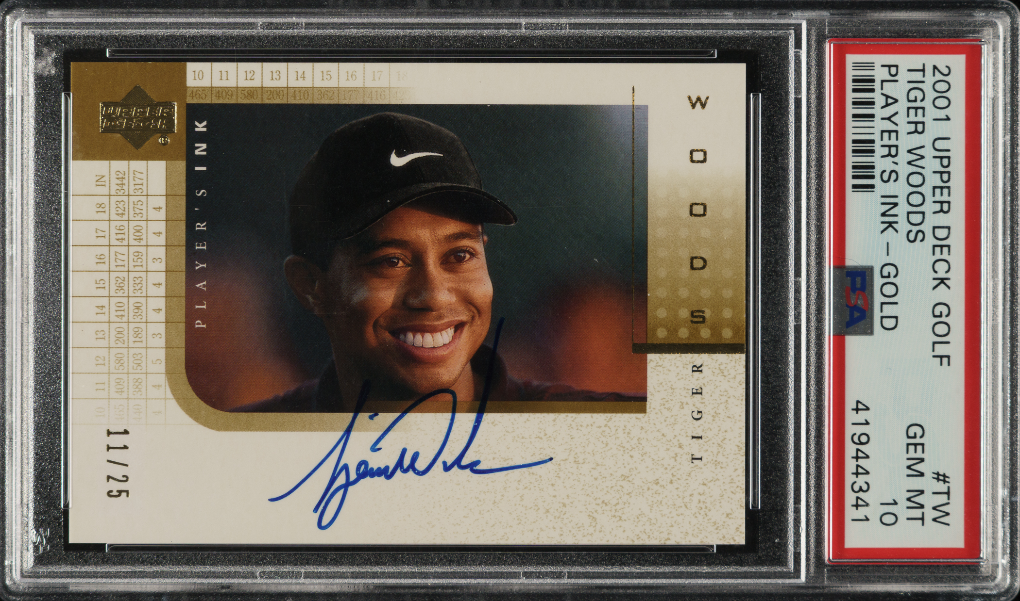 Graded GEM MINT 10 by PSA. Presented is one of modern-card collecting's most recognizable trading cards and one of legendary golfer Tiger Woods' most important rookie cards: 2001 Upper Deck Golf Player's Ink Autographs limited-edition gold parallel. The offered example is graded GEM MINT 10 and bears a bold signature across the front. In an era when players often grace the fronts of rookie cards from multiple card manufacturers, Tiger's 2001 Upper Deck golf issues have drawn serious interest from collectors over the years and risen to the top of the list of the most desirable Tiger Woods rookie cards. The offered example boasts a perfect surface and sharp corners. It is numbered 11/25 on the front. This is a spectacular example of one of Tiger Woods' rarest and most desirable autographed rookie cards!