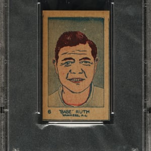 Graded MINT 9 by PSA. One of only two examples graded at this level by PSA with none higher! Stunning ultra-high-grade example of #6 Babe Ruth from the 1926 W512 strip-card series. Originally issued in strips, these cards (and almost all strip-cards) are often found with irregular borders as they were cut by hand from the strips, as intended. Only ideally cut examples (like this one) are awarded numerical grades by grading companies. The offered card is exceptional in every way, with bright colors, a crisp image, and four sharp corners. The blank back is clean. This is a superb example of one of Babe Ruth's most classic 1920s strip-cards and one that would be a significant addition to any Ruth, strip-card, or prewar-card collection.