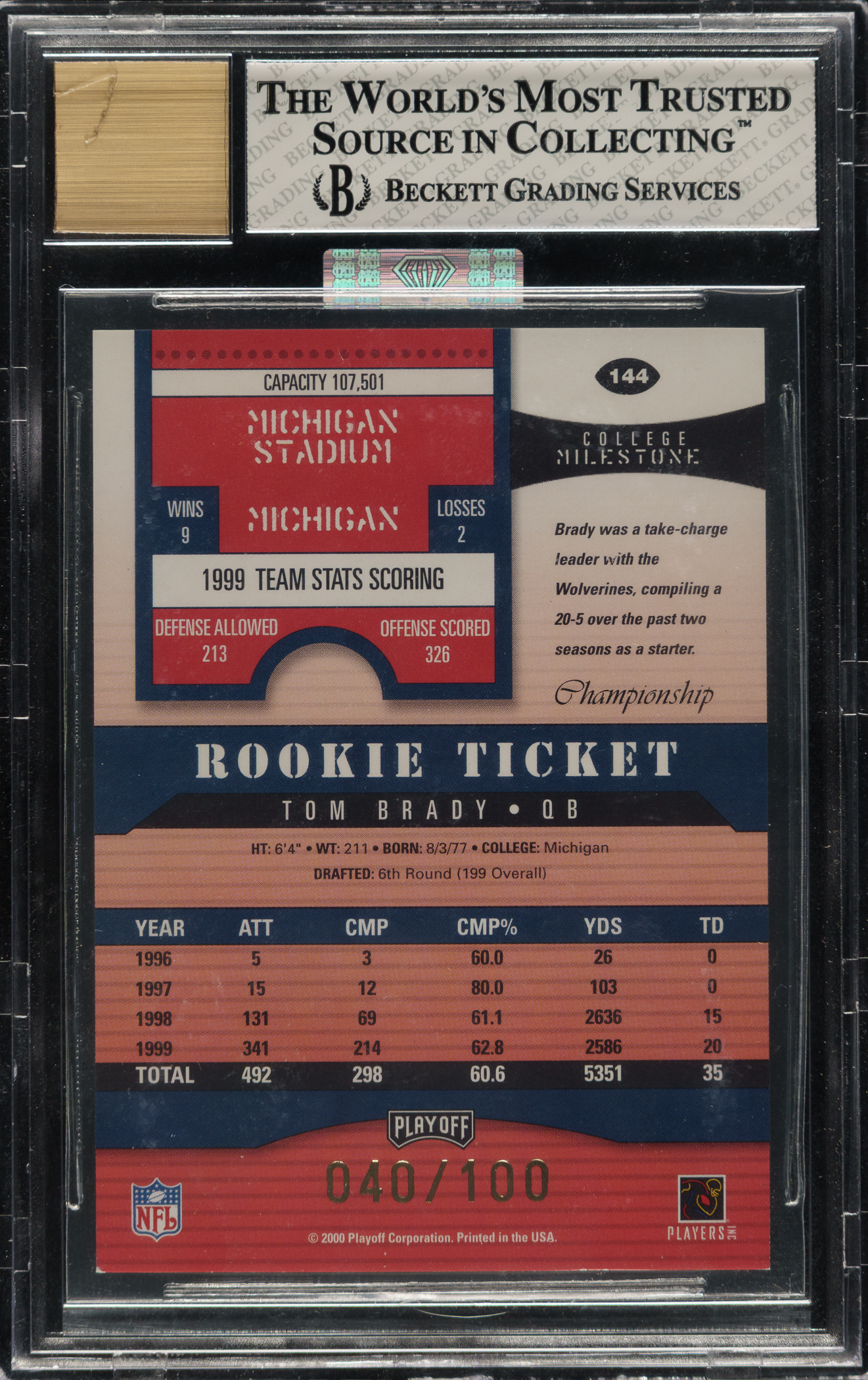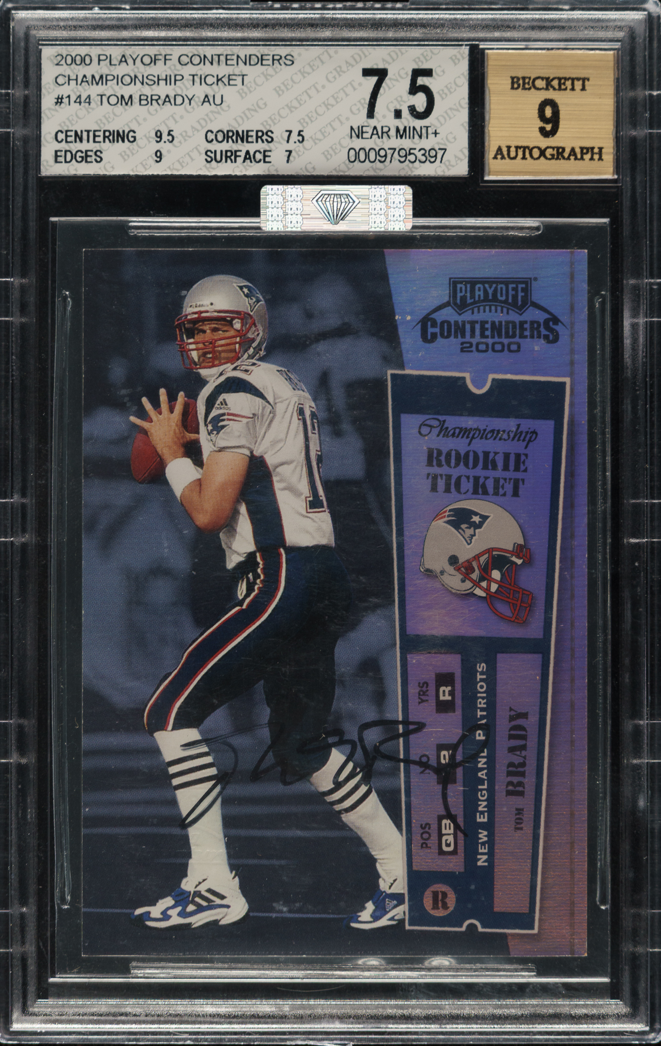 Graded NM+ 7.5 by BGS with a MINT 9 signature. Presented is one of modern-card collecting's most significant trading cards and one of future Hall of Fame quarterback Tom Brady's most important rookie cards: a 2000 Playoff Contenders Rookie Championship Ticket Autograph limited to just 100 examples. The offered example bears a bold black signature across the front. In an era during which players often grace the fronts of rookie cards from multiple card manufacturers, Brady's limited Championship Ticket rookie (and the related, more available Playoff Contenders Rookie Ticket example) have drawn serious interest from collectors over the years and risen to the top of the list of the most desirable Tom Brady rookie cards. The offered example boasts flawless colors and light touches of wear on the square corners. It has been designated an MBA Silver Diamond example for its exceptional eye appeal for the assigned grade. This remains a superb high-grade example worthy of even the most advanced Tom Brady or modern football-card collection.