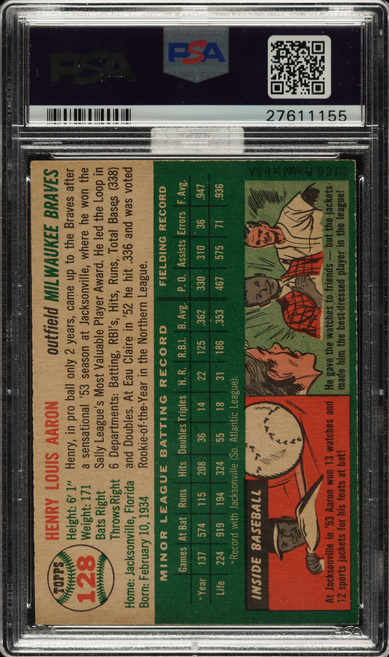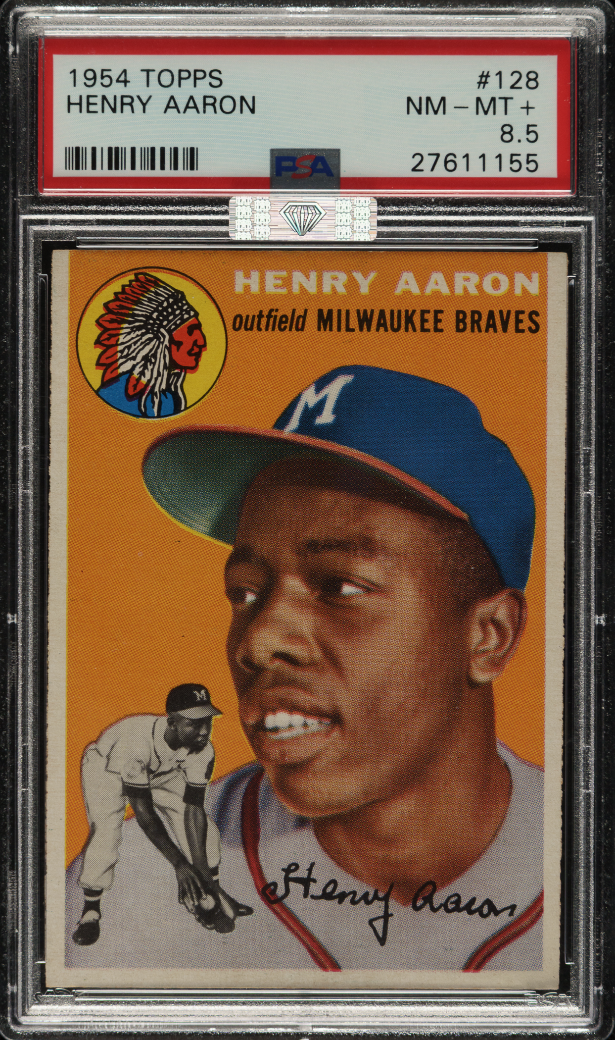 Graded NM-MT+ 8.5 by PSA. Spectacular high-grade rookie card of Hall of Famer Hank Aaron from the classic 1954 Topps series. Hank Aaron's rookie card is one of the most famous and iconic cards in all of collecting and is naturally a favorite of many collectors, but is rarely found in this superb high grade. This card boasts brilliant colors, a crisp image, strong corners, and outstanding centering. Clean and boldly printed reverse. It has been designated an MBA Silver Diamond example for its exceptional eye appeal for the assigned grade. Aaron is one of the key cards to the 1954 Topps set and is one of four Hall of Fame rookies making their Topps debut that year (Banks, Kaline, and Lasorda are the other three). This is a stunning example of Hank Aaron’s rookie card and would be a worthy addition to any world-class Hank Aaron, Hall of Fame rookie, or classic-card collection.
