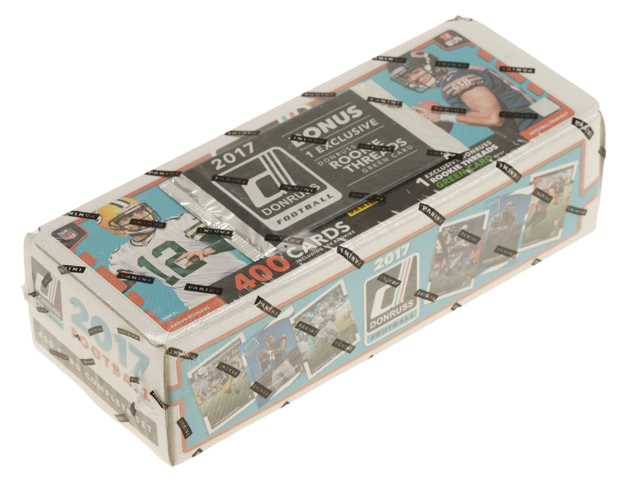 Factory-sealed set of 2017 Donruss football. The set, which contains 400 cards, is highlighted by Patrick Mahomes' rookie card. The set comes with a bonus pack. The size/weight of this item requires that there will be an additional shipping charge for this lot.