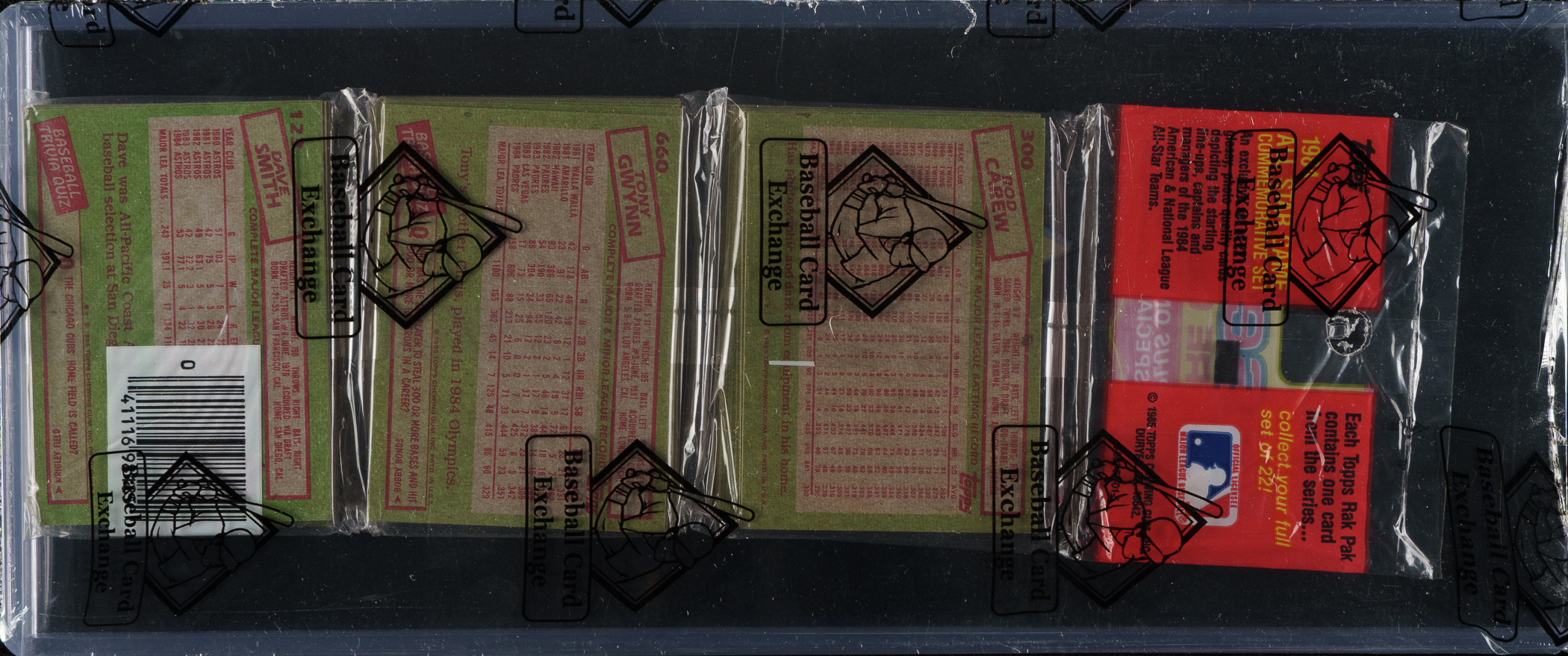 The entire rack pack comes shrink-wrapped by Baseball Card Exchange (owned by Steve Hart, the foremost expert on unopened material). Oakland Athletics, San Diego Padres and California Angels Hall of Famers Joe Morgan, Tony Gwynn and Rod Carew.