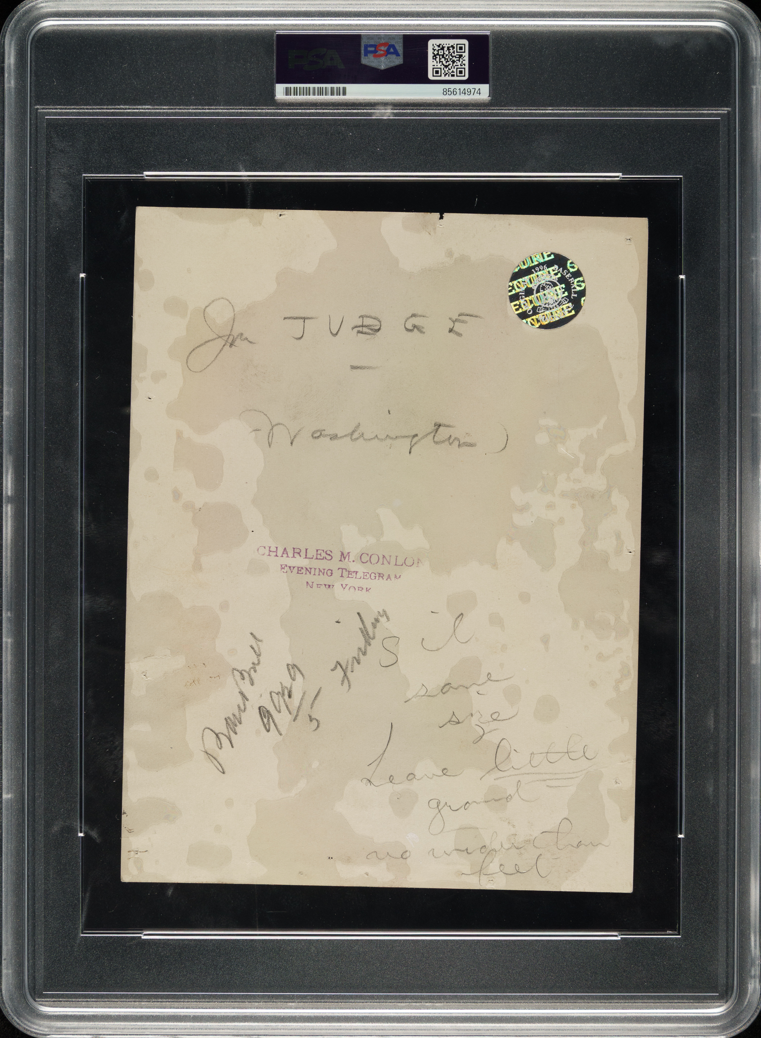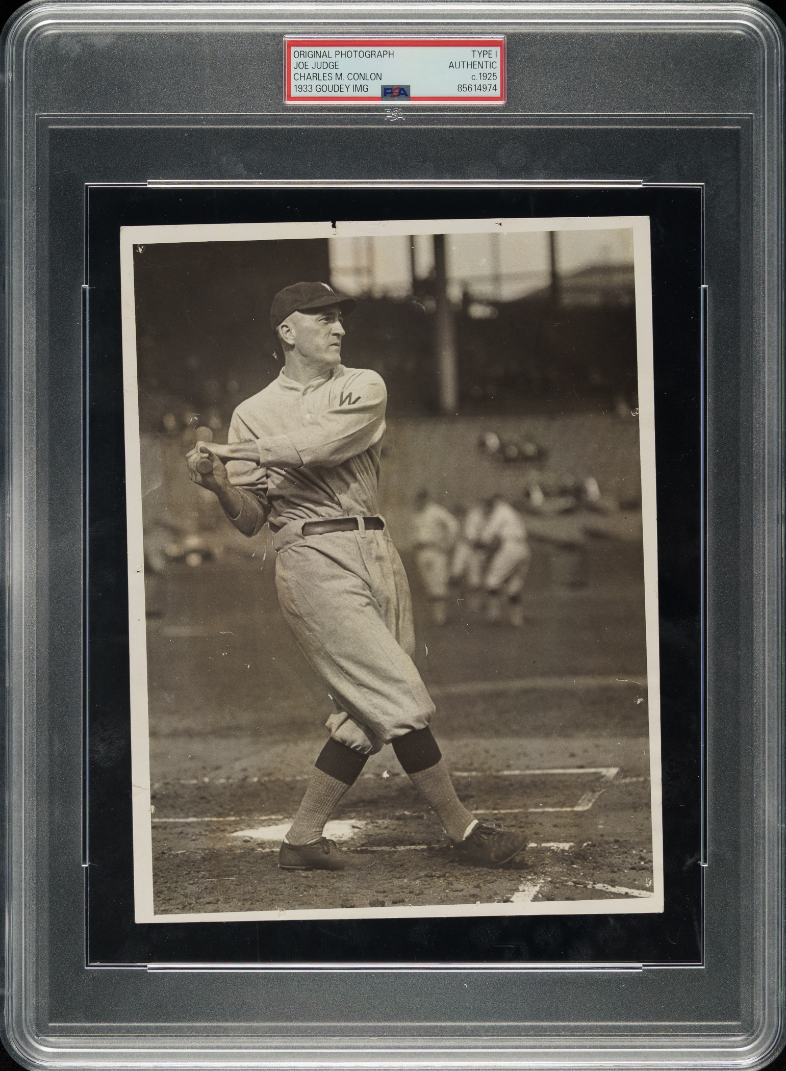Original photo of Washington Senators first baseman Joe Judge, taken by renowned baseball photographer Charles Conlon, used in the production of Judge's 1933 R319 Goudey card. Encapsulated and certified as an original Type I Charles Conlon photograph by PSA/DNA. The photo captures Judge at the plate in a swing-through pose. Conlon's credit stamp appears on the reverse, along with his handwritten notation "Joe Judge - Washington," and a number of editorial markings. This photo was originally obtained at the sale of the Baseball Magazine archives at Christie's in 1996 and bears the special hologram label from that sale on the reverse. Photos used in the production of trading cards have become increasingly popular in recent years. This is one of only a small number of vintage photos we have seen featuring a player image attributed to the 1933 R319 Goudey card set. The photo (6.5 x 8.5 inches) displays a number of pinholes along the borders, and is otherwise in Excellent condition overall.
