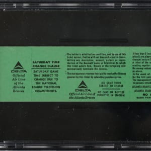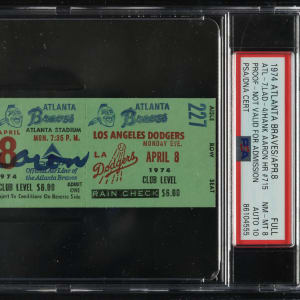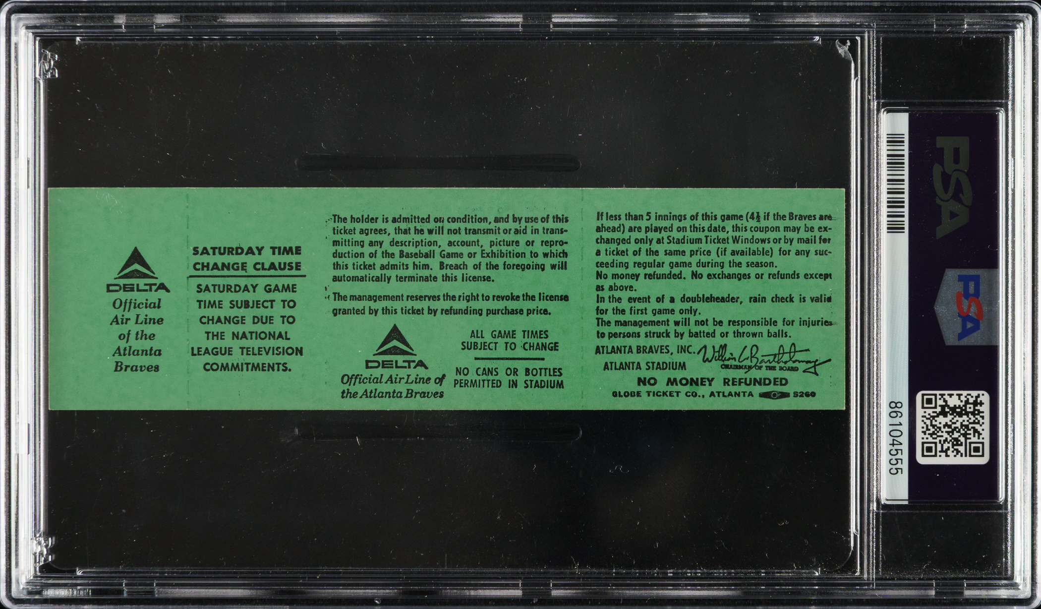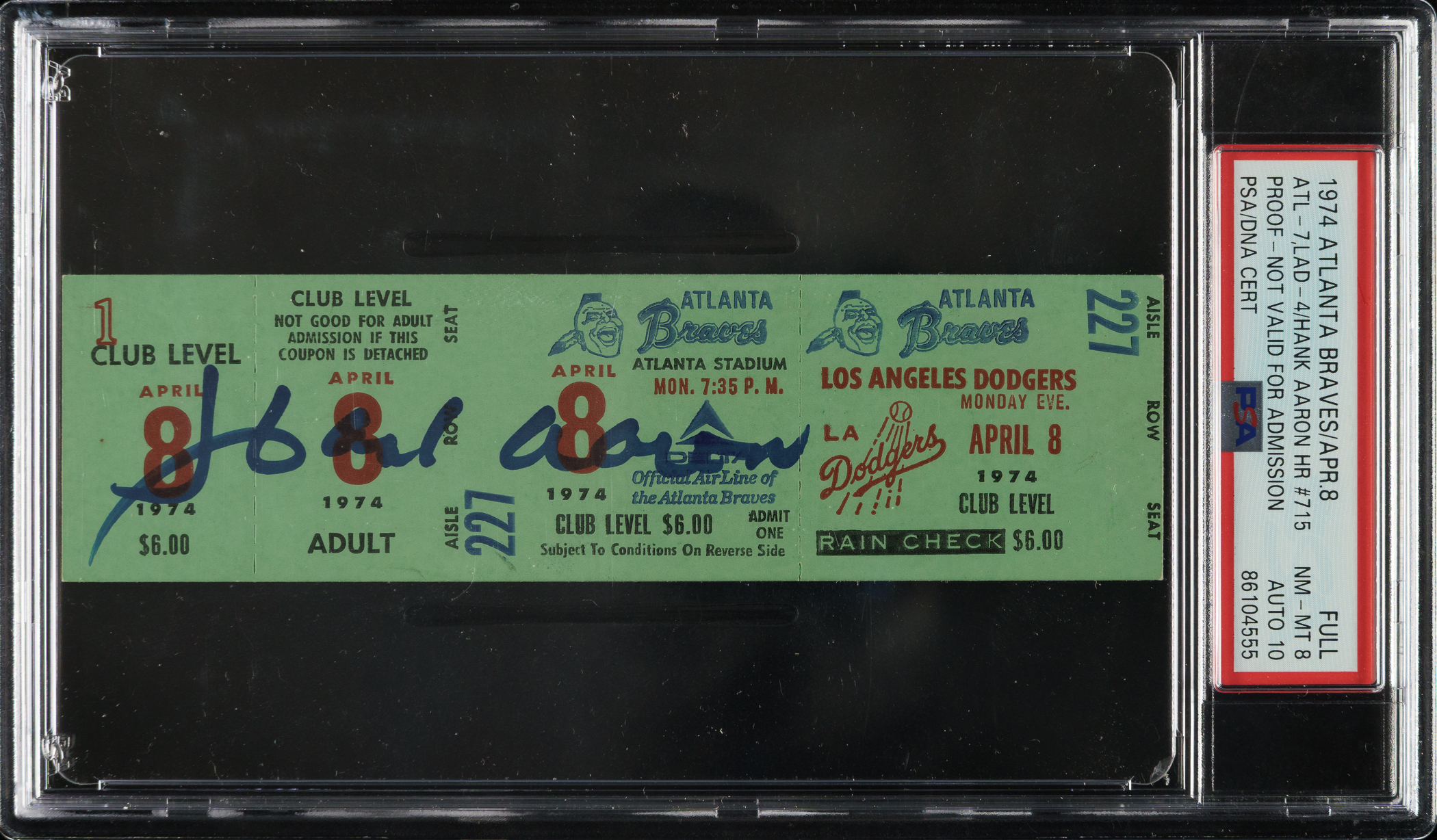 Atlanta Braves full "proof ticket (not valid for admission) for a game against the Los Angeles Dodgers on April 8, 1974, in which Hank Aaron hit his then-record-setting 715th career home run to pass Babe Ruth on the all-time list. Signed by Aaron on the front in blue marker. PSA/DNA has encapsulated the ticket, grading the signature GEM MINT 10 and the ticket NM-MT 8 by PSA. This is one of only two tickets graded at this level by PSA/DNA, with just one higher.